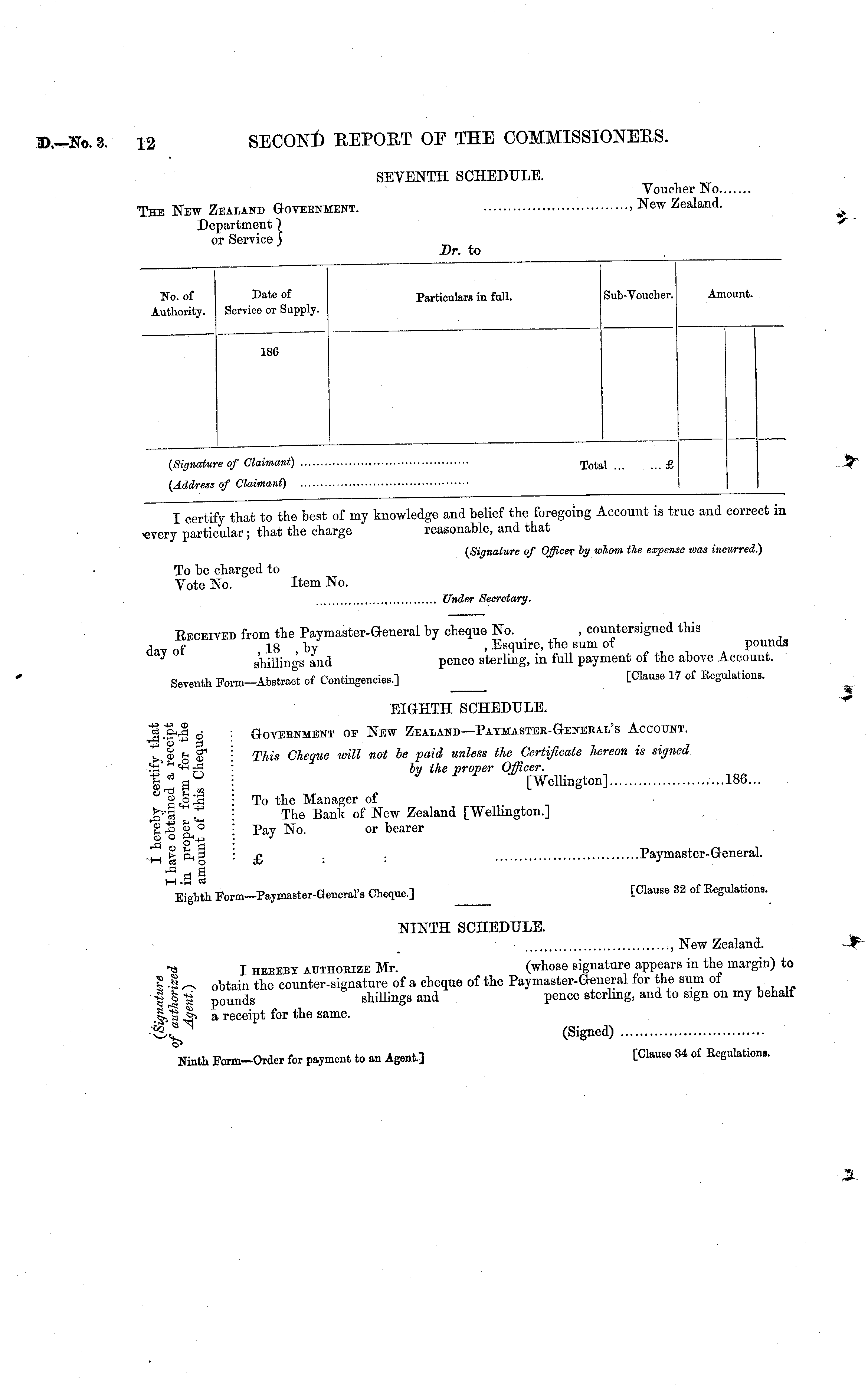 SEVENTH SCHEDULE. Voucher No The New Zealand Goveenment. , New Zealand. Department") or Service j Dr. to No. of Date of Particulars in full. Sub-Voucher. Amount. Authority. Service or Supply. 186 {Signature of Claimant) Total £ (Address of Claimant) I certify that to the best of my knowledge and belief the foregoing Account is true and correct in ■every particular ; that the charge reasonable, and that (Signature of Officer oy whom the expense was incurred.) To be charged to Vote No. Item No. Under Secretary. Received from the Paymaster-General by cheque No. , countersigned this , « 18 w , Esquire, tho sum of pounds y shillings and pence sterling, in full payment of the above Account. Seventh Form-Abstract of Contingencies.] [Clause 17 of Regulations. EIGHTH SCHEDULE. Jl_J_ © : Goveenment of New Zealand— Paymastek-Geneeal's Account. "!_,» [_ o : This Cheque will not be paid unless the Certificate hereon is signed S : by the proper Officer. : [Wellington] 186... ° : To the Manager of £-3 __ £ : The Bank of New Zealand [Wellington.] £|»° : Pay No. or bearer M > • £ . Paymaster-General. i a I Form-Paymaster-General's Cheque.] [Clause 32 of Regulations. NINTH SCHEDULE. , New Zealand. "* I heeeby authoeize Mr. (whose signature appears in the margin) to 11 ,-v obtain the counter-signature of a cheque of the Paymaster-General for the sum of : ||"§ pounds shillings and pence sterling, and to sign on my behalf &> sJp a receipt for the same. ■&«_/ (Signed) °Ninth Form-Order for payment to an Agent.] [Clause 34 of Regulations.
