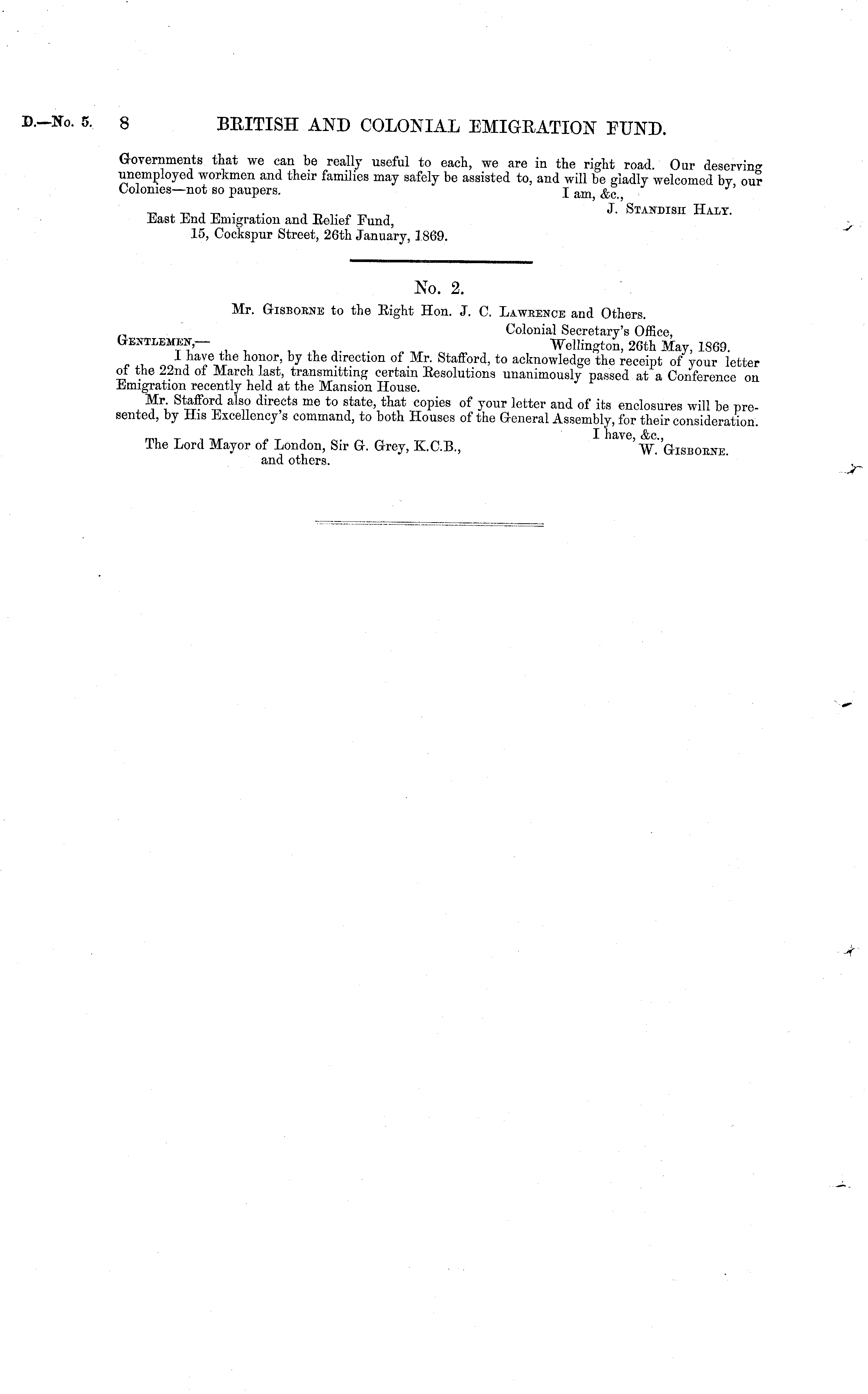 No. 2. Mr. Gisboene to the Eight Hon. J. C. Lawrence and Others. Colonial Secretary's Office, Geotiemen,— Wellington, 26th May, 1869. I have the honor, by the direction of Mr. Stafford, to acknowledge the receipt of your letter of the 22nd of March last, transmitting certain Eesolutions unanimously passed at a Conference on Emigration recently held at the Mansion House. Mr. Stafford also directs me to state, that copies of your letter and of its enclosures will be presented, by His Excellency's command, to both Houses of the General Assembly, for their consideration. The Lord Mayor of London, Sir G. Grey, X.C.8., ~* Y °' wTgisbobne and others.