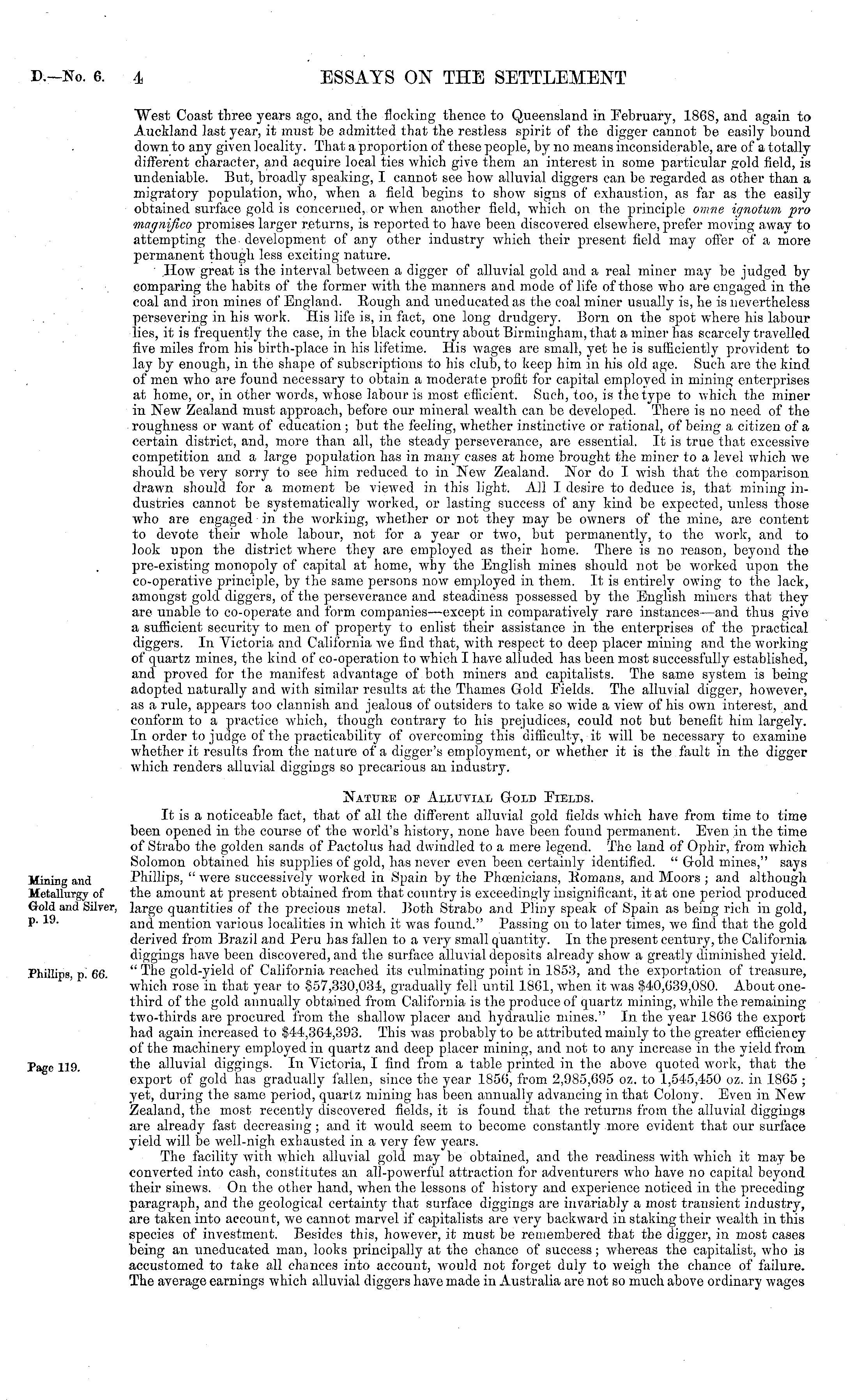 West Coast three years ago, and the flocking thence to Queensland in February, 18G8, and again to Auckland last year, it must be admitted that the restless spirit of the digger cannot be easily bound down to any given locality. That a proportion of these people, by no means inconsiderable, are of a totally different character, and acquire local ties which give them an interest in some particular gold field, is undeniable. But, broadly speaking, I cannot see how alluvial diggers can be regarded as other than a migratory population, who, when a field begins to show signs of exhaustion, as far as the easily obtained surface gold is concerned, or when another field, which on the principle omne ignotum pro magnifico promises larger returns, is reported to have been discovered elsewhere, prefer moving away to attempting the development of any other industry which their present field may offer of a more permanent though less exciting nature. How great is the interval between a digger of alluvial gold and a real miner may be judged by comparing the habits of the former with, the manners and mode of life of those who are engaged in the coal and iron mines of England. Bough and uneducated as the coal miner usually is, he is nevertheless persevering in his work. His life is, in fact, one long drudgery. Born on the spot where his labour lies, it is frequently the case, in the black country about Birmingham, that a miner has scarcely travelled five miles from his birth-place in his lifetime. His wages are small, yet he is sufficiently provident to lay by enough, in the shape of subscriptions to his club, to keep him in his old ago. Such are the kind of men who are found necessary to obtain a moderate profit for capital employed, in mining enterprises at home, or, in other words, whose labour is most efficient. Such, too, is the type to which the miner in New Zealand must approach, before our mineral wealth can be developed. There is no need of the roughness or want of education ; but the feeling, whether instinctive or rational, of being a citizen of a certain district, and, more than all, the steady perseverance, are essential. It is true that excessive competition and a large population has in many cases at home brought the miner to a level which we should be very sorry to see him reduced to in Now Zealand. Nor do I wish that the comparison drawn should for a moment be viewed in this light. All I desire to deduce is, that mining industries cannot be systematically worked, or lasting success of any kind be expected, unless those who are engaged ■in the working, whether or not they may be owners of the mine, are content to devote their whole labour, not for a year or two, but permanently, to the work, and to look upon the district where they are employed as their home. There is no reason, beyond the pre-existing monopoly of capital at home, why the English mines should not be worked upon the co-operative principle, by the same persons now employed in them. It is entirely owing to the lack, amongst gold diggers, of the perseverance and steadiness possessed by the English miners that they are unable to co-operate and form companies—except in comparatively rare instances —and thus give a sufficient security to men of property to enlist their assistance in the enterprises of the practical diggers. In Victoria and California we find that, with respect to deep placer mining and the working of quartz mines, the kind of co-operation to which I have alluded has been most successfully established, and proved for the manifest advantage of both miners and capitalists. The same system is being adopted naturally and with similar results at the Thames Gold Fields. The alluvial digger, however, as a rule, appears too clannish and jealous of outsiders to take so wide a view of his own interest, and conform to a practice which, though contrary to his prejudices, could not but benefit him largely. In order to judge of the practicability of overcoming this difficulty, it will be necessary to examine whether it results from the nature of a digger's employment, or whether it is the fault in the digger which renders alluvial diggings so precarious an industry. Natukb op Alluvial Gold Fields. It is a noticeable fact, that of all the different alluvial gold fields which have from time to time been opened in the course of the world's history, none have been found permanent. Even in the time of Strabo the golden sands of Pactolus had dwindled to a mere legend. The land of Ophir, from which Solomon obtained his supplies of gold, has never even been certainly identified. " Gold mines," says Phillips, " were successively worked in Spain by the Phoenicians, Komans, and Moors ; and although the amount at present obtained from that country is exceedingly insignificant, it at one period produced large quantities of the precious metal. Both Strabo and Pliny speak of Spain as being rich in gold, and mention various localities in which it was found." Passing on to later times, we find that the gold derived from Brazil and Peru has fallen to a very small quantity. In the present century, the California diggings have been discovered, and the surface alluvial deposits already show a greatly diminished yield. " The gold-yield of California reached its culminating point in 1853, and the exportation of treasure, which rose in that year to §57,330,031, gradually fell until 1861, when it was §40,639,080. About onethird of the gold annually obtained from California is the produce of quartz mining, while the remaining two-thirds are procured from the shallow placer and hydraulic mines." In the year 18GG the export had again increased to §44,364,393. This was probably to be attributed mainly to the greater efficiency of the machinery employed in quartz and deep placer mining, and not to any increase in the yield from the alluvial diggings. In Victoria, I find from a table printed in the above quoted work, that the export of gold has gradu
