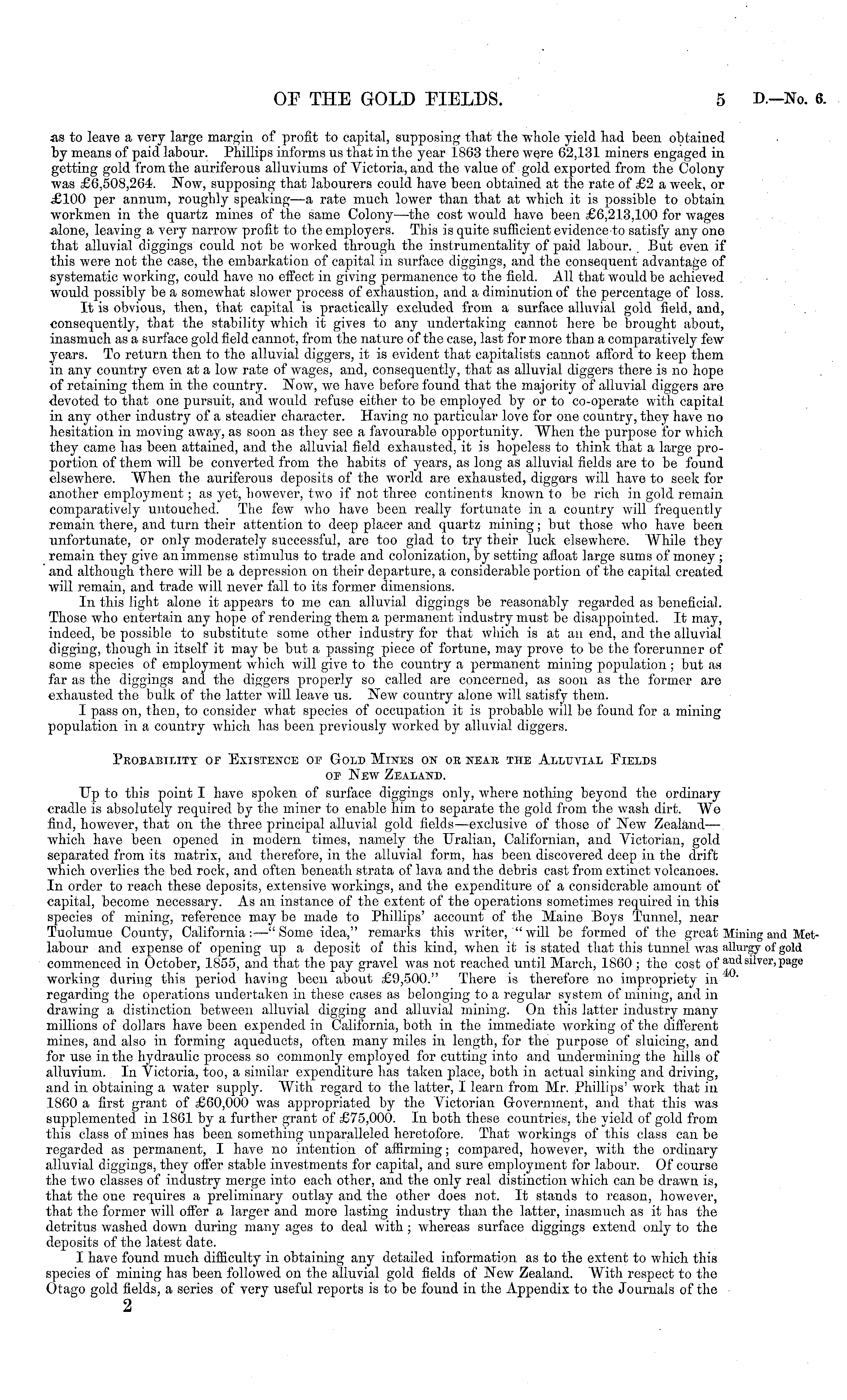 as to leave a very large margin of profit to capital, supposing that the whole yield had been, obtained by means of paid labour. Phillips informs us that in the year 1863 there were 62,131 miners engaged in getting gold from the auriferous alluviums of Victoria, and the value of gold exported from the Colony was £6,508,204. Now, supposing that labourers could have been obtained at the rate of £2 a week, or £100 per annum, roughly speaking —a rate much lower than that at which it is possible to obtain workmen in the quartz mines of the same Colony—the cost would have been £6,213,100 for wages alone, leaving a very narrow profit to the employers. This is quite sufficient evidence-to satisfy any one that alluvial diggings could not be worked through the instrumentality of paid labour. But even if this were not the case, the embarkation of capital in surface diggings, and the consequent advantage of systematic working, could have no effect in giving permanence to the field. All that would be achieved would possibly be a somewhat slower process of exhaustion, and a diminution of the percentage of loss. It is obvious, then, that capital is practically excluded from a surface alluvial gold field, and, consequently, that the stability which it gives to any undertaking cannot here be brought about, inasmuch as a surface gold field cannot, from the nature of the case, last for more than a comparatively few years. To return then to the alluvial diggers, it is evident that capitalists cannot afford to keep them in any country even at a low rate of wages, and, consequently, that as alluvial diggers there is no hope of retaining them in the country. Now, we have before found that the majority of alluvial diggers are devoted to that one pursuit, and would refuse either to be employed by or to co-operate with capital in any other industry of a steadier character. Having no particular love for one country, they have no hesitation in moving away, as soon as they see a favourable opportunity. When the purpose for which they came has been attained, and the alluvial field exhausted, it is hopeless to think that a large proportion of them will be converted from the habits of years, as long as alluvial fields are to be found elsewhere. When the auriferous deposits of the world are exhausted, diggers will have to seek for another employment; as yet, however, two if not three continents known to be rich in gold remain comparatively untouched. The few who have been really fortunate in a country will frequently remain there, and turn their attention to deep placer and quartz mining; but those who have been unfortunate, or only moderately successful, are too glad to try their luck elsewhere. While they remain they give an immense stimulus to trade and colonization, by setting afloat large sums of money ; and although there will be a depression on their departure, a considerable portion of the capital created will remain, and trade will never fall to its former dimensions. In this light alone it appears to me can alluvial diggings be reasonably regarded as beneficial. Those who entertain any hope of rendering them a permanent industry must be disappointed. It may, indeed, be possible to substitute some other industry for that which is at an end., and the alluvial digging, though in itself it may be but a passing piece of fortune, may prove to be the forerunner of some species of employment which will give to the country a permanent mining population ; but as far as the diggings and the diggers properly so called are concerned, as soon as the former are exhausted the bulk of the latter will leave us. New country alone will satisfy them. I pass on, then, to consider what species of occupation it is probable will be found for a mining population in a country which has been previously worked by alluvial diggers. Probability of Existence of Gold Mikes on oe neae the Alluvial Eields of New Zealand. Up to this point I have spoken of surface diggings only, where nothing beyond the ordinary cradle is absolutely required by the miner to enable him to separate the gold from the wash dirt. Wo find, however, that on the three principal alluvial gold fields —exclusive of those of New Zealand — which have been opened in modern times, namely the Uralian, Californian, and Victorian, golc separated from its matrix, and therefore, in the alluvial form, has been discovered deep in the drift which overlies the bed rock, and often beneath strata of lava and the debris cast from extinct volcanoes. In order to reach these deposits, extensive workings, and the expenditure of a considerable amount of capital, become necessary. As an instance of the extent of the operations sometimes required in this species of mining, reference may be made to Phillips' account of the Maine Boys Tunnel, near Tuolumue County, California: —"Some idea," remarks this writer, " will be formed of the great labour and expense of opening up a deposit of this kind, when it is stated that this tunnel was commenced in October, 1855, and that the pay gravel was not reached until March, 1860 ; the cost of working during this period having been about £9,500." There is therefore no impropriety in regarding the operations undertaken in these cases as belonging to a regular system of mining, and in drawing a distinction between alluvial digging and alluvial mining. On this latter industry many millions of dollars have been expended in California, both in the immediate working of the different mines, and also in forming aqueducts, often many miles in length, for the purpose of sluicing, and for use in the hydraulic process so commonly employed for cutting into and undermining the hills of alluvium. In Victoria, too, a similar expenditure has taken place, both in actual sinking and driving, and in obtaining a water supply. With regard to the latter, I learn from Mr. Philips' work that in 1860 a first grant of £60,000 was appropriated by the Victorian Government,