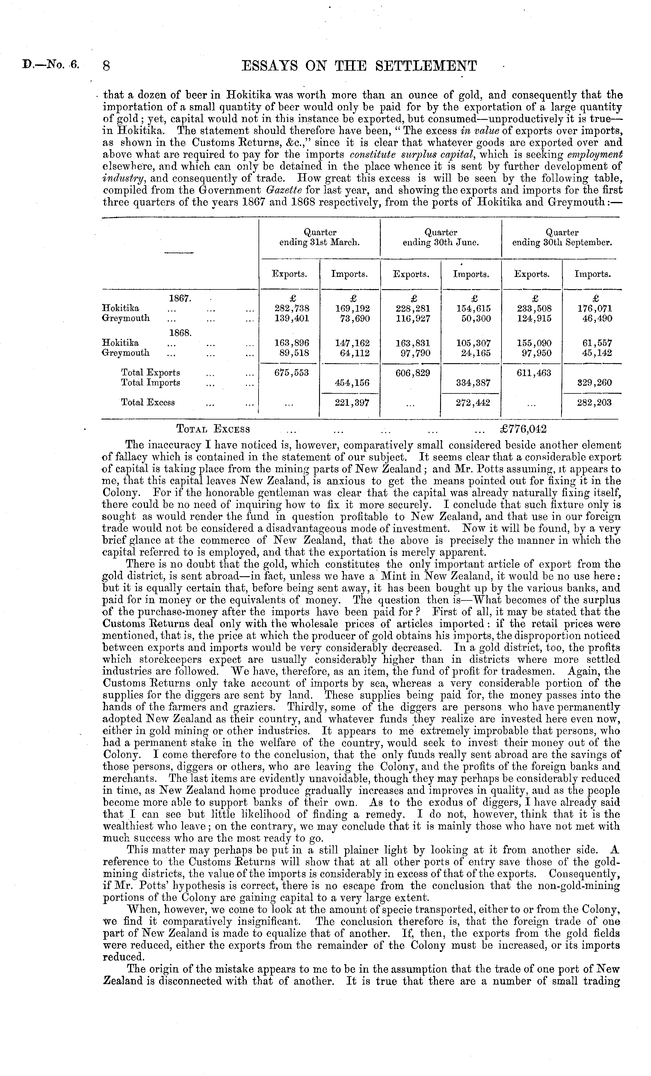 Total Excess ... ... ... ... ... £776,042 The inaccuracy I have noticed is, however, comparatively small considered beside another element of fallacy which is contained in the statement of our subject. It seems clear that a considerable export of capital is taking place from the mining parts of New Zealand; and Mr. Potts assuming, it appears to me, that this capital leaves New Zealand, is anxious to get the means pointed out for fixing it in the Colony. For if the honorable gentleman was clear that the capital was already naturally fixing itself, there could be no need of inquiring how to fix it more securely. I conclude that such fixture only is sought as would render the fund in question profitable to New Zealand, and that use in our foreign trade would not be considered a disadvantageous mode of investment. Now it will be found, by a very brief glance at the commerce of Now Zealand, that the above is precisely the manner in which the capital referred to is employed, and that the exportation is merely apparent. There is no doubt that the gold, which constitutes the only important article of export from the gold district, is sent abroad —in fact, unless we have a Mint in New Zealand, it would be no use here: but it is equally certain that, before being sent away, it has been bought up by the various banks, and paid for in money or the equivalents of money. The question then is—What becomes of the surplus of the purchase-money after the imports have been paid for ? First of all, it may be stated that the Customs Returns deal only with the wholesale prices of articles imported : if the retail prices were mentioned, that is, the price at which the producer of gold obtains his imports, the disproportion noticed between exports and imports would be very considerably decreased. In a gold district, too, the profits which storekeepers expect are usually considerably higher than in districts where more settled industries are followed. Wo have, therefore, as an item, the fund of profit for tradesmen. Again, the Customs Eeturns only take account of imports by sea, whereas a very considerable portion of the supplies for the diggers are sent by land. These supplies being paid for, the money passes into the hands of the farmers and graziers. Thirdly, some of the diggers are persons who have permanently adopted New Zealand as their country, and whatever funds they realize are invested here even now, either in gold mining or other industries. It appears to me extremely improbable that persons, who had a permanent stake in the welfare of the country, would seek to invest their money out of the Colony. I come therefore to the conclusion, that the only funds really sent abroad are the savings of those persons, diggers or others, who are leaving the Colony, and the profits of the foreign banks and merchants. The last items are evidently unavoidable, though they may perhaps be considerably reduced in time, as New Zealand home produce gradually increases and improves in quality, and as the people become more able to support banks of their own. As to the exodus of diggers, I have already said that I can see but little likelihood of finding a remedy. I do not, however, think that it is the wealthiest who leave; on the contrary, we may conclude that it is mainly those who have not met with much success who are the most ready to go. This matter may perhaps be put in a still plainer light by looking at it from another side. A reference to the Customs Eeturns will show that at all other ports of entry save those of the goldmining districts, the value of the imports is considerably in excess of that of the exports. Consequently, if Mr. Potts' hypothesis is correct, there is no escape from the conclusion that the non-gold-mining portions of the Colony are gaining capital to a very large extent. When, however, we come to look at the amount of specie transported, either to or from the Colony, we find it comparatively insignificant. The conclusion therefore is, that the foreign trade of one part of New Zealand is made to equalize that of another. If, then, the exports from the gold fields were reduced, either the exports from the remainder of the Colony must be increased, or its imports reduced. The origin of the mistake appears to me to be in the assumption that the trade of one port of New Zealand is disconnected with that of another. It is true that there are a number of small trading