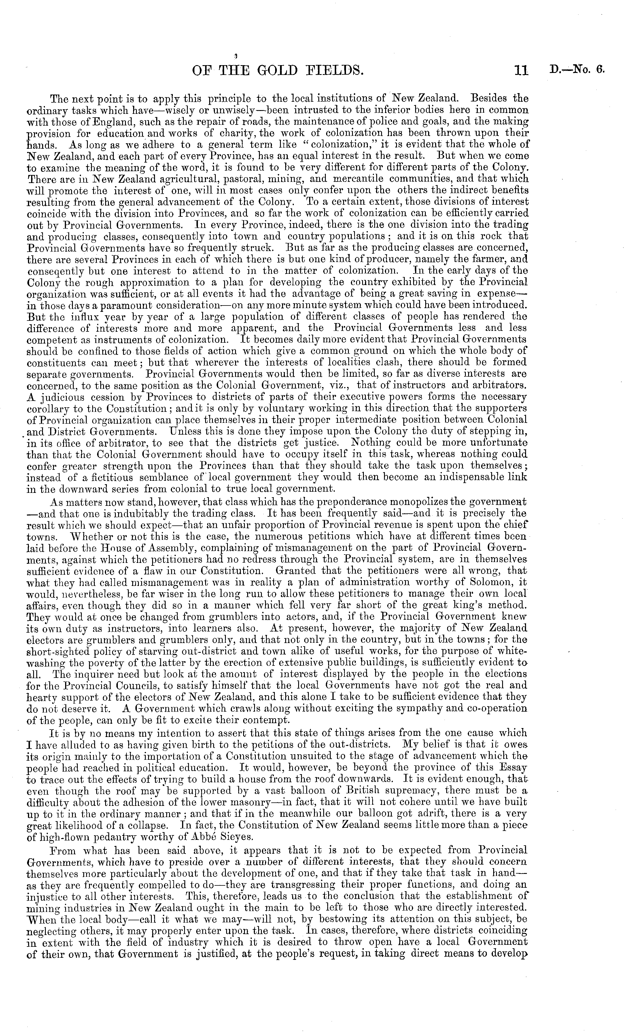 The next point is to apply this principle to the local institutions of New Zealand. Besides the ordinary tasks which hay or unwisely —been intrusted to the inferior bodies here in common with those of England, such as the repair of roads, the maintenance of police and goals, and the making provision for education and works of charity, the work of colonization has been thrown upon their hands. As long as we adhere to a general term like " colonization," it is evident that the whole of New Zealand, and each part of every Province, has an equal interest in the result. But when we come to examine the meaning of the word, it is found to be very different for different parts of the Colony. There are in New Zealand agricultural, pastoral, mining, and mercantile communities, and that which will promote the interest of one, will in most cases only confer upon the others the indirect benefits resulting from the general advancement of the Colony. To a certain extent, those divisions of interest coincide with the division into Provinces, and so far the work of colonization can be efficiently carried out by Provincial Governments. In every Province, indeed, there is the one division into the trading and producing classes, consequently into town and country populations ; and it is on this rock that Provincial Governments have so frequently struck. But as far as the producing classes are concerned, there are several Provinces in each of which there is but one kind of producer, namely the farmer, and conseqently but one interest to attend to in the matter of colonization. In the early days of the Colony the rough approximation to a plan for developing the country exhibited by the Provincial organization was sufficient, or at all events it had the advantage of being a great saving in expense — in those days a paramount consideration —on any more minute system which could have been introduced. But the influx year by year of a large population of different classes of people has rendered the difference of interests more and more apparent, and the Provincial Governments less and less competent as instruments of colonization. It becomes daily more evident that Provincial Governments should be confined to those fields of action which give a common ground on which the whole body of constituents can meet; but that wherever the interests of localities clash, there should be formed separate governments. Provincial Governments would then be limited, so far as diverse interests are concerned, to the same position as the Colonial Government, viz., that of instructors and arbitrators. A judicious cession by Provinces to districts of parts of their executive powers forms the necessary corollary to the Constitution; and it is only by voluntary working in this direction that the supporters of Provincial organization can place themselves in their proper intermediate position between Colonial and District Governments. Unless this is done they impose upon the Colony the duty of stepping in, in its office of arbitrator, to see that the districts get justice. Nothing could be more unfortunate than that the Colonial Government should have to occupy itself in this task, whereas nothing could confer greater strength upon the Provinces than that they should take the task upon themselves; instead of a fictitious semblance of local government they would then become an indispensable link in the downward series from colonial to true local government. As matters now stand, however, that class which has the preponderance monopolizes the government —and that one is indubitably the trading class. It has been frequently said—and it is precisely the result which we should expect —that an unfair proportion of Provincial revenue is spent upon the chief towns. Whether or not this is the case, the numerous petitions which have at different times been laid before the House of Assembly, complaining of mismanagement on the part of Provincial Governments, against which the petitioners had no redress through the Provincial system, are in themselves sufficient evidence of a flaw in our Constitution. Granted that the petitioners were all wrong, that what they had called mismanagement was in reality a plan of administration worthy of Solomon, it would, nevertheless, be far wiser in the long run to allow these petitioners to manage their own local affairs, even though they did so in a manner which fell very far short of the great king's method. They would at once be changed from grumblers into actors, and, if the Provincial Government knew its own duty as instructors, into learners also. At present, however, the majority of New Zealand electors are grumblers and grumblers only, and that not only in the country, but in the towns; for the short-sighted policy of starving out-district and town alike of useful works, for the purpose of whitewashing the poverty of the latter by the erection of extensive public buildings, is sufficiently evident to all. The inquirer need but look at the amount of interest displayed by the people in the elections for the Provincial Councils, to satisfy himself that the local Governments have not got the real and hearty support of the electors of New Zealand, and this alone I take to bo sufficient evidence that they do not deserve it. A Government which crawls along without exciting the sympathy and co-operation of the people, can only be fit to excite their contempt. It is by no means my intention to assert that this state of things arises from the one cause which I have alluded to as having given birth to the petitions of the out-districts. My belief is that it owes its origin mainly to the importation of a Constitution unsuited to the stage of advancement which the people had reached in political education. It would, however, be beyond, the province of this Essay to trace out the effects of trying to build a house from the roof downwards. It is evident enough, that even though the roof maybe supported by a vast 