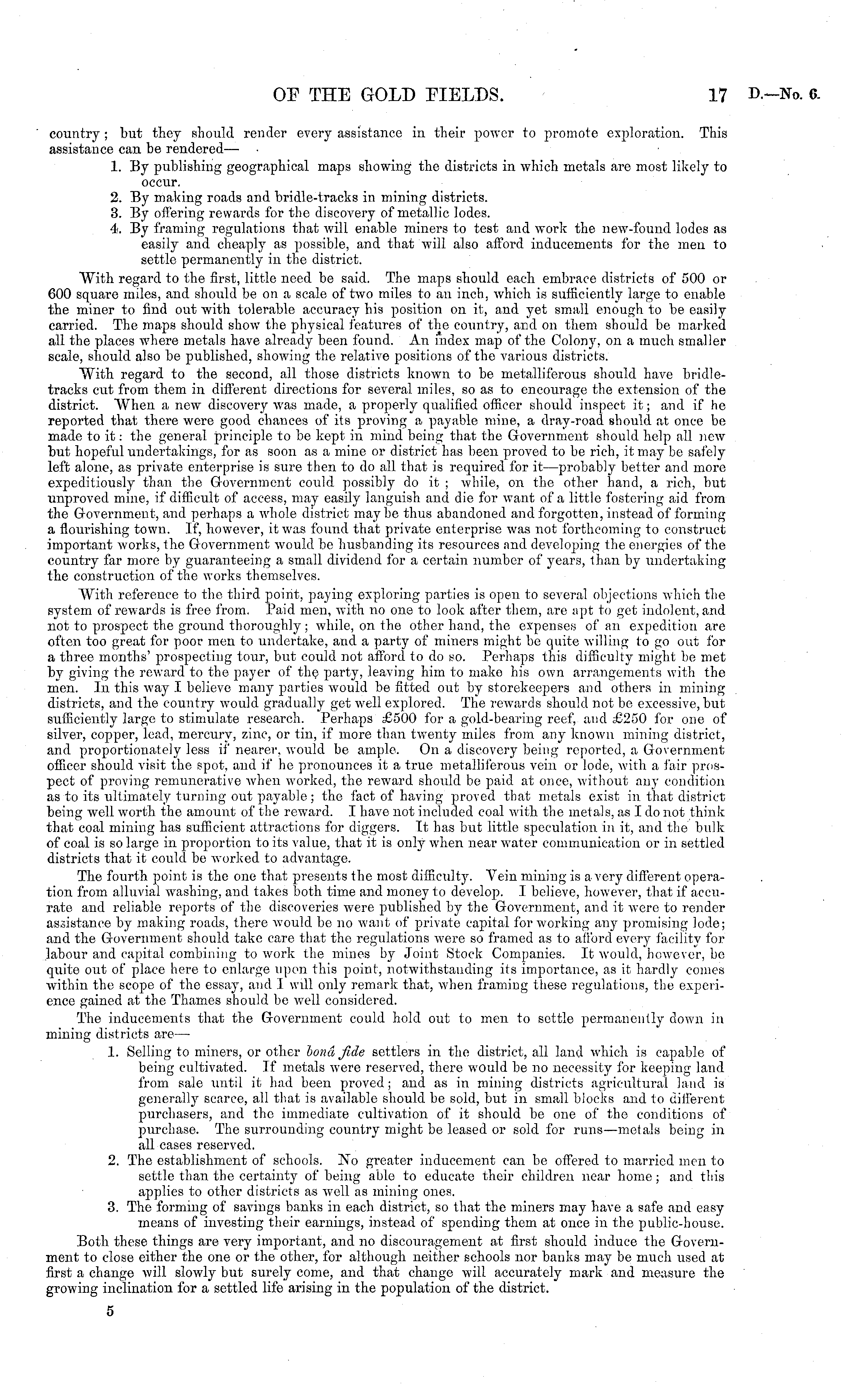 country; but they should render every assistance in their power to promote exploration. This assistance can be rendered— 1. By publishing geographical maps showing the districts in which metals are most likely to occur. 2. By making roads and bridle-tracks in mining districts. 3. By offering rewards for the discovery of metallic lodes. 4. By framing regulations that will enable miners to test and work the new-found lodes as easily and cheaply as possible, and that will also afford inducements for the men to settle permanently in the district. With regard to the first, little need be said. The maps should each embrace districts of 500 or 600 square miles, and should be on a scale of two miles to an inch, which is sufficiently large to enable the miner to find out with tolerable accuracy his position on it, and yet small enough to be easily carried. The maps should show the physical features of the country, and on them should be marked all the places where metals have already been found. An index map of the Colony, on a much smaller scale, should also be published, showing the relative positions of the various districts. With regard to the second, all those districts known to be metalliferous should have bridletracks cut from them in different directions for several miles, so as to encourage the extension of the district. When a new discovery was made, a properly qualified officer should inspect it; and if he reported that there were good chances of its proving a payable mine, a dray-road should at once be made to it: the general principle to be kept in mind being that the Government should help all new but hopeful undertakings, for as soon as a mine or district has been proved to be rich, it may be safely left alone, as private enterprise is sure then to do all that is required for it —probably better and more expeditiously than the Government could possibly do it ; while, on the other hand, a rich, but unproved mine, if difficult of access, may easily languish and die for want of a little fostering aid from the Government, and perhaps a whole district may be thus abandoned and forgotten, instead of forming a flourishing town. If, however, it was found that private enterprise was not forthcoming to construct important works, the Government would be husbanding its resources and developing the energies of the country far more by guaranteeing a small dividend for a certain number of years, Ihan by undertaking the construction of the works themselves. With reference to the third point, paying exploring parties is open to several objections which the system of rewards is free from. Paid men, with no one to look after them, are apt to get indolent, and not to prospect the ground thoroughly; while, on the other hand, the expenses of an expedition are often too great for poor men to undertake, and a party of miners might be quite willing to go out for a three months' prospecting tour, but could not afford to do so. Perhaps this difficulty might be met by giving the reward to the payer of the party, leaving him to make his own arrangements with the men. In this way I believe many parties would be fitted out by storekeepers and others in mining districts, and the country would gradually got well explored. The rewards should not be excessive, but sufficiently largo to stimulate research. Perhaps £500 for a gold-bearing reef, and £250 for one of silver, copper, lead, mercury, zinc, or tin, if more than twenty miles from any known mining district, and proportionately less if nearer, would be ample. On a discovery being reported, a Government officer should visit the spot, and if he pronounces it a true metalliferous vein or lode, with a fair prospect of proving remunerative when worked, the reward should be paid at once, without any condition as to its ultimately turning out payable; the fact of having proved that metals exist in that district being well worth the amount of the reward. I have not included coal with the metals, as Ido not think that coal mining has sufficient attractions for diggers. It has but little speculation in it, and the bulk of coal is so large in proportion to its value, that it is only when near water communication or in settled districts that it could be worked to advantage. The fourth point is the one that presents the most difficulty. Vein mining is a very different operation from alluvial washing, and takes both time and money to develop. I believe, however, that if accurate and reliable reports of the discoveries were published by the Government, and it were to render assistance by making roads, there would be no want of private capital for working any promising lode; and the Government should take care that the regulations were so framed as to afford every facility for labour and capital combining to work the mines by Joint Stock Companies. It would, however, be quite out of place here to enlarge upon this point, notwithstanding its importance, as it hardly comes within the scope of the essay, and I will only remark that, when framing these regulations, the experience gained at the Thames should be well considered. The inducements that the Government could hold out to men to settle permanently down in mining districts are — 1. Selling to miners, or other bond fide settlers in the district, all land which is capable of being cultivated. If metals were reserved, there would be no necessity for keeping land from sale until it had been proved; and as in mining districts agricultural land is generally scarce, all that is available should be sold, but in small blocks and to different purchasers, and the immediate cultivation of it should be one of the conditions of purchase. The surrounding country might be leased or sold for runs—metals being in all cases reserved. 2. The establishment of schools. No greater inducement can be offered to married men to settle than the certainty of being able to educate their children near home; and this applies to other districts as