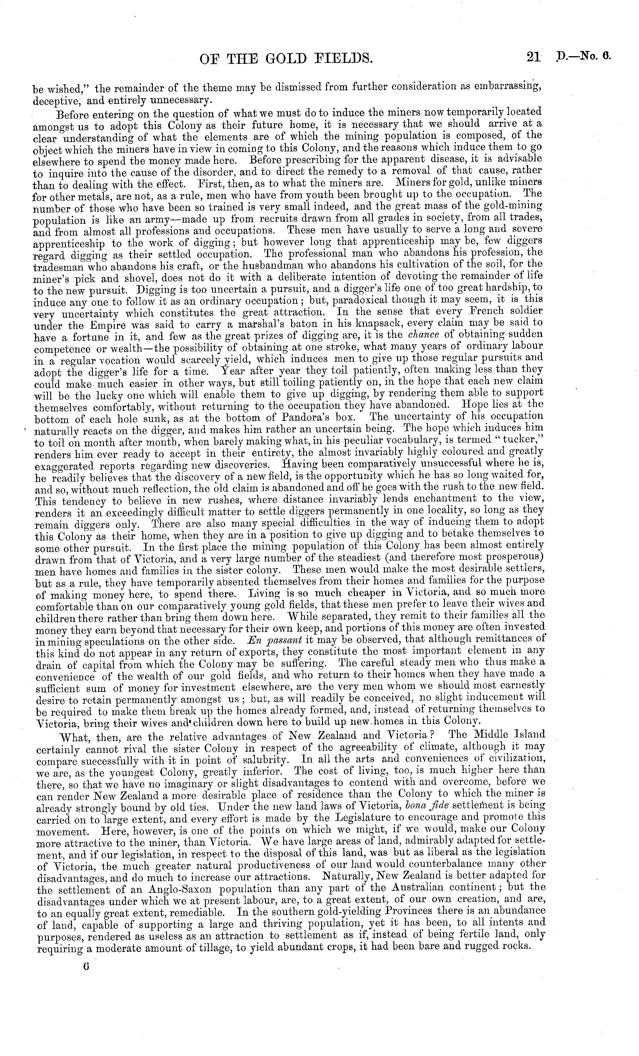 be wished," the remainder of the theme may be dismissed from further consideration as embarrassing, deceptive, and entirely unnecessary. Before entering on the question of what we must do to induce the miners now temporarily located amongst us to adopt this Colony as their future home, it is necessary that we _ should arrive at a clear understanding of what the elements are of which the mining population is composed, of the object which the miners have in view in coming to this Colony, and the reasons which induce them to go elsewhere to spend the money made here. Before prescribing for the apparent disease, it is advisable to inquire into the cause of the disorder, and to direct the remedy to a removal of that cause, rather than to dealing with the effect. First, then, as to what the miners are. Miners for gold, unlike miners for other metals, are not, as a rule, men who have from youth been brought up to the occupation. _ The number of those who have been so trained is very small indeed, and the great mass of the gold-mining population is like an army —made up from recruits drawn from all grades in society, from all trades, and from almost all professions and occupations. These men have usually to serve a long and severe apprenticeship to the work of digging; but however long that apprenticeship maybe, few diggers regard digging as their settled occupation. The professional man who abandons his profession, the tradesman who abandons his craft, or the husbandman who abandons his cultivation of the soil, for the miner's pick and shovel, does not do it with a deliberate intention of devoting the remainder of life to the new pursuit. Digging is too uncertain a pursuit, and a digger's life one of too great hardship, to induce any one to follow it as an ordinary occupation ; but, paradoxical though it may seem, it is this very uncertainty which constitutes the great attraction. In the sense that every French soldier under the Empire was said to carry a marshal's baton in his knapsack, every claim may be said to have a fortune in it, and few as the great prizes of digging are, it is the dance of obtaining sudden competence or wealth—the possibility of obtaining at one stroke, what many years of ordinary labour in a regular vocation would scarcely yield, which induces men to give up those regular pursuits and adopt the digger's life for a time. Year after year they toil patiently, often making less than they could make much easier in other ways, but still toiling patiently on, in the hope that each new claim will be the lucky one which will enable them to give up digging, by rendering them able to support themselves comfortably, without returning to the occupation they have abandoned. Hope lies at the bottom of each hole sunk, as at the bottom of Pandora's box. The uncertainty of his occupation naturally reacts on the digger, and makes him rather an uncertain being. The hope which induces him to toil on month after month, when barely making what, in his peculiar vocabulary, is termed "tucker," renders him ever ready to accept in their entirety, the almost invariably highly coloured and greatly exaggerated reports regarding new discoveries. Having been comparatively unsuccessful where he is, he readily believes that the discovery of a new field, is the opportunity which he has so long waited for, and so, without much reflection, the old claim is abandoned and off he goes with the rush to the new field. This tendency to believe in new rushes, where distance invariably lends enchantment to the view, renders it an exceedingly difficult matter to settle diggers permanently in one locality, so long as they remain diggers only. There are also many special difficulties in the way of inducing them to adopt this Colony as their home, when they are in a position to give up digging and to betake themselves to some other pursuit. In the first place the mining population of this Colony has been almost entirely drawn from that of Victoria, and a very large number of the steadiest (and therefore most prosperous) men have homes and families in the sister colony. These men would make the most desirable settlers, but as a rule, they have temporarily absented themselves from their homes and families for the purpose of making money here, to spend there. Living is so much cheaper in Victoria, and so much more comfortable than on our comparatively young gold fields, that these men prefer to leave their wives and children there rather than bring them down here. While separated, they remit to their families all the money they earn beyond that necessary for their own keep, and portions of this money are often invested in mining speculations on the other side. En passant it may be observed, that although remittances of this kind do not appear in any return of exports, they constitute the most important element in any drain of capital from which the Colony may be suffering. The careful steady men who thus make a convenience of the wealth of our gold fields, and who return to their liomes when they have made a sufficient sum of money for investment elsewhere, are the very men whom we should most earnestly desire to retain permanently amongst us ; but, as will readily be conceived, no slight inducement will be required to make them break up the homes already formed, and, instead of returning themselves to Victoria, bring their wives and , children down here to build up new.homes in this Colony. "What, then, are the relative advantages of New Zealand and Victoria? The Middle Island certainly cannot rival the sister Colony in respect of the agreeability of climate, although it may compare successfully with it in point of salubrity. In all the arts and conveniences of civilization, we are, as the youngest Colony, greatly inferior.' The cost of living, too, is much higher here than there, so that we have no imaginary or slight disadvantages to contend with and overcome, before we can render New Zealand a more desirable pla