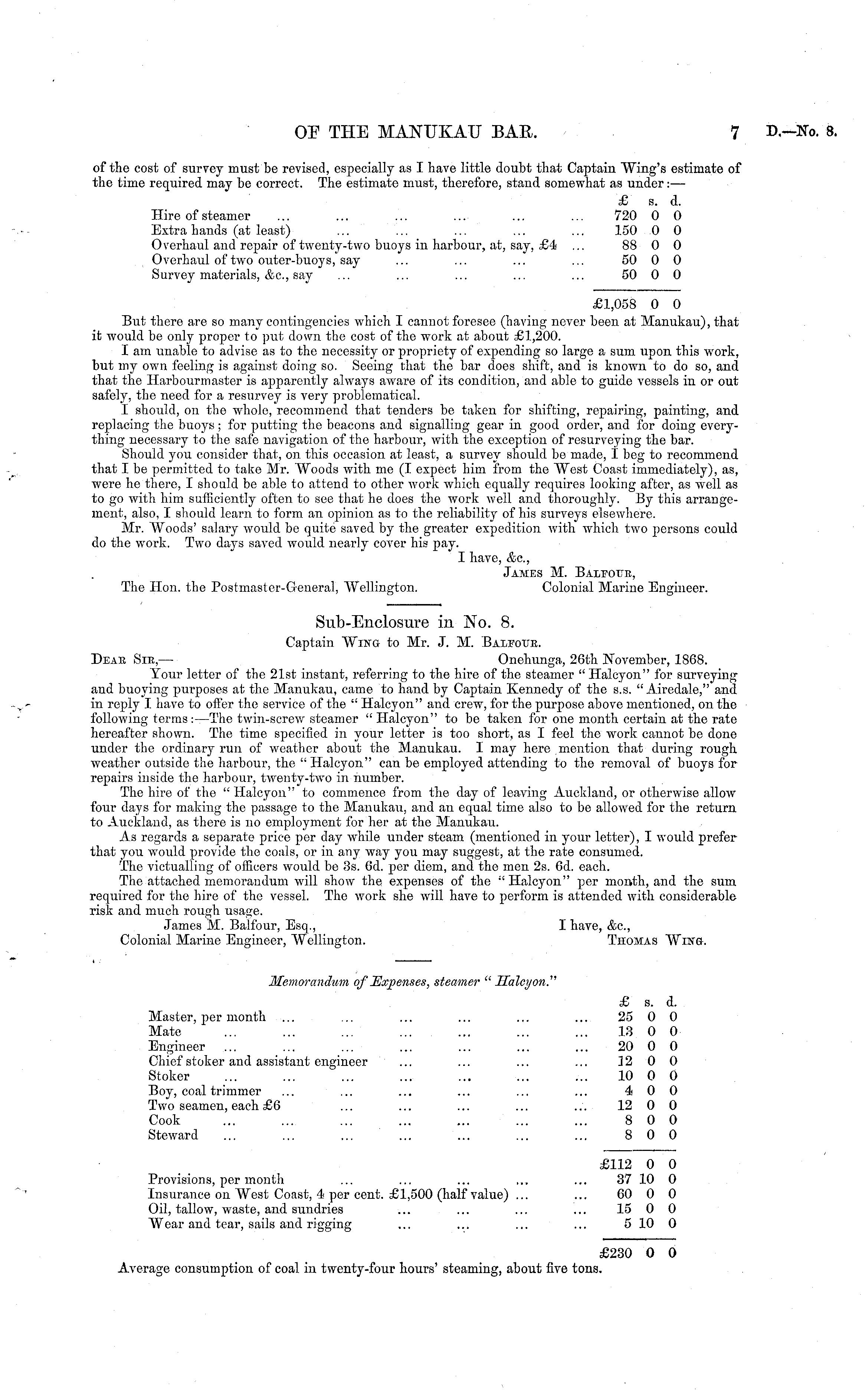 Sub-Enclosure in No. 8. Captain Wing to Mr. J. M. Balfour. Dear Sir, — Onehunga, 26th November, 1868. Your letter of the 21st instant, referring to the hire of the steamer " Halcyon" for surveying and buoying purposes at the Manukau, came to hand by Captain Kennedy of the s.s. "Airedale," and in reply I have to offer the service of the " Halcyon" and crew, for the purpose above mentioned, on the following terms: —The twin-screw steamer " Halcyon" to be taken for one month certain at the rate hereafter shown. The time specified in your letter is too short, as I feel the work cannot be done under the ordinary run of weather about the Manukau. I may here mention that during rough weather outside the harbour, the " Halcyon" can be employed attending to the removal of buoys for repairs inside the harbour, twenty-two in number. The hire of the " Halcyon" to commence from the day of leaving Auckland, or otherwise allow four days for making the passage to the Manukau, and an equal time also to be allow r ed for the return to Auckland, as there is no employment for her at the Manukau. As regards a separate price per day while under steam (mentioned in your letter), I would prefer that you would provide the coals, or in any way you may suggest, at the rate consumed. The victualling of officers would be 3s. 6d. per diem, and the men 2s. 6d. each. The attached memorandum will show the expenses of the " Halcyon" per month, and the sum required for the hire of the vessel. The work she will have to perform is attended with considerable risk and much rough usage. James M. Balfour, Esq., I have, &c., Colonial Marine Engineer, Wellington. Thomas Wing.