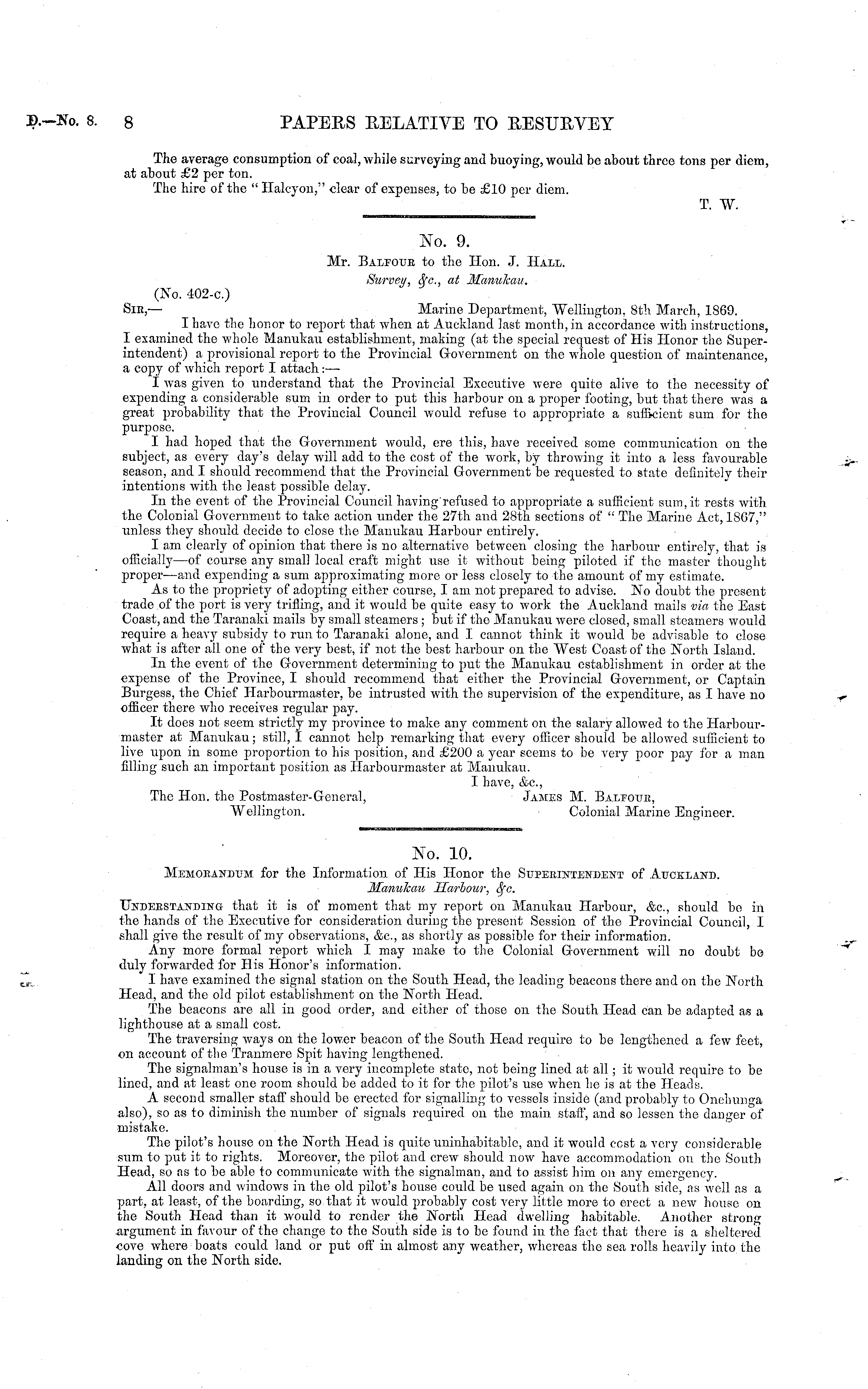 No. 10. Memorandum for the Information of His Honor the Superintendent of Auckland. Manukau Harbour, Sfc. Understanding that it is of moment that my report on Manukau Harbour, Ac, should be in the hands of the Executive for consideration during the present Session of the Provincial Council, I shall give the result of my observations, &c, as shortly as possible for their information. Any more formal report which I may make to the Colonial Government will no doubt be duly forwarded for His Honor's information. I have examined the signal station on the South Head, the leading beacons there and on the North Head, and the old pilot establishment on the North Head. The beacons are all in good order, and either of those on the South Head can be adapted as a lighthouse at a small cost. The traversing ways on the lower beacon of the South Head require to bo lengthened a few feet, on account of the Tranmere Spit having lengthened. The signalman's house is in a very incomplete state, not being lined at all; it would require to be lined, and at least one room should be added to it for the pilot's use when he is at the Heads. A second smaller staff should be erected for signalling to vessels inside (and probably to Onehunga also), so as to diminish the number of signals required on the main staff, and so lessen the danger of mistake. The pilot's house on the North Head is quite uninhabitable, and it would cost a very considerable sum to put it to rights. Moreover, the pilot and crew should now have accommodation on the South. Head, so as to be able to communicate with the signalman, and to assist him on any emergency. All doors and windows in the old pilot's house could be used again on the South side, as well as a part, at least, of the boarding, so that it would probably cost very little more to erect a new house on the South Head than it would to render the North Head dwelling habitable. Another strong argument in favour of the change to the South side is to be found in the fact that there is a sheltered cove where boats could land or put off in almost any weather, whereas the sea rolls heavily into the landing on the North side.