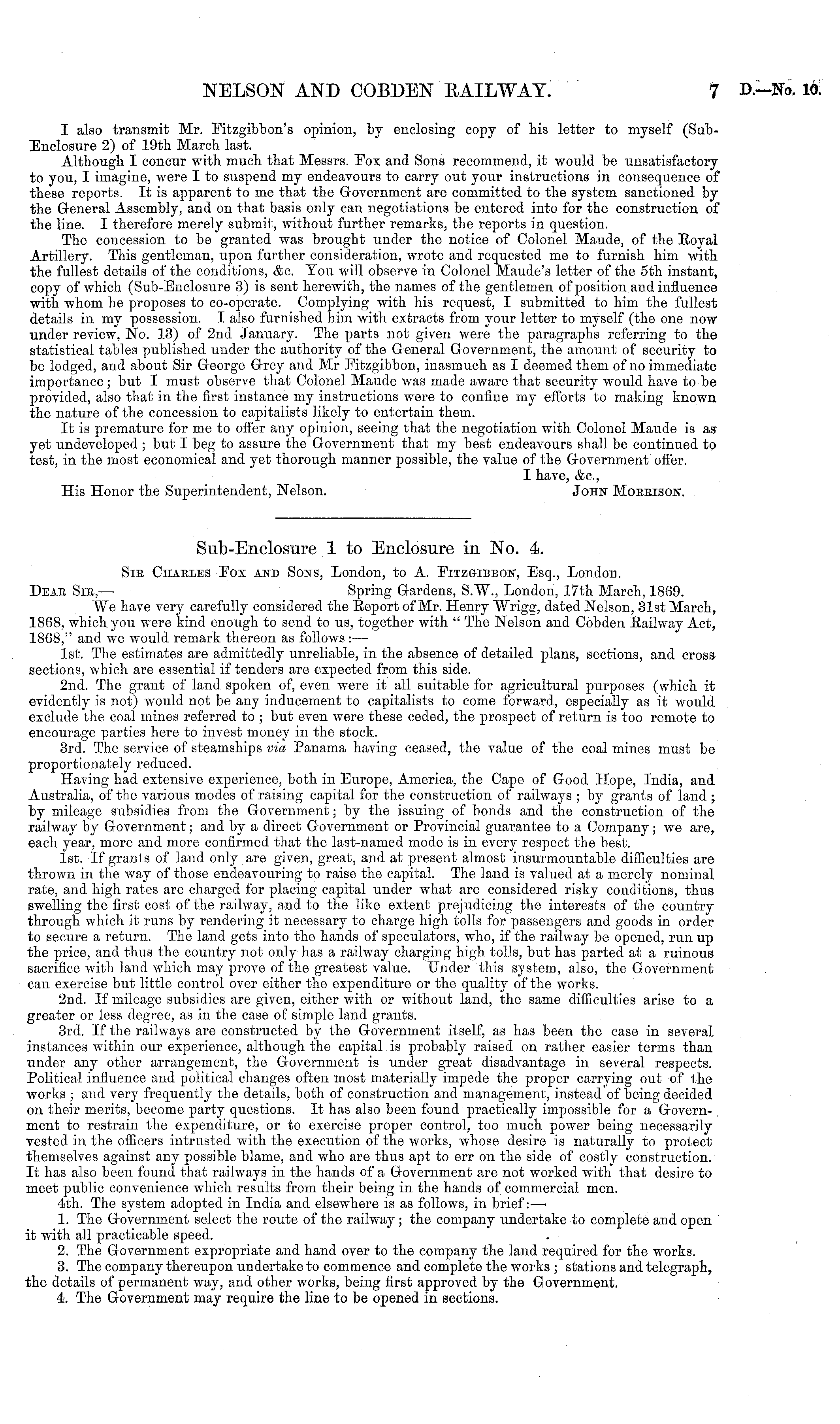 I also transmit Mr. Fitzgibbon's opinion, by enclosing copy of his letter to myself (SubEnclosure 2) of 19th March last. Although I concur with much that Messrs. Fox and Sons recommend, it would be unsatisfactory to you, I imagine, were I to suspend my endeavours to carry out your instructions in consequence of these reports. It is apparent to me that the Government are committed to the system sanctioned by the General Assembly, and on that basis only can negotiations be entered into for the construction of the line. I therefore merely submit, without further remarks, the reports in question. The concession to be granted was brought under the notice of Colonel Maude, of the Royal Artillery. This gentleman, upon farther consideration, wrote and requested me to furnish him with the fullest details of the conditions, &c. Tou will observe in Colonel Maude's letter of the sth instant, copy of which (Sub-Enclosure 3) is sent herewith, the names of the gentlemen of position and influence with whom he proposes to co-operate. Complying with his request, I submitted to him the fullest details in my possession. I also furnished him with extracts from your letter to myself (the one now under review, No. 13) of 2nd January. The parts not given were the paragraphs referring to the statistical tables published under the authority of the General Government, the amount of security to be lodged, and about Sir George Grey and Mr Fitzgibbon, inasmuch as I deemed them of no immediate importance ; but I must observe that Colonel Maude was made aware that security would have to be provided, also that in the first instance my instructions were to confine my efforts to making known the nature of the concession to capitalists likely to entertain them. It is premature for me to offer any opinion, seeing that the negotiation with Colonel Maude is as yet undeveloped ; but I beg to assure the Government that my best endeavours shall be continued to test, in the most economical and yet thorough manner possible, the value of the Government offer. I have, <fee, His Honor the Superintendent, Nelson. John Moeeison.
