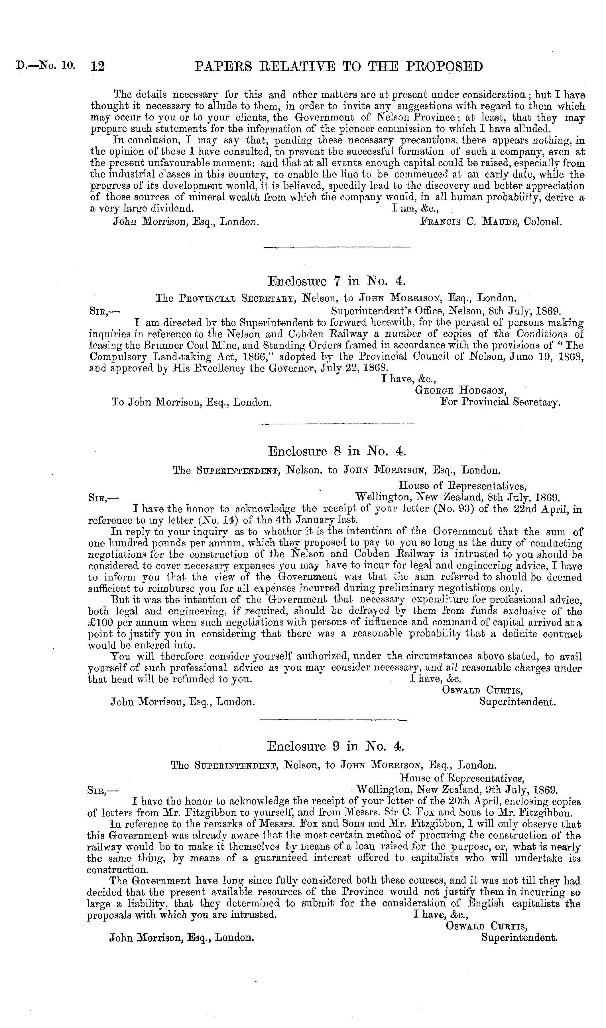 Enclosure 8 in No. 4. The Superintendent, Nelson, to John Morrison, Esq., London. House of Eepresentatives, Sic,— Wellington, New Zealand, Bth July, 1869. I have the honor to acknowledge the receipt of your letter (No. 93) of the 22nd April, in reference to my letter (No. 14) of the 4th January last. In reply to your inquiry as to whether it is the intentiom of the Government that the sum of one hundred pounds per annum, which they proposed to pay to you so long as the duty of conducting negotiations for the construction of the Nelson and Cobden Bailway is intrusted to you should be considered to cover necessary expenses you may have to incur for legal and engineering advice, I have to inform you that the view of the Government was that the sum referred to should bo deemed sufficient to reimburse you for all expenses incurred during preliminary negotiations only. But it was the intention of the Government that necessary expenditure for professional advice, both legal and engineering, if required, should be defrayed by them from funds exclusive of the £100 per annum when such negotiations with persons of influence and command of capital arrived at a point to justify you in considering that there was a reasonable probability that a definite contract would be entered into. You will therefore consider yourself authorized, under the circumstances above stated, to avail yourself of such professional advice as you may consider necessary, and all reasonable charges under that head will be refunded to you. I have, &c. Oswald Cuetis, John Morrison, Esq., London. Superintendent.