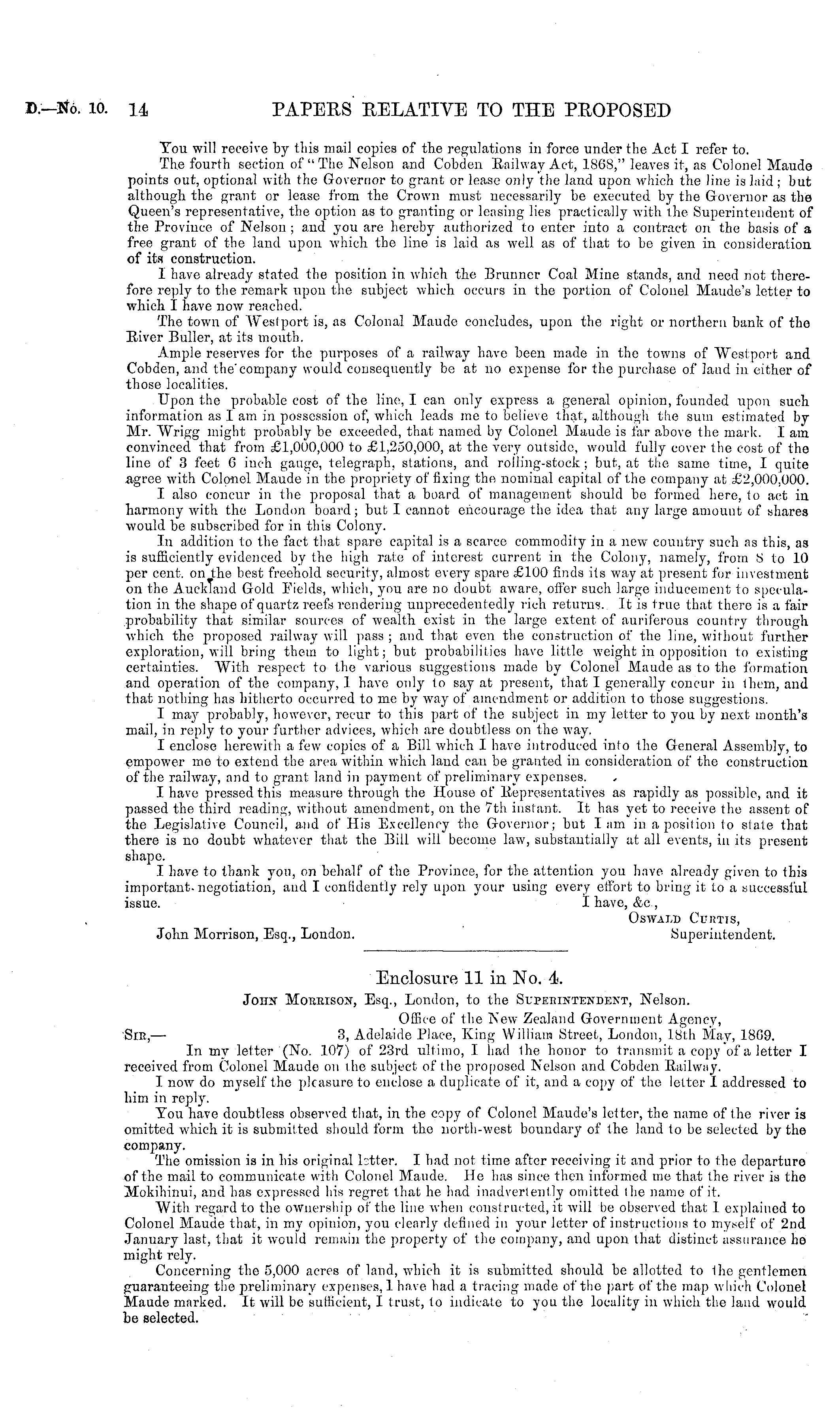 Enclosure 11 in No. 4. John Moeeison, Esq., London, to the Superintendent, Nelson. Office of the New Zealand Government Agency, Sir, — 3, Adelaide Place, King William Street, London, 18th May, 1809. In mj letter (No. 107) of 23rd ultimo, I had the honor to transmit a copy of a letter I received from Colonel Maude on the subject of the proposed Nelson and Cobden Eailway. I now do myself the pleasure to enclose a duplicate of it, and a copy of the letter I addressed to him in reply. You have doubtless observed that, in the copy of Colonel Maude's letter, the name of the river is omitted which it is submitted should form tho north-west boundary of the land to be selected by the company. The omission is in his original lstter. I had not time after receiving it and prior to the departure of tho mail to communicate with Colonel Maude. He has since then informed me that the river is the Mokihinui, and has expressed his regret that he had inadvertently omitted the name of it. With regard to the ownership of the line when constructed, it will be observed that 1 explained to Colonel Maude that, in my opinion, you clearly defined in your letter of instructions to myself of 2nd January last, that it would remain the property of the company, and upon that distinct assurance he might rely. Concerning the 5,000 acres of land, which it is submitted should be allotted to the gentlemen guaranteeing the preliminary expenses, I have had a tracing made of the part of the map which Colonel Maude marked. It will bo sufficient;, I trust, to indicate to you the locality in which the laud would be selected.