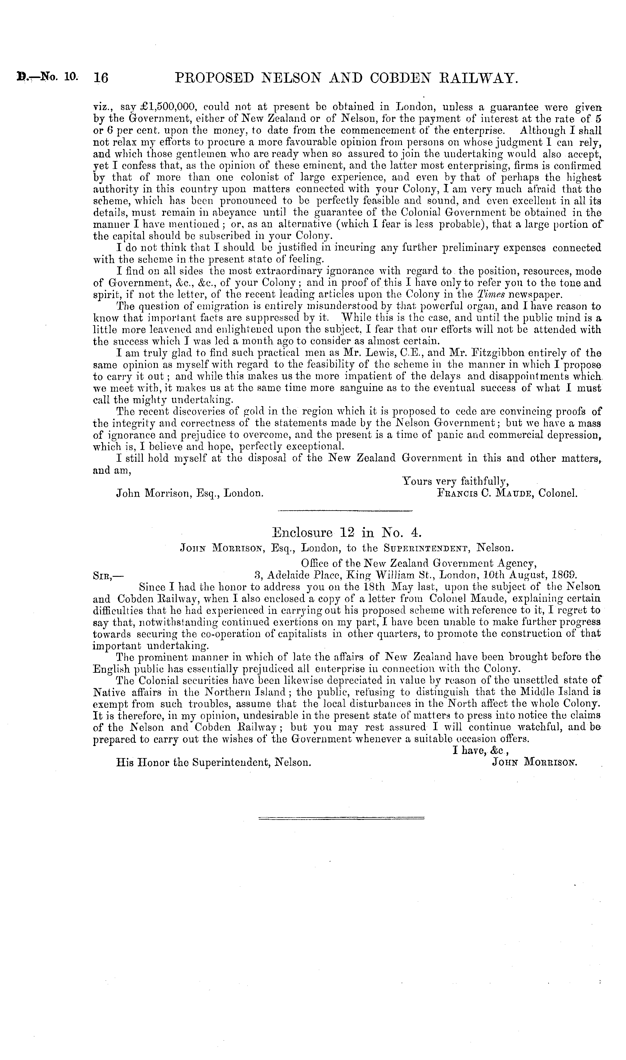 Enclosure 12 in No. 4. John Moertson, Esq., London, to the Superintendent, Nelson. Office of the New Zealand Government Agency, Sir,— 3, Adelaide Place, King William St., London, 10th August, 1809. Since I had the honor to address you on the 18th May last, upon the subject of the Nelson and Cobden Bailway, when I also enclosed a copy of a letter from Colonel Maude, explaining certain difficulties that he had experienced in carrying out his proposed scheme with reference to it, I regret to say that, notwithstanding continued exertions on my part, I have been unable to make further progress towards securing tho co-operation of capitalists in other quarters, to promote the construction of that important undertaking. The prominent manner in which of late the affairs of New Zealand have been brought before the English public has essentially prejudiced all enterprise in connection with tho Colony. The Colonial securities have been likewise depreciated in value by reason of the unsettled state of Native affairs in the Northern Island ; tho public, refusing to distinguish that the Middle Island is exempt from such troubles, assume, that the local disturbances in the North affect the whole Colony. It is therefore, in my opinion, undesirable in the present state of matters to press into notice the claims of the Nelson and Cobden Bailway ; but you may rest assured I will continue watchful, and be prepared to carry out the wishes of the Government whenever a suitable occasion offers. I have, &c, His Honor the Superintendent, Nelson. John Morrison.