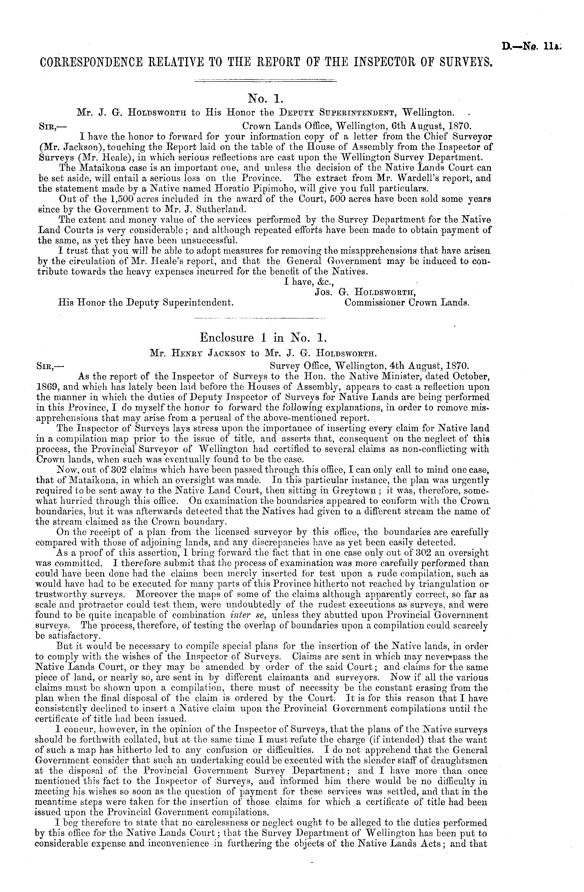 No. 1. Mr. J. G. Holdswoeth to His Honor the Deputy Superintendent, Wellington. Sic, — Crown Lands Oflice, Wellington, 6th August, 1870. I have the honor to forward for your information copy of a letter from the Chief Surveyor (Mr. Jackson), touching the Report laid on the table of the House of Assembly from the Inspector of Surveys (Mr. Heale), in which serious reflections are cast upon the Wellington Survey Department. The Mataikona case is an important one, and unless the decision of the Native Lands Court can be set aside, will entail a serious loss on the Province. The extract from Mr. Warden's report, and the statement made by a Native named Horatio Pipimoho, will give you full particulars. Out of the 1,500 acres included in the award of the Court, 500 acres have been sold some years since by the Government to Mr. J. Sutherland. The extent and money value of the services performed by the Survey Department for the Native Land Courts is very considerable; and although repeated efforts have been made to obtain payment of the same, as yet they have been unsuccessful. I trust that you will be able to adopt measures for removing the misapprehensions that have arisen by the circulation of Mr. Heale's report, and that the General Government may be induced to contribute towards the heavy expenses incurred for the benefit of the Natives. I have, &c, Jos. G. Holdswoeth, His Honor the Deputy Superintendent. Commissioner Crown Lands.