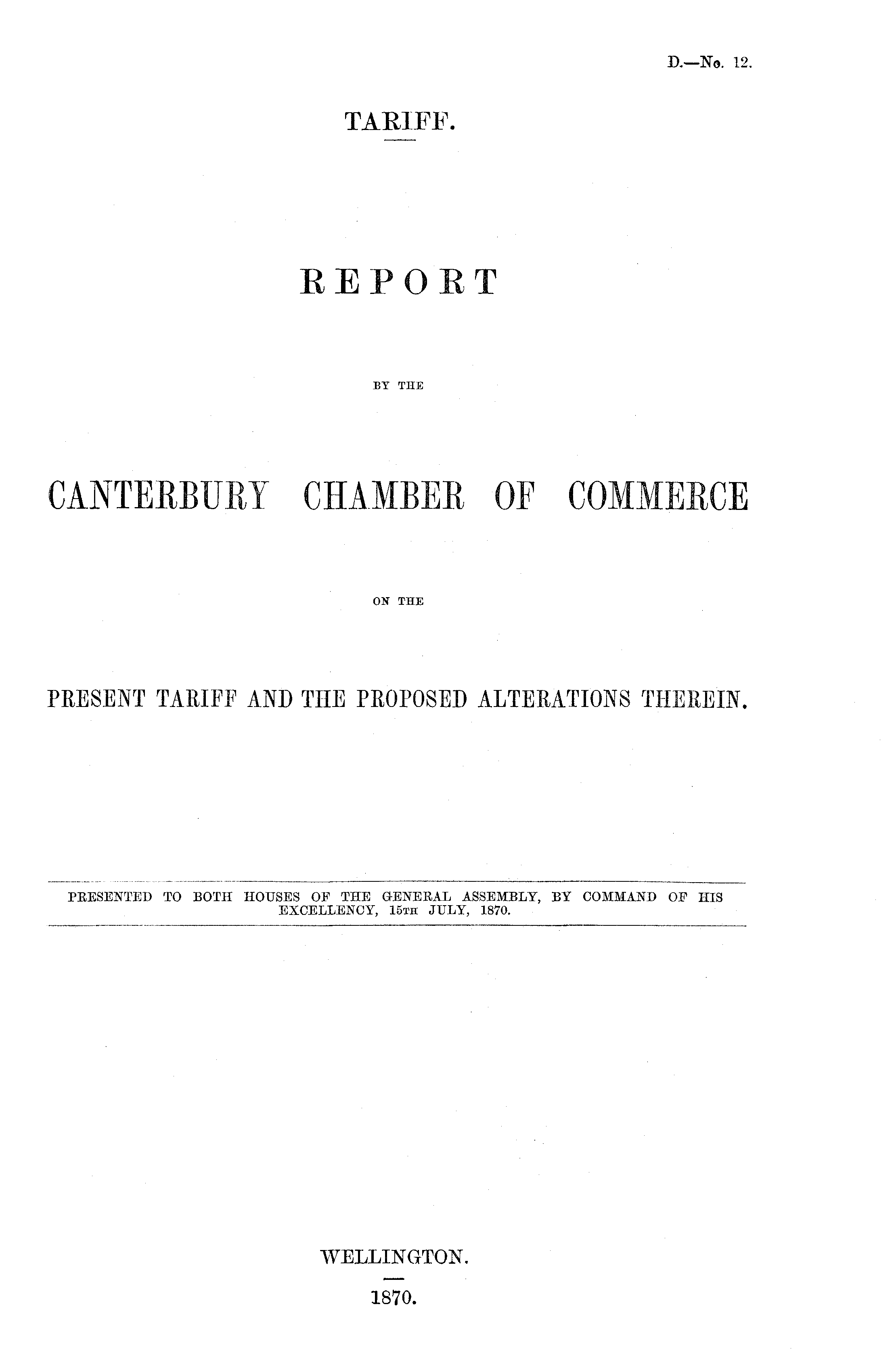 PRESENTED TO BOTH HOUSES OF THE GENERAL ASSEMBLY, BY COMMAND OF HIS EXCELLENCY 15th JULY, 1870. WELLINGTON. 1870.