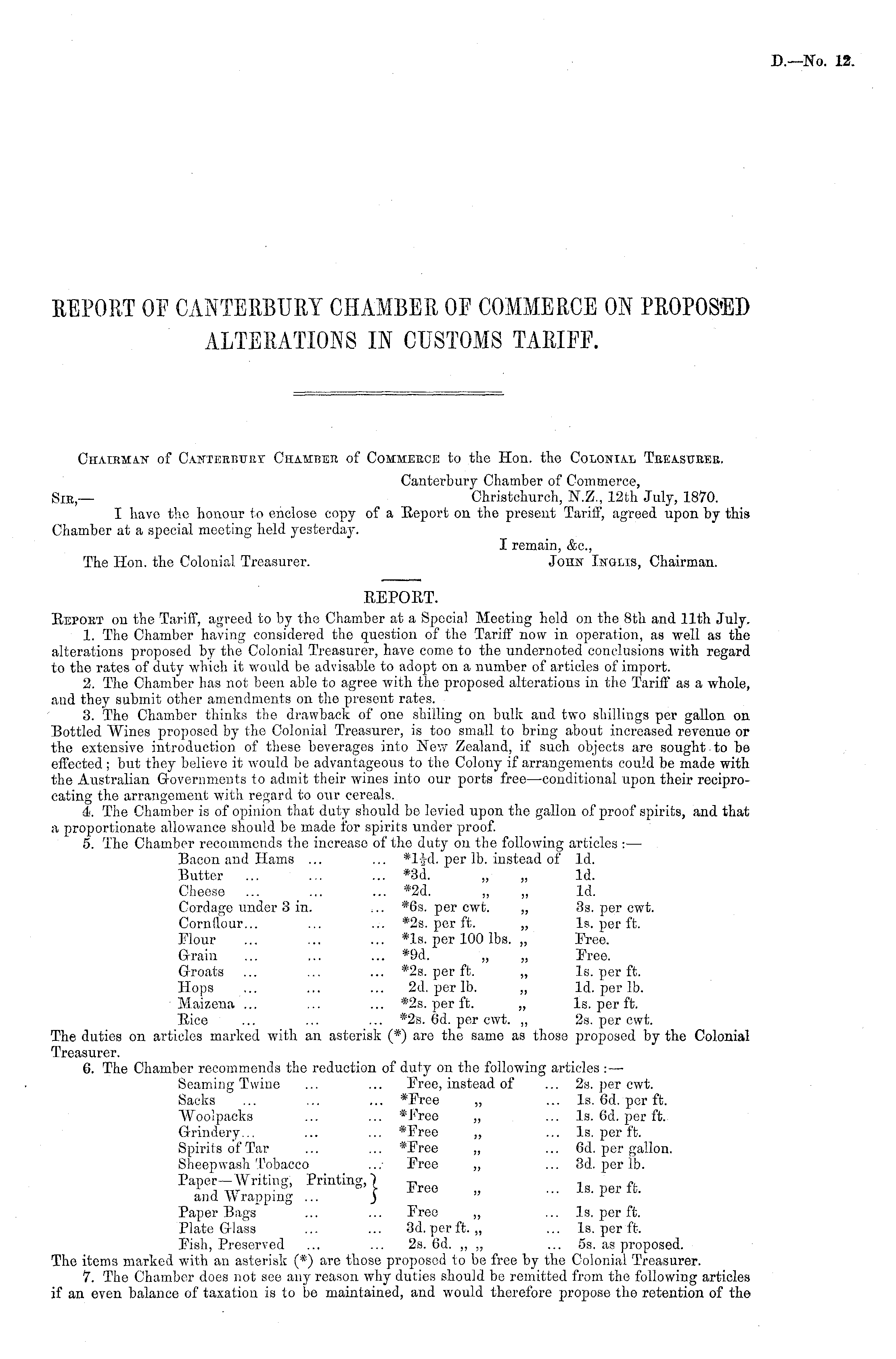 Chairman of Canterbury Chamber of Commerce to the Hon. the Colonial Treasurer. Canterbury Chamber of Commerce, Sir,— Christchurch, N.Z., 12th July, 1870. I have the honour to enclose copy of a Report on the present Tariff, agreed upon by this Chamber at a special meeting held yesterday. I remain, &c, The Hon. the Colonial Treasurer. John Inolis, Chairman.
