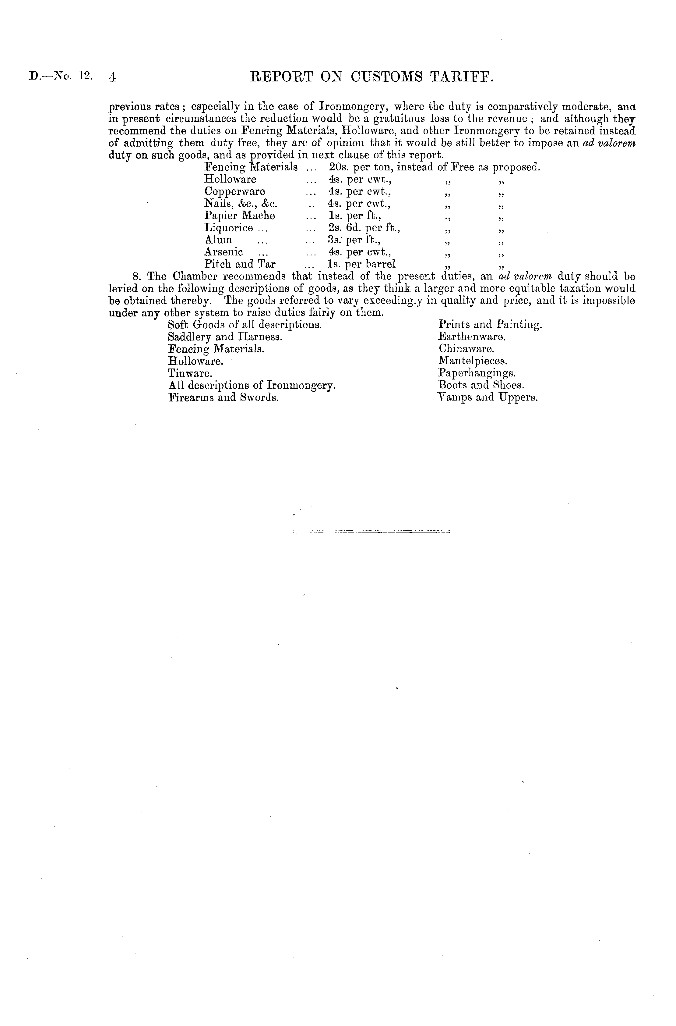 previous rates ; especially in the case of Ironmongery, where the duty is comparatively moderate, ana in present circumstances the reduction would be a gratuitous loss to the revenue ; and although they recommend the duties on Fencing Materials, Holloware, and other Ironmongery to be retained instead of admitting them duty free, they are of opinion that it would be still better to impose an ad valorem duty on such goods, and as provided in next clause of this report. Fencing Materials ... 20s. per ton, instead of Free as proposed. Holloware ... 4s. per cwt., ~ „ Coppcrwaro ... 4s. per cwt., ~ „ Nails, &o, &c. ... 4s. per cwt., ~ „ Papier Mache ... Is. per ft., ~ „ Liquorice... ... 2s. 6d. per ft., „ „ Alum ... ... 3s; per ft., „ ~ Arsenic ... ... 4s. per cwt., ~ ~ Pitch and Tar ... Is. per barrel „ ~ 8. The Chamber recommends that instead of the present duties, an ad valorem duty should be levied on the following descriptions of goods, as they think a larger and more equitable taxation would be obtained thereby. The goods referred to vary exceedingly in quality and price, and it is impossible under any other system to raise duties fairly on them. Soft Goods of all descriptions. Prints and Painting. Saddlery and Harness. Earthenware. Fencing Materials. Chinaware. Holloware. Mantelpieces. Tinware. Paperhangings. All descriptions of Ironmongery. Boots and Shoes. Firearms and Swords. Vamps and Uppers.