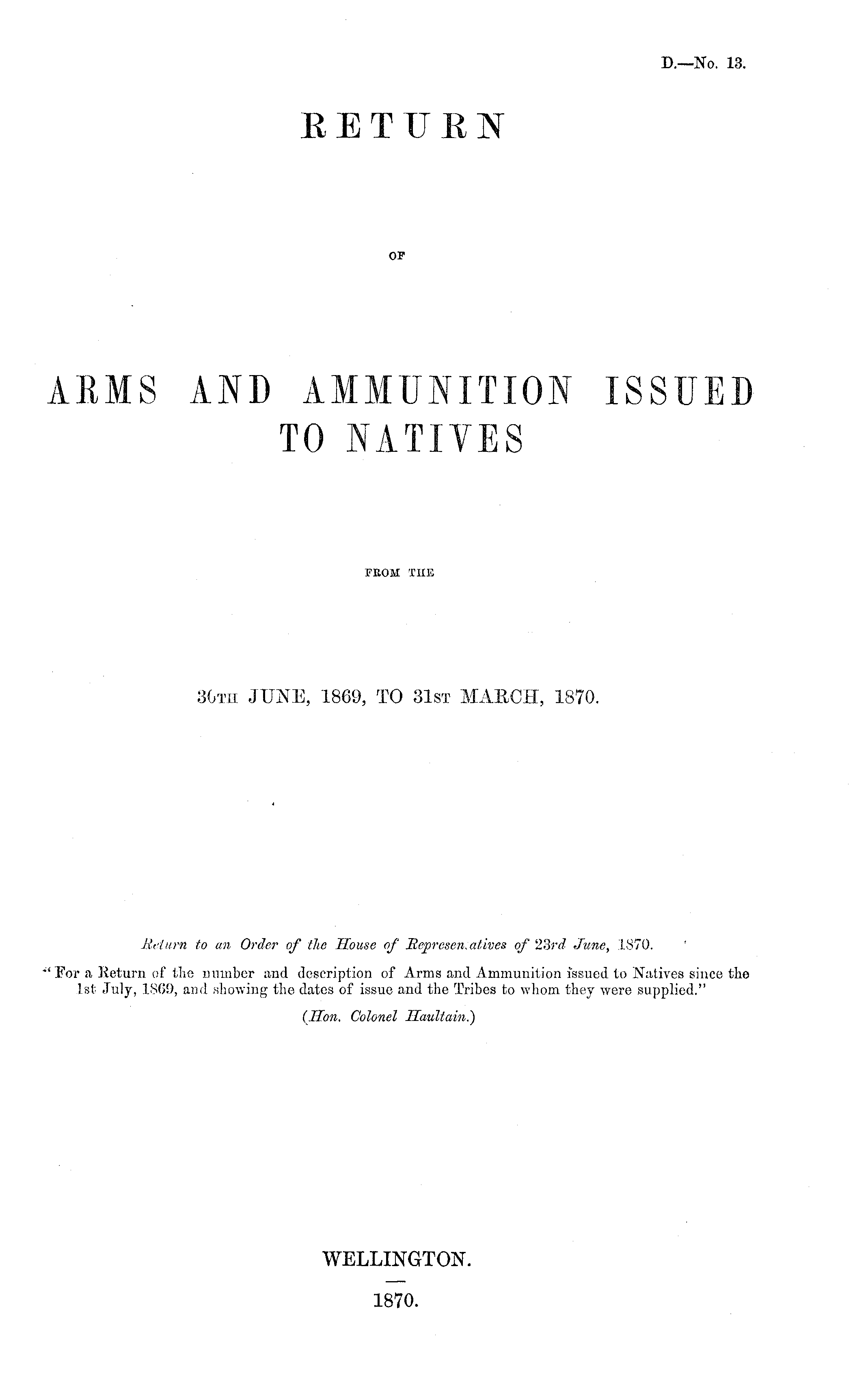 Return to an Order of the House of Beprcsen:alives of T&rd June, 1870. " For a Eeturn of the number and description of Arms and Ammunition issued to Natives since the Ist July, 1569, and showing the dates of issue and the Tribes to whom they were supplied." (Hon. Colonel Haultain.) i ' WELLINGTON. 1870.