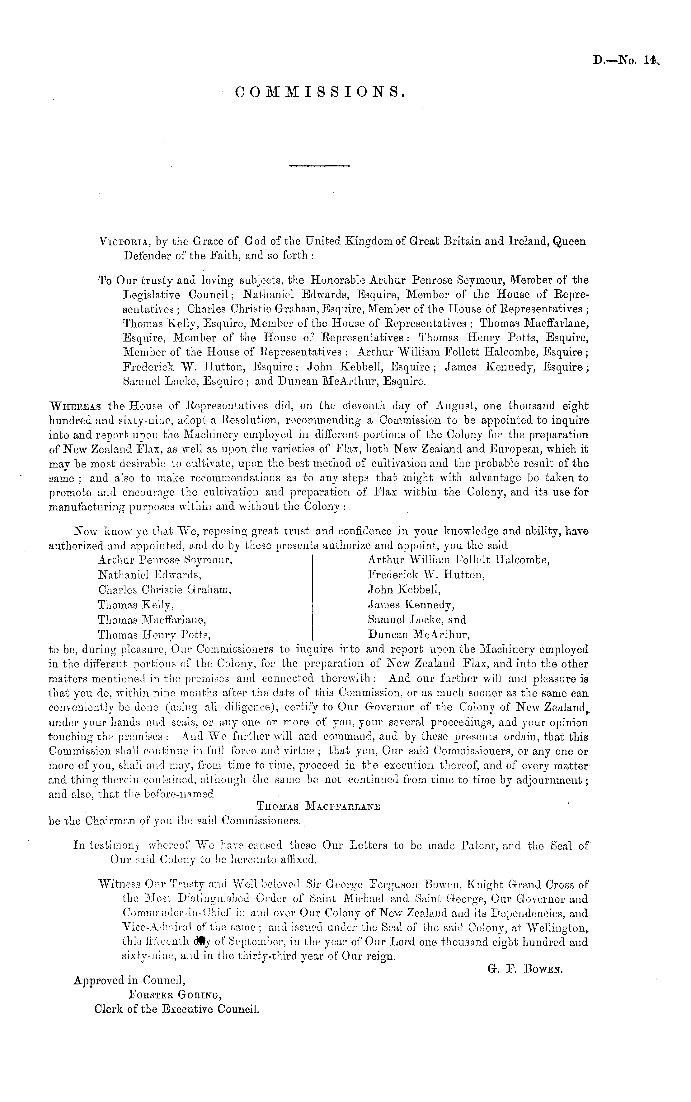 Victoria, by the Grace of God of the United Kingdom of Great- Britain and Ireland, Queen Defender of the Faith, and so forth : To Our trusty and loving subjects, the Honorable Arthur Penrose Seymour, Member of the Legislative Council; Nathaniel Edwards, Esquire, Member of the House of Representatives ; Charles Christie Graham, Esquire, Member of the House of Representatives ; Thomas Kelly, Esquire, Member of the House of Representatives ; Thomas MacfFarlane, Esquire, Member of the House of Representatives : Thomas Henry Potts, Esquire, Member of the House of Representatives ; Arthur William Follctt Halcombe, Esquire; Frederick W. Hutton, Esquire; John Kobbell, Esquire; James Kennedy, Esquire j Samuel Locke, Esquire; and Duncan McArthur, Esquire. Whereas the House of Representatives did, on the eleventh day of Augusl, one thousand eight hundred and sixty-nine, adopt a Resolution, recommending a Commission to be appointed to inquire into and report upon the Machinery employed in different portions of the Colony for the preparation of New Zealand Elax, as well as upon the varieties of Elax, both New Zealand and European, which it may be most desirable to cultivate, upon the best method of cultivation and the probable result of the same • and also to make recommendations as to any steps that might with advantage be taken to promote and encourage tho cultivation and preparation of Elax within the Colony, and its use for manufacturing purposes within and without the Colony : Now know ye that We, reposing great trust and confidence in your knowledge and ability, have authorized and appointed, and do by these presents authorize and appoint, you the said Arthur Penrose Seymour, Arthur William Follett Halcombe, Nathaniel Edwards, Frederick W. Hutton, Charles Christie Graham, John Kebbell, Thomas Kelly, James Kennedy, Thomas Macffarlane, Samuel Locke, and Thomas Henry Potts, Duncan McArthur, to be, during pleasure, Our Commissioners to inquire into and report upon the Machinery employed in tho different portions of the Colony, for the preparation of New Zealand Elax, and into the other matters mentioned in the premises and connected therewith: And our further will and pleasure is that you do, within nine months after the date of this Commission, or as much sooner as tho same can conveniently bo done (using all diligence), certify to Our Governor of the Colony of New Zealand under your hands and seals, or any one or more of you, your several proceedings, and your opinion touching the premises : And We further will and command, and by these presents ordain, that this Commission shall continue in full force and virtue ; that you, Our said Commissioners, or any one or more of you, shall and may, from time to time, proceed in the execution thereof, and of every matter and thing therein contained, although the same be not continued from time to time by adjournment; and also, that the before-named Thomas Macpearlane be the Chairman of you tho said Commissioners. In testimony whereof Wc have caused these Our Letters to be made Patent, and tho Seal of Our said Colony to bo hereunto affixed. Witness Our Trusty and Well-beloved Sir George Ferguson Bowen, Knight Grand Cross of the Most Distinguished Order of Saint Michael and Saint George, Our Governor and Commander-in-Chief in and over Our Colony of New Zealand and its Dependencies, and Vice-Admiral of the same ; and issued under the Seal of the said Colony, at Wellington, this fifteenth <J|y of September, in the year of Our Lord one thousand eight hundred and sixty-nine, and in the thirty-third year of Our reign. G. F. Bowen. Approved in Council, Eorsteb Goring, Clerk of the Executive Council.