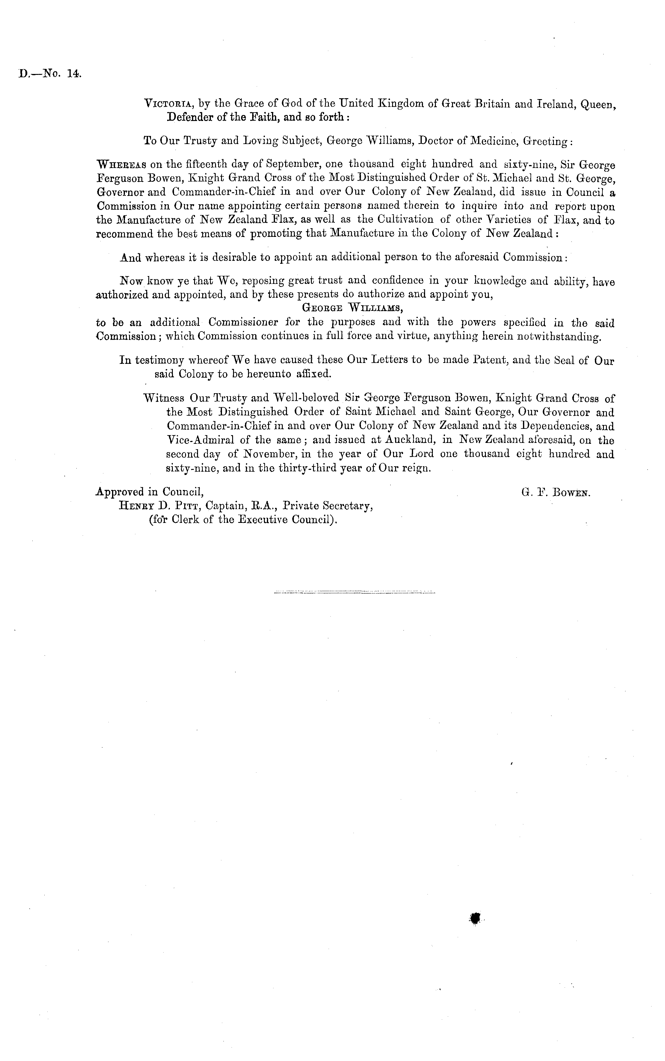 Victoria, by the Grace of God of the United Kingdom of Great Britain and Ireland, Queen, Defender of the Faith, and so forth ; To Our Trusty and Loving Subject, George Williams, Doctor of Medicine, Greeting : Whereas on the fifteenth day of September, one thousand eight hundred and sixty-nine, Sir George Ferguson Bowen, Knight Grand Cross of the Most Distinguished Order of St. Michael and St. George, Governor and Commander-in-Chief in and over Our Colony of New Zealand, did issue in Council a Commission in Our name appointing certain persons named therein to inquire into and report upon the Manufacture of New Zealand Elax, as well as the Cultivation of other Varieties of Flax, and to recommend the best means of promoting that Manufacture in the Colony of New Zealand : And whereas it is desirable to appoint an additional person to the aforesaid Commission: Now know ye that We, reposing great trust and confidence in your knowledge and ability, have authorized and appointed, and by these presents do authorize and appoint you, George Williams, to be an additional Commissioner for the purposes and with the powers specified in the said Commission; which Commission continues in full force and virtue, anything herein notwithstanding. In testimony whereof We have caused these Our Letters to be made Patent, and tho Seal of Our said Colony to be hereunto affixed. Witness Our Trusty and Well-beloved Sir George Ferguson Bowen, Knight Grand Cross of the Most Distinguished Order of Saint Michael and Saint George, Our Governor and Commander-in-Chief in and over Our Colony of New Zealand and its Dependencies, and Vice-Admiral of the same ; and issued at Auckland, in New Zealand aforesaid, on the second day of November, in the year of Our Lord one thousand eight hundred and sixty-nine, and in the thirty-third year of Our reign. Approved in Council, G. F. Bowen. Henet D. Pitt, Captain, R.A., Private Secretary, (for Clerk of the Executive Council).