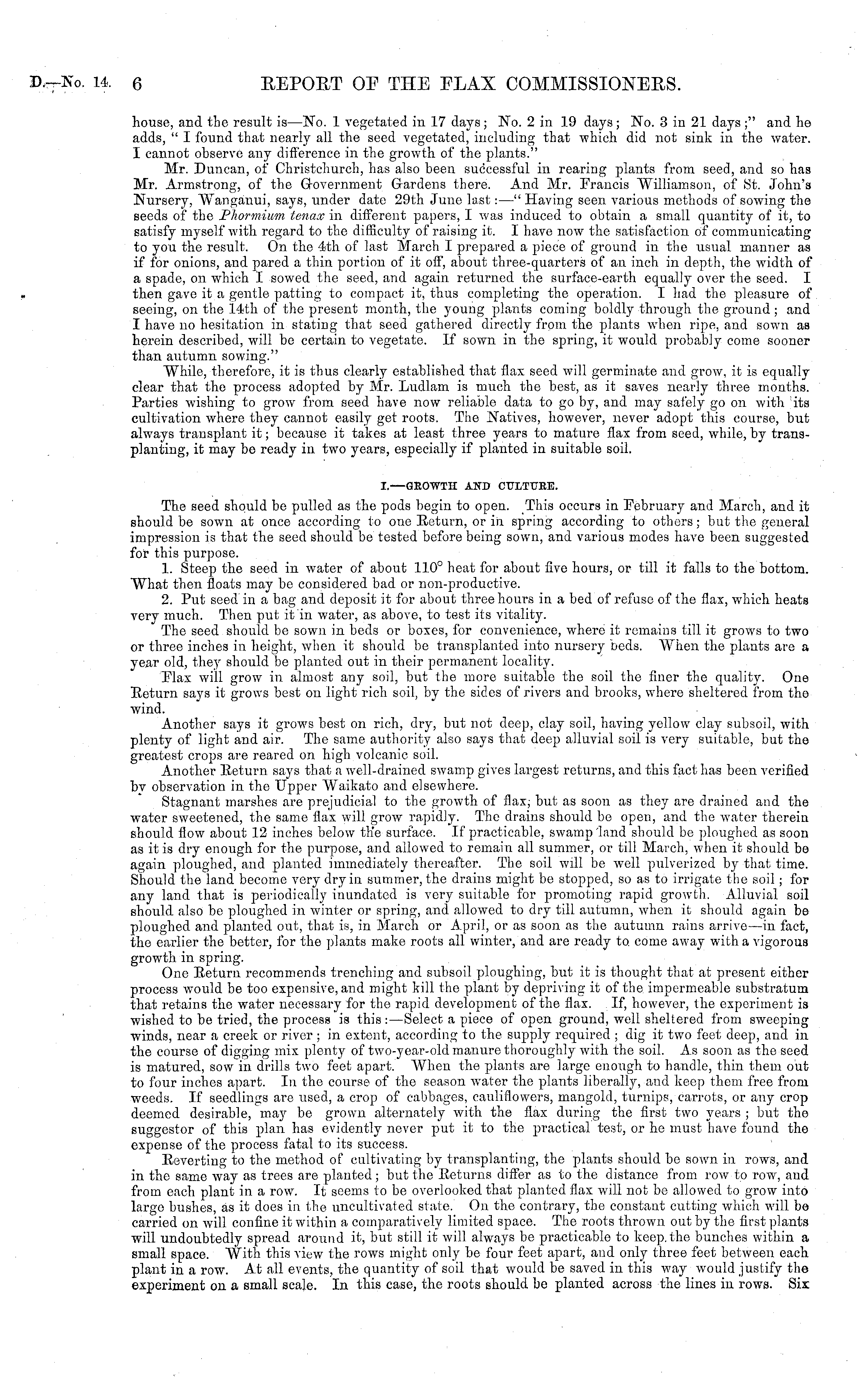 house, and the result is—No. 1 vegetated in 17 days; No. 2in 19 days ; No. 3in 21 days ;" and he adds, " I found that nearly all the seed vegetated, including that which did not sink in the water. I cannot observe any difference in the growth of the plants." Mr. Duncan, of Christchurch, has also been successful in rearing plants from seed, and so has Mr. Armstrong, of the Government Gardens there. And Mr. Francis Williamson, of St. John's Nursery, Wanganui, says, under date 29th June last : —" Having seen various methods of sowing the seeds of tho Phormiuin tenax in different papers, I was induced to obtain a small quantity of it, to satisfy myself with regard to the difficulty of raising it. I have now the satisfaction of communicating to you the result. On the 4th of last March I prepared a piece of ground in the usual manner as if for onions, and pared a thin portion of it off, about three-quarters of an inch in depth, the width of a spade, on which I sowed the seed, and again returned the surface-earth equally over the seed. I then gave it a gentle patting to compact it, thus completing the operation. I had the pleasure of seeing, on the 14th of the present month, the young plants coming boldly through tho ground ; and I have no hesitation in stating that seed gathered directly from the plants when ripe, and sown as herein described, will bo certain to vegetate. If sown in the spring, it would probably come sooner than autumn sowing." While, therefore, it is thus clearly established that flax seed will germinate and grow, it is equally clear that tho process adopted by Mr. Ludlam is much the best, as it saves nearly three months. Parties wishing to grow from seed have now reliable data to go by, and may safely go on with its cultivation where they cannot easily get roots. The Natives, however, never adopt this course, but always transplant it; because it takes at least three years to mature flax from seed, while, by transplanting, it may be ready in two years, especially if planted in suitable soil. i.— growth and culture. The seed should be pulled as the pods begin to open. This occurs in February and March, and it should be sown at once according to one Return, or in spring according to others; but the general impression is that the seed should be tested before being sown, and various modes have been suggested for this purpose. 1. Steep the seed in water of about 110° heat for about five hours, or till it falls to the bottom. What then floats may be considered bad or non-productive. 2. Put seed in a bag and deposit it for about three hours in a bed of refuse of the flax, which heats very much. Then put it in water, as above, to test its vitality. The seed should be sown in beds or boxes, for convenience, where it remains till it grows to two or three inches in height, when it should be transplanted into nursery beds. When the plants are a year old, they should be planted out in their permanent locality. Flax will grow in almost any soil, but the more suitable the soil the finer the quality. One Return says it grows best on light rich soil, by the sides of rivers and brooks, where sheltered from the wind. Another says it grows best on rich, dry, but not deep, clay soil, having yellow clay subsoil, with plenty of light and air. The same authority also says that deep alluvial soil i 3 very suitable, but the greatest crops are reared on high volcanic soil. Another Return says that a well-drained swamp gives largest returns, and this fact has been verified by observation in the Upper Waikato and elsewhere. Stagnant marshes are prejudicial to the growth of flax; but as soon as they are drained and the water sweetened, the same flax will grow rapidly. The drains should be open, and the water therein should flow about 12 inches below the surface. If practicable, swampland should be ploughed as soon as it is dry enough for the purpose, and allowed to remain all summer, or till March, when it should be again ploughed, and planted immediately thereafter. The soil will be well pulverized by that time. Should the land become very dry in summer, the drains might bo stopped, so as to irrigate the soil ; for any land that is periodically inundated is very suitable for promoting rapid growth. Alluvial soil should also bo ploughed in winter or spring, and allowed to dry till autumn, when it should again be ploughed and planted out, that is, in March or April, or as soon as the autumn rains arrive—in fact, the earlier the better, for the plants make roots all winter, and are ready to come away with a vigorous growth in spring. One Return recommends trenching and subsoil ploughing, but it is thought that at present either process would be too expensive, and might kill the plant by depriving it of the impermeable substratum that retains the water necessary for the rapid development of the flax. If, however, the experiment is wished to be tried, the process is this : —Select a piece of open ground, well sheltered from sweeping winds, near a creek or river ; in extent, according to the supply required ; dig it two feet deep, and in the course of digging mix plenty of two-year-old manure thoroughly with the soil. As soon as the seed is matured, sow in drills two feet apart. When the plants arc large enough to handle, thin them out to four inches apart. In the course of the season water the plants liberally, and keep them free from weeds. If seedlings are used, a crop of cabbages, cauliflowers, mangold, turnips, carrots, or any crop deemed desirable, may be grown alternately with the flax during the first two years ; but the suggestor of this plan has evidently never put it to the practical test, or he must have found the expense of the process fatal to its success. Reverting to the method of cultivating by transplanting, the plants should be sown in rows, and in the same way as trees are planted; but the Returns differ as to the distance from row to row, and from each plant in a row. It seems t
