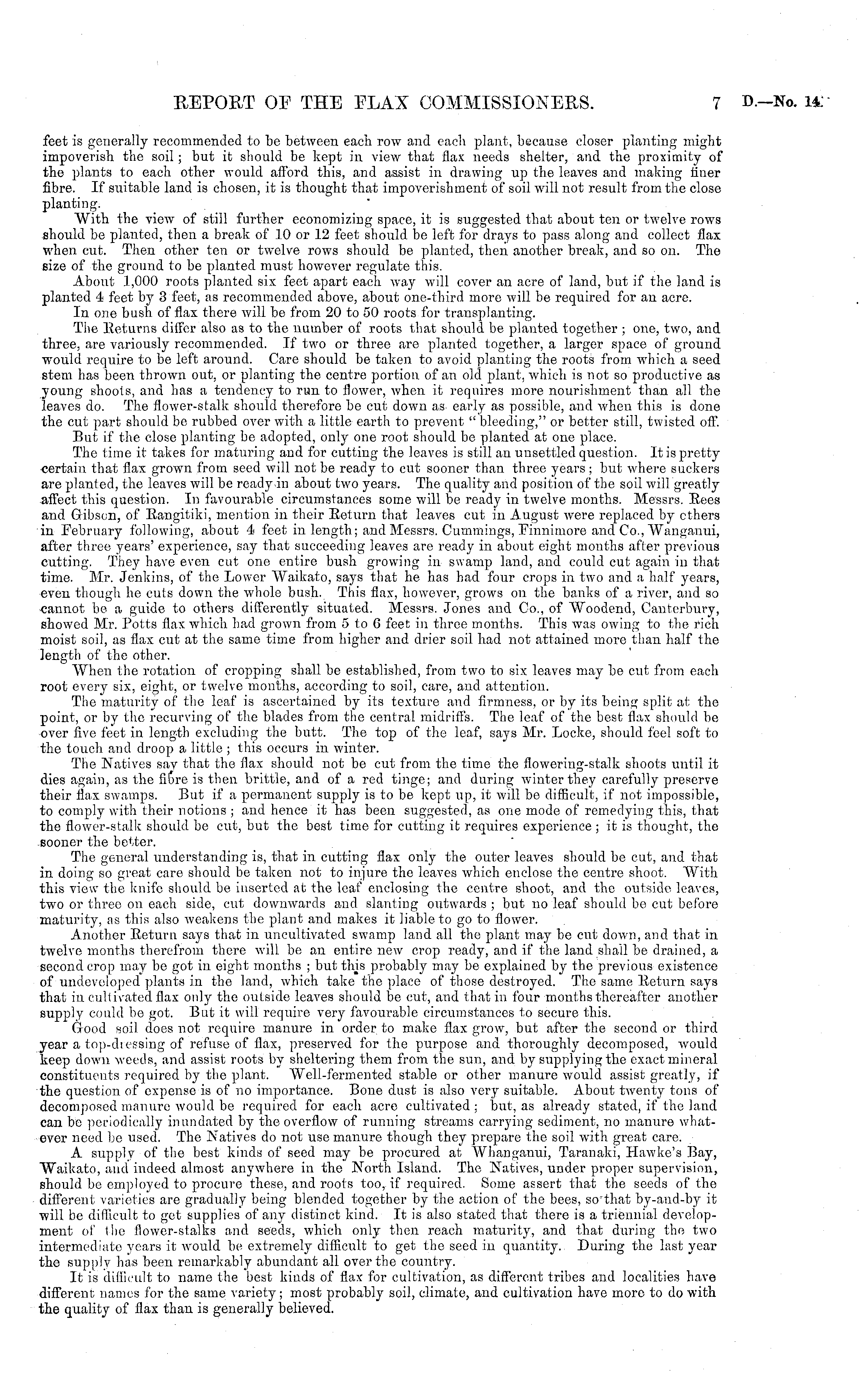 feet is generally recommended to bo between each row and each plant, because closer planting might impoverish the soil; but it should be kept in view that flax needs shelter, and the proximity of the plants to each other would afford this, and assist in drawing up the leaves and making finer fibre. If suitable land is chosen, it is thought that impoverishment of soil will not result from the close planting. With the view of still further economizing space, it is suggested that about ten or twelve rows should be planted, then a break of 10 or 12 feet should be left for drays to pass along and collect flax when cut. Then other ten or twelve rows should be planted, then another break, and so on. The size of the ground to be planted must however regulate this. About 1,000 roots planted six feet apart each way will cover an acre of land, but if the land is planted 4 feet by 3 feet, as recommended above, about one-third more will be required for an acre. In one bush of flax there will be from 20 to 50 roots for transplanting. The Returns differ also as to the number of roots that should be planted together ; one, two, and three, are variously recommended. If two or three are planted together, a larger space of ground would require to be left around. Care should be taken to avoid planting the roots from which a seed stem has been thrown out, or planting the centre portion of an old plant, which is not so productive as young shoots, and has a tendency to run to flower, when it requires more nourishment than all the leaves do. The flower-stalk should therefore be cut down as early as possible, and when this is done the cut part should be rubbed over with a little earth to prevent " bleeding," or better still, twisted off. But if the close planting be adopted, only one root should be planted at one place. The time it takes for maturing and for cutting the leaves is still an unsettled question. It is pretty certain that flax grown from seed will not be ready to cut sooner than three years ; but where suckers are planted, the leaves will be ready in about two years. The quality and position of the soil will greatly affect this question. In favourable circumstances some will be ready in twelve months. Messrs. Rees and Gibson, of Rangitiki, mention in their Return that leaves cut in August were replaced by ethers in February following, about 4 feet in length; and Messrs. Cuinmings, Finnimore and Co., Wanganui, after three years' experience, say that succeeding leaves are ready in about eight mouths after previous cutting. They have even cut one entire bush growing in swamp land, and could cut again in that time. Mr. Jenkins, of the Lower Waikato, says that he has had four crops in two and a half years, even though he cuts down the whole bush. Tins flax, however, grows on the banks of a river, and so cannot be a guide to others differently situated. Messrs. Jones and Co., of Woodend, Canterbury, showed Mr. Potts flax which had grown from sto 6 feet in three months. This was owing to the rich moist soil, as flax cut at the same time from higher and drier soil had not attained more than half the length of the other. When the rotation of cropping shall be established, from two to six leaves may be cut from each root every six, eight, or twelve mouths, according to soil, care, and attention. The maturity of the leaf is ascertained by its texture and firmness, or by its being split at the point, or by the recurving of the blades from the central midriffs. The leaf of the best flax should be over five feet in length excluding tho butt. The top of the leaf, says Mr. Locke, should feel soft to the touch and droop a little ; this occurs in winter. The Natives say that the flax should not be cut from the time the flowering-stalk shoots until it dies again, as the fibre is then brittle, and of a red tinge; and during winter they carefully preserve their flax swamps. But if a permanent supply is to be kept up, it will be difficult, if not impossible, to comply with their notions ; and hence it has been suggested, as one mode of remedying this, that the flower-stalk should be cut, but the best time for cutting it requires experience ; it is thought, the sooner the better. The general understanding is, that in cutting flax only the outer leaves should bo cut, and that in doing so great care should be taken not to injure the leaves which enclose the centre shoot. With this view the knife should be inserted at the leaf enclosing the centre shoot, and the outside leaves, two or three on each side, cut downwards and slanting outwards ; but no leaf should be cut before maturity, as this also weakens the plant and makes it liable to go to flower. Another Return says that in uncultivated swamp land all tho plant may be cut down, and that in twelve months therefrom there will be an entire new crop ready, and if the land shall be drained, a second crop may bo got in eight months ; but this probably may be explained by the previous existence of undeveloped plants in the land, which take the place of those destroyed. The same Return says that in cultivated flax only the outside leaves should be cut, and that in four months thereafter another supply could be got. But it will require very favourable circumstances to secure this. Good soil does not require manure in order to make flax grow, but after the second or third year a top-diessing of refuse of flax, preserved for the purpose and thoroughly decomposed, would keep down weeds, and assist roots by sheltering them from the sun, and by supplying the exact mineral constituents required by the plant. Well-fermented stable or other manure would assist greatly, if the question of expense is of no importance. Bone dust is also very suitable. About twenty tons of decomposed manure would bo required for each acre cultivated ; but, as already stated, if the land can be periodically inundated by the overflow of running streams carrying sediment, no manure whatever need bo used. The Nat