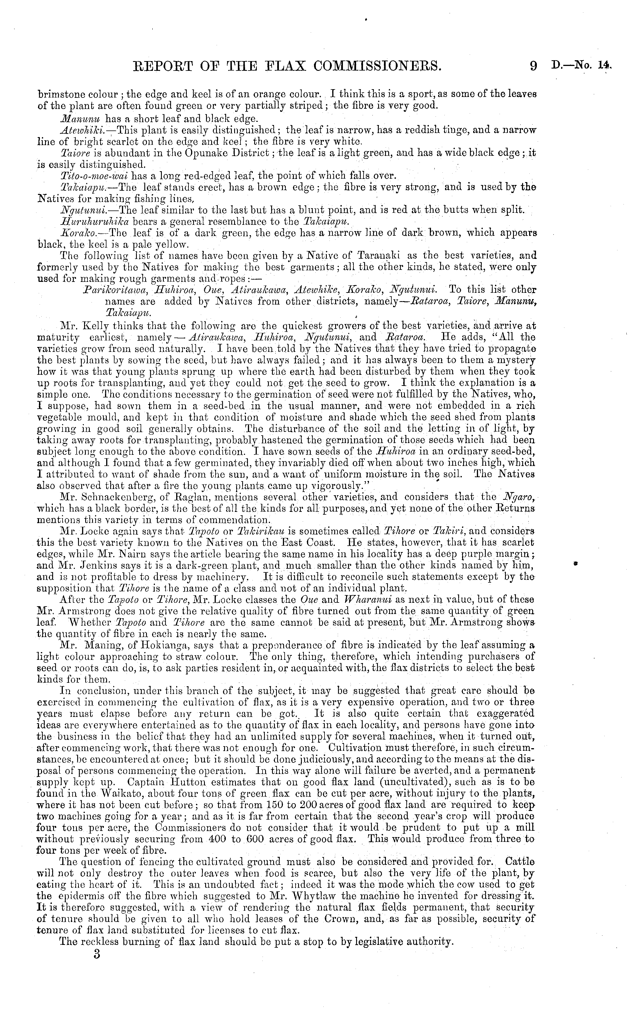 brimstone colour ; the edge and keel is of an orange colour. I think this is a sport, as some of the leaves of the plant are often found green or very partially striped; the fibre is very good. Manunu has a short leaf and black edge. Atewhiki.—Th'us plant is easily distinguished ; the leaf is narrow, has a reddish tinge, and a narrow line of bright scarlet on the edge and keel ; the fibre is very white. Taiore is abundant in the Opunakc District; the leaf is a light green, and has a wide black edge ;it is easily distinguished. Tito-o-moe-wai has a long red-edged leaf, the point of which falls over. Talcaiapu. —The leaf stands erect, has a brown edge; the fibre is very strong, and is used by the Natives for making fishing lines. Ngutunui. —The leaf similar to the last but has a blunt point, and is red at the butts when split. HuruhuruliiJca bears a general resemblance to tho Talcaiapu. Korako. —The leaf is of a dark green, the edge has a narrow line of dark brown, which appears black, the keel is a pale yellow. The following list of names have been given by a Native of Taranaki as the best varieties, and formerly used by the Natives for making tho best garments; all the other kinds, he stated, were only used for making rough garments andropes : — Parikorilawa, Huhiroa, Oue, Atiraukawa, Atewhike, Korako, Ngutunui. To this list other names are added by Natives from other districts, namely— Eataroa, Taiore, Manunu, Talcaiapu. Mr. Kelly thinks that tho following are the quickest growers of the best varieties, and. arrive at maturity earliest, namely — Atiraukawa, Huhiroa, Ngutunui, and Eataroa. He adds, "All the varieties grow from seed naturally. I have been told by the Natives that they have tried to propagate the best plants by sowing the seed, but have always failed; and it has always been to them a mystery how it was that young plants sprung up where the earth had been disturbed by them when they took up roots for transplanting, and yet they could not get the seed to grow. I think the explanation is a simple one. The conditions necessary to the germination of seed were not fulfilled, by the Natives, who, I suppose, had sown them in a seed-bed in the usual manner, and were not embedded in a rich vegetable mould, and kept in that condition of moisture and shade which the seed shed from plants growing in good soil generally obtains. The disturbance of tho soil and the letting in of light, by taking away roots for transplanting, probably hastened the germination, of those seeds which had been subject long enough to the above condition. I have sown seeds of the Huhiroa in an ordinary seed-bed, and although I found that a few germinated, they invariably died off when about two inches high, which I attributed to want of shade from the sun, and a want of uniform moisture in the soil. The Natives also observed that after a fire tho young plants came up vigorously." Mr. Schnackenberg, of Raglan, mentions several other varieties, and considers that the Ngaro, which has a black border, is the best of all the kinds for all purposes, and yet none of tho other Returns mentions this variety in terms of commendation. Mr. Locke again says that Tapoto or Takirikau is sometimes called Tihore or Talciri, and considers this the best variety known to the Natives on the East Coast. He states, however, that it has scarlet edges, while Mr. Nairn says the article bearing the same name in his locality has a deep purple margin ; and Mr. Jenkins says it is a dark-green plant, and much smaller than the other kinds named by him, and is not profitable to dress by machinery. It is difficult to reconcile such statements except by the supposition that Tihore is the name of a class and not of an individual plant. After the Tapoto or Tihore, Mr. Locke classes the Oue and Wharanui as next in value, but of theso Mr. Armstrong docs not give the relative quality of fibre turned out from the same quantity of green leaf. Whether Tapoto and Tihore are the same cannot be said at present, but Mr. Armstrong shows the quantity of fibre in each is nearly tho same. Mr. Mailing, of Hokianga, says that a preponderance of fibre is indicated by tho leaf assuming a light colour approaching to straw colour. The only thing, therefore, which intending purchasers of seed or roots can do, is, to ask parties resident in, or acquainted with, the flax districts to select the best kinds for them. In conclusion, under this branch of the subject, it may be suggested that great care should be exercised in commencing the cultivation of flax, as it is a very expensive operation, and two or three years must elapse before any return can be got. It is also quite certain that exaggerated ideas are everywhere entertained as to the quantity of flax in each locality, and persons have gone into the business in the belief that they had an unlimited supply for several machines, when it turned out, after commencing work, that there was not enough for one. Cultivation must therefore, in such circumstances, be encountered at once; but it should be done judiciously, aud according to the means at the disposal of persons commencing the operation. In this way alone will failure be averted, and a permanent supply kept up. Captain Hutton estimates that on good flax land (uncultivated), such as is to be found in tho Waikato, about four tons of green flax can be cut per acre, without injury to the plants, where it has not been cut before ; so that from 150 to 200 acres of good flax land are required to keep two machines going for a year; and as it is far from certain that the second year's crop will produce four tons per acre, the Commissioners do not consider that it would bo prudent to put up a mill without previously securing from 400 to GOO acres of good flax. This would produce from throe to four tons per week of fibre. The question of fencing the cultivated ground must also be considered and provided for. Cattlo will not only destroy the outer leaves when f