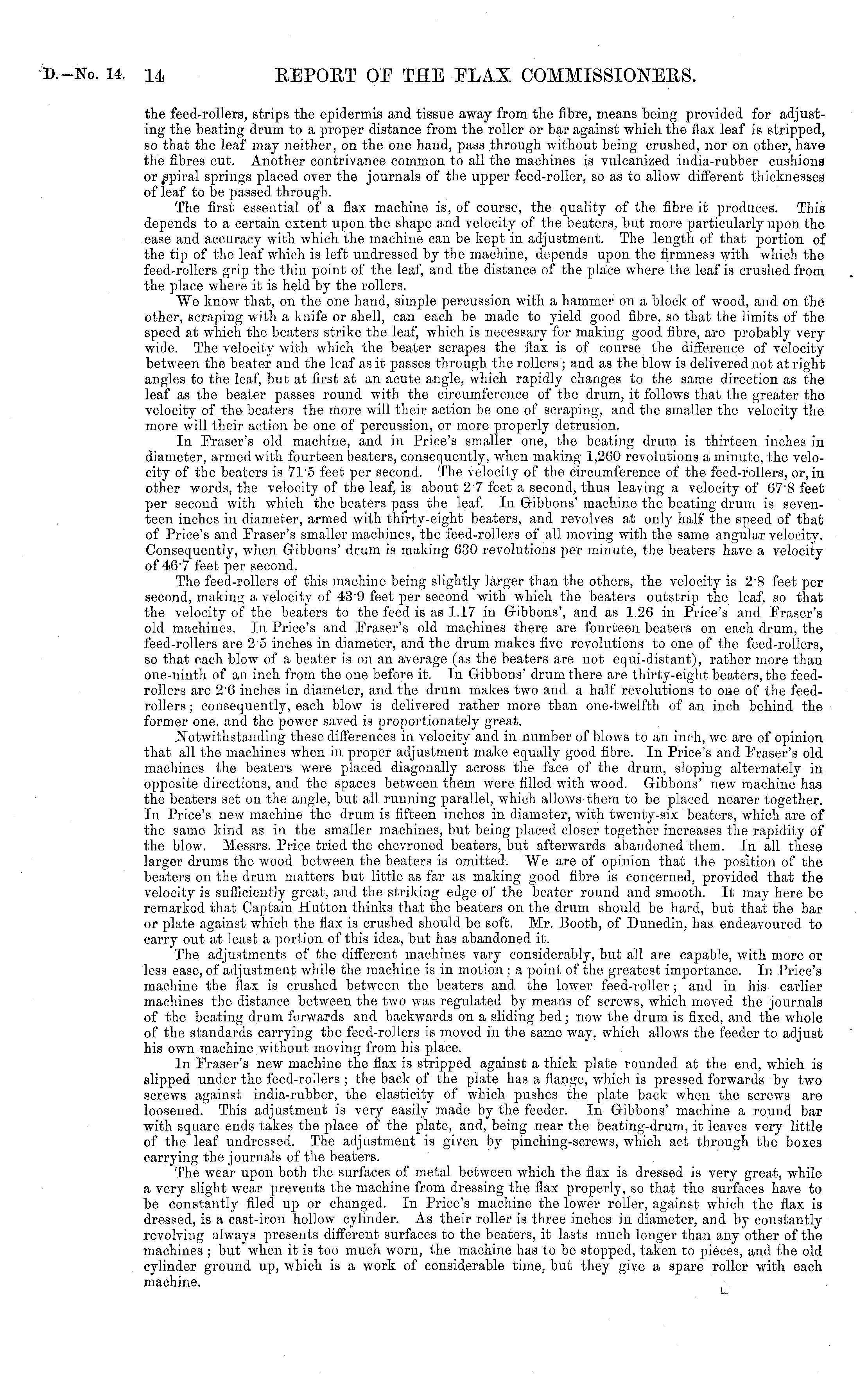 the feed-rollers, strips the epidermis and tissue away from the fibre, means being provided for adjusting the beating drum to a proper distance from the roller or bar against which the flax leaf is stripped, so that the leaf may neither, on the one hand, pass through without being crushed, nor on other, have the fibres cut. Another contrivance common to all the machines is vulcanized india-rubber cushions or spiral springs placed over the journals of the upper feed-roller, so as to allow different thicknesses of leaf to be passed through. The first essential of a flax machine is, of course, the quality of the fibre it produces. This depends to a certain extent upon the shape and velocity of the beaters, but more particularly upon the ease and accuracy with which the machine can be kept in adjustment. The length of that portion of the tip of the leaf which is left undressed by the machine, depends upon the firmness with which the feed-rollers grip the thin point of the leaf, and the distance of tho place where the leaf is crushed from the place where it is held by the rollers. We know that, on the one hand, simple percussion with a hammer on a block of wood, and on the other, scraping with a knife or shell, can each be made to yield good fibre, so that the limits of the speed at which the beaters strike the leaf, which is necessary for making good fibre, are probably very wide. The velocity with which the beater scrapes the flax is of course the difference of velocity between the beater and the leaf as it passes through tho rollers ; and as the blow is delivered not at right angles to the leaf, but at first at an acute angle, which rapidly changes to the same direction as the leaf as the beater passes round with the circumference of the drum, it follows that the greater the velocity of tho beaters the more will their action be one of scraping, and the smaller the velocity the more will their action be one of percussion, or more properly dctrusion. In Fraser's old machine, and in Price's smaller one, the beating drum is thirteen inches in diameter, armed with fourteen beaters, consequently, when making 1,260 revolutions a minute, the velocity of the beaters is 715 feet per second. The velocity of the circumference of the feed-rollers, or, in other words, the velocity of the leaf is about 2*7 feet a second, thus leaving a velocity of 678 feet per second with which the beaters pass the leaf. In Gibbons' machine the beating drum is seventeen inches in diameter, armed with thirty-eight beaters, and revolves at only half the speed of that of Price's and Fraser's smaller machines, the feed-rollers of all moving with the same angular velocity. Consequently, when Gibbons' drum is making 630 revolutions per minute, the beaters have a velocity of 4(5-7 feet per second. The feed-rollers of this machine being slightly larger than the others, the velocity is 2'B feet per second, making a velocity of 439 feet per second with which the beaters outstrip the leaf, so that the velocity of the beaters to the feed is as 1.17 in Gibbons', and as 1.26 in Price's and Fraser's old machines. In Price's and Fraser's old machines there are fourteen beaters on each drum, the feed-rollers are 25 inches in diameter, and the drum makes five revolutions to one of the feed-rollers, so that each blow of a beater is on an average (as the beaters are not equi-distant), rather more than one-ninth of an inch from the one before it. In Gibbons' drum there are thirty-eight beaters, the feedrollers are 26 inches in diameter, and the drum makes two and a half revolutions to one of the feedrollers ; consequently, each blow is delivered rather more than one-twelfth of an inch behind the former one, and the power saved is proportionivtely great. Notwithstanding these differences in velocity and in number of blows to an inch, we are of opinion that all the machines when in proper adjustment make equally good fibre. In Price's and Fraser's old machines the beaters were placed diagonally across the face of the drum, sloping alternately in opposite directions, and the spaces between them were filled with wood. Gibbons' new machine has the beaters set on the angle, but all running parallel, which allows them to be placed nearer together. In Price's new machine the drum is fifteen inches in diameter, with twenty-six beaters, which are of the same kind as in the smaller machines, but being placed closer together increases the rapidity of the blow. Messrs. Price tried the chevroned beaters, but afterwards abandoned them. In all these larger drums the wood between the beaters is omitted. We are of opinion that the position of the beaters on the drum matters but little as far as making good fibre is concerned, provided that the velocity is sufficiently great, and the striking edge of tho beater round and smooth. It may here be remarked that Captain Hutton thinks that the beaters on the drum should be hard, but that the bar or plate against which the flax is crushed should be soft. Mr. Booth, of Dunedin, has endeavoured to carry out at least a portion of this idea, but has abandoned it. The adjustments of the different machines vary considerably, but all are capable, with more or less ease, of adjustment while the machine is in motion ; a point of the greatest importance. In Price's machine the flax is crushed between the beaters and the lower feed-roller; and in his earlier machines the distance between the two was regulated by means of screws, which moved the journals of the beating drum forwards and backwards on a sliding bed; now the drum is fixed, and the whole of the standards carrying the feed-rollers is moved in the same way, which allows the feeder to adjust his own machine without moving from his place. In Fraser's new machine the flax is stripped against a thick plate rounded at the end, which is slipped under the feed-rollers ; the back of the plate has a flange, which is pressed forwards by two screws against india-rubber, the elas