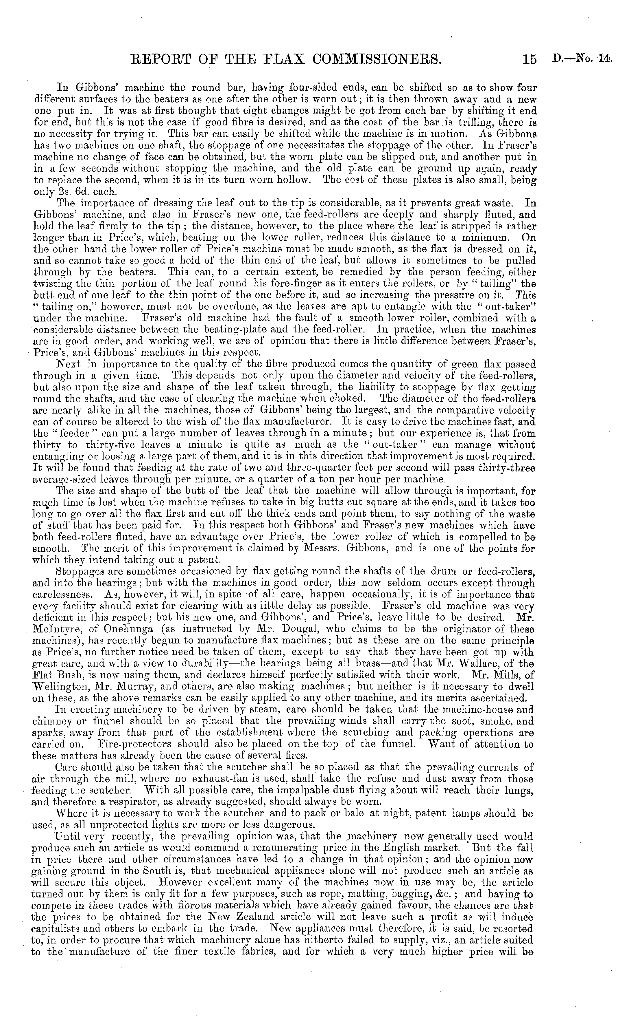 In Gibbons' machine the round bar, having four-sided ends, can be shifted so as to show four different surfaces to the beaters as one after the other is worn out; it is then thrown away and a new one put in. It was at first thought that eight changes might be got from each bar by shifting it end for end, but this is not the case if good fibre is desired, and as the cost of the bar is trifling, there is no necessity for trying it. This bar can easily be shifted while the machine is in motion. As Gibbons has two machines on one shaft, the stoppage of one necessitates the stoppage of tho other. In Fraser's machine no change of face can be obtained, but the worn plate can be slipped out, and another put in in a few seconds without stopping the machine, and the old plate can be ground up again, ready to replace the second, when it is in its turn worn hollow. The cost of these plates is also small, being only 2s. 6d. each. The importance of dressing the leaf out to the tip is considerable, as it prevents great waste. In Gibbons' machine, and also in Fraser's new one, the feed-rollers are deeply and sharply fluted, and hold the leaf firmly to the tip ; the distance, however, to the place where the leaf is stripped is rather longer than in Price's, which, beating on tho lower roller, reduces this distance to a minimum. On the other hand the lower roller of Price's machine must be made smooth, as the flax is dressed on it, and so cannot take so good a hold of the thin end of the leaf, but allows it sometimes to be pulled through by the beaters. This can, to a certain extent, be remedied by the person feeding, either twisting the thin portion of the leaf round his fore-finger as it enters the rollers, or by " tailing" the butt end of one leaf to the thin point of the one before it, and so increasing the pressure on it. This " tailing on," however, must not be overdone, as the leaves are apt to entangle with the " out-taker" under the machine. Fraser's old machine had the fault of a smooth lower roller, combined with a considerable distance between the beating-plate and the feed-roller. In practice, when the machines are in good order, and working well, we are of opinion that there is little difference between Fraser's, Price's, and Gibbons' machines in this respect. Next in importance to the quality of the fibre produced comes the quantity of green flax passed through in a given time. This depends not only upon the diameter and velocity of the feed-rollers, but also upon the size and shape of the leaf taken through, the liability to stoppage by flax getting round the shafts, and the ease of clearing tho machine when choked. The diameter of the feed-rollers are nearly alike in all the machines, those of Gibbons' being the largest, and the comparative velocity can of course be altered to the wish of the flax manufacturer. It is easy to drive the machines fast, and the " feeder " can put a largo number of leaves through in a minute ; but our experience is, that from thirty to thirty-five leaves a minute is quite as much as the "out-taker" can manage without entangling or loosing a large part of them, and it is in this direction that improvement is most required. It will be found that feeding at the rate of two and three-quarter feet per second will pass thirty-three average-sized leaves through per minute, or a quarter of a ton per hour per machine. The size and shape of the butt of the leaf that the machine will allow through is important, for much time is lost when tho machine refuses to take in big butts cut square at the ends, and it takes too long to go over all the flax first and cut off the thick ends and point them, to say nothing of the waste of stuff that has been paid for. In this respect both Gibbons' and Fraser's new machines which have both feed-rollers fluted, have an advantage over Price's, the lower roller of which is compelled to be smooth. The merit of this improvement is claimed by Messrs. Gibbons, and is one of the points for which they intend taking out a patent. Stoppages are sometimes occasioned by flax getting round the shafts of the drum or feed-rollers, and into the bearings; but with the machines in good order, this now seldom occurs except through carelessness. As, however, it will, in spite of all care, happen occasionally, it is of importance that every facility should exist for clearing with as little delay as possible. Fraser's old machine was very deficient in this respect; but his new one, and Gibbons', and Price's, leave little to be desired. Mr. Mclntyre, of Onehunga (as instructed by Mr. Dougal, who claims to be the originator of these machines), has recently begun to manufacture flax machines; but as these are on the same principle as Price's, no further notice need be taken of them, except to say that they have been got up with great care, and with a view to durability—the bearings being all brass —and that Mr. Wallace, of the Flat Bush, is now using them, and declares himself perfectly satisfied with their work. Mr. Mills, of Wellington, Mr. Murray, and others, are also making machines ; but neither is it necessary to dwell on these, as the above remarks can be easily applied to any other machine, and its merits ascertained. In erecting machinery to be driven by steam, care should be taken that the machine-house and chimney or funnel should bo so placed that the prevailing winds shall carry the soot, smoke, and sparks, away from that part of the establishment where the scutching and packing operations are carried on. Fire-protectors should also bo placed on the top of the funnel. Want of attention to these matters has already been the cause of several fires. Care should also be taken that the scutcher shall be so placed as that the prevailing currents of air through the mill, where no exhaust-fan is used, shall take the refuse and dust away from those feeding the scutcher. With all possible care, the impalpable dust flying about will reach their lungs, and