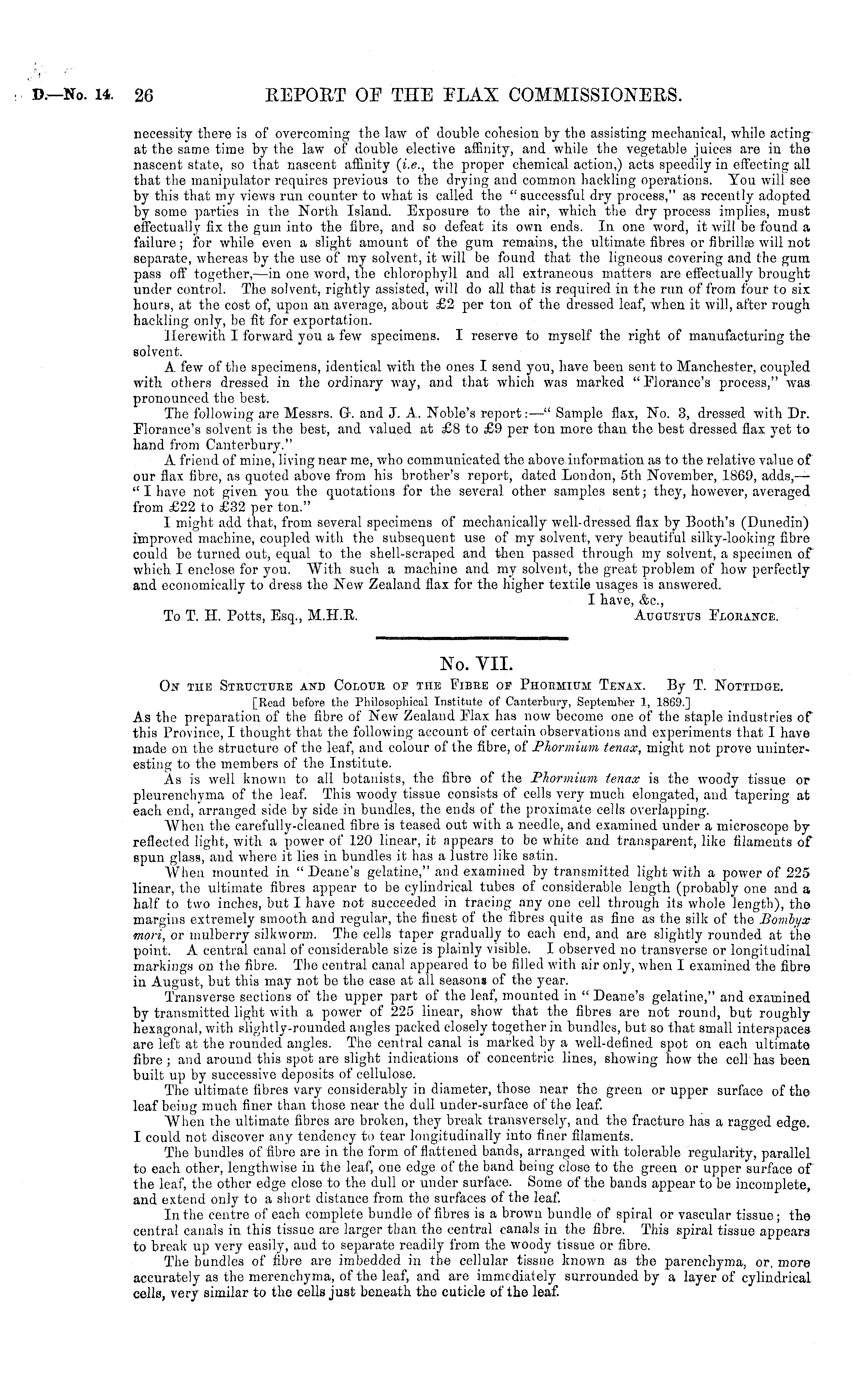 necessity there is of overcoming the law of double cohesion by the assisting mechanical, while acting at the same time by the law of double elective affinity, and while the vegetable juices are in the nascent state, so that nascent affinity (i.e., the proper chemical action,) acts speedily in effecting all that the manipulator requires previous to the drying and common hackling operations. Tou will see by this that my views run counter to what is called the "successful dry process," as recently adopted by some parties in the North Island. Exposure to the air, which the dry process implies, must effectually fix the gum into the fibre, and so defeat its own ends. In one word, it will be found a failure; for while even a slight amount of the gum remains, the ultimate fibres or fibrillse will not separate, whereas by the use of my solvent, it will be found that the ligneous covering and the gum pass off together, —in one word, the chlorophyll and all extraneous matters are effectually brought under control. The solvent, rightly assisted, will do all that is required in the run of from four to six hours, at the cost of, upon an average, about £2 per ton of the dressed leaf, when it will, after rough hackling only, be fit for exportation. Herewith I forward you a few specimens. I reserve to myself the right of manufacturing the solvent. A. few of the specimens, identical with the ones I send you, have been sent to Manchester, coupled with others dressed in the ordinary way, and that which was marked " Florance's process," was pronounced the best. The following are Messrs. G. and J. A. Noble's report:—" Sample flax, No. 3, dressed with Dr. Florance's solvent is the best, and valued at £8 to £9 per ton more than the best dressed flax yet to hand from Canterbury." A friend of mine, living near me, who communicated the above information as to the relative value of our flax fibre, as quoted above from his brother's report, dated London, sth November, 1869, adds, — " I have not given you the quotations for the several other samples sent; they, however, averaged from £22 to £32 per ton." I might add that, from several specimens of mechanically well-dressed flax by Booth's (Dunedin) improved machine, coupled with the subsequent use of my solvent, very beautiful silky-looking fibre could be turned out, equal to the shell-scraped and then passed through my solvent, a specimen of which I enclose for you. With such a machine and my solvent, the great problem of how perfectly and economically to dress the New Zealand flax for the higher textile usages is answered. I have, Ac, To T. 11. Potts, Esq., M.H.R. Augustus Florance.