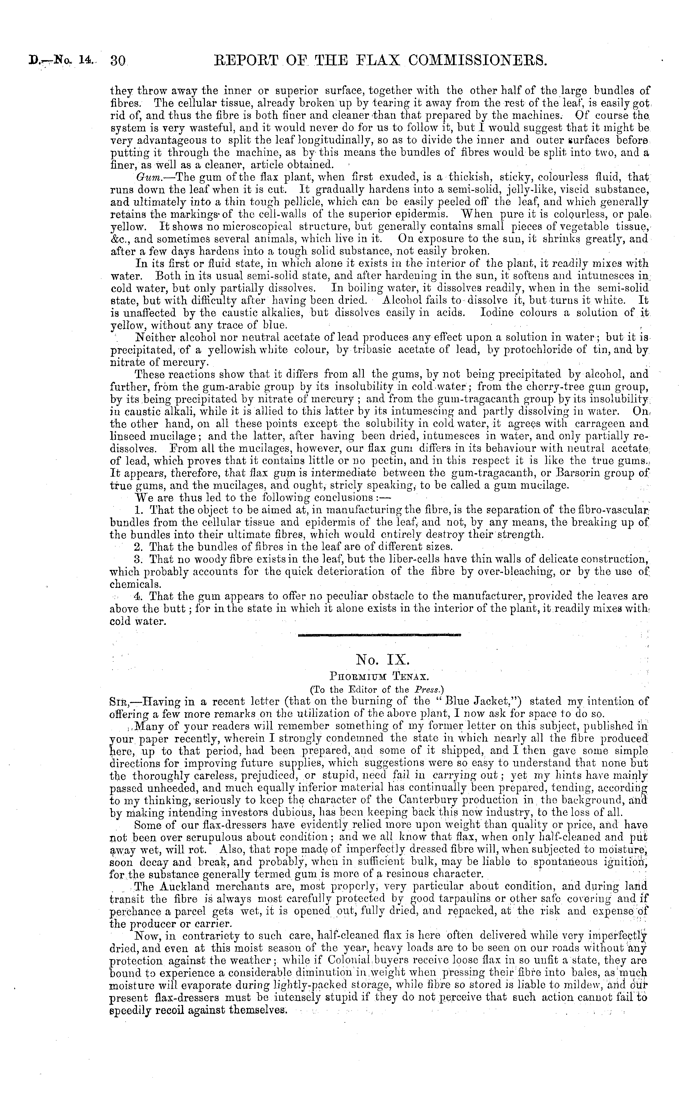 No. IX. Phormium Tenax. (To the Editor of the Press.) Sir, —Having in a recent letter (that on the burning of the " Blue Jacket,") stated my intention of offering a few more remarks on the utilization of the above plant, I now ask for space to do so. ,Many of your readers will remember something of my former letter on this subject, published in your paper recently, wherein I strongly condemned the state in which nearly all the fibre produced here, up to that period, had been prepared, and some of it shipped, and I then gave some simple directions for improving future supplies, which suggestions were so easy to understand that none but the thoroughly careless, prejudiced, or stupid, need fail in carrying out; yet my hints have mainly passed unheeded, and much equally inferior material has continually been prepared, tending, according to my thinking, seriously to keep the character of the Canterbury production in tho background, and by making intending investors dubious, has been keeping back this new industry, to the loss of all. Some of our flax-dressers have evidently relied more upon weight than quality or price, and have not been over scrupulous about condition; and we all know that flax, when only half-cleaned and put away wet, will rot. Also, that rope made of imperfectly dressed fibre will, when subjected to moisture, soon decay and break, and probably, when in sufficient bulk, may be liable to spontaneous ignition, for the substance generally termed gum is more of a resinous character. The Auckland merchants are, most properly, very particular about condition, and during land transit the fibre is always most carefully protected by good tarpaulins or other safe covering and if perchance a parcel gets wet, it is opened out, fully dried, and repacked, at the risk and expense of the producer or carrier. Now, in contrariety to such care, half-cleaned flax is here often delivered while very imperfectly dried, and even at this moist season of the year, heavy loads are to be seen on our roads without any protection against the weather; while if Colonial buyers receive loose flax in so unfit a state, they are bound to experience a considerable diminution in weight when pressing their fibre into bales, as'much moisture will evaporate during lightly-packed storage, while fibre so stored is liable to mildew, arid1 dur present flax-dressers must be intensely stupid if they do not perceive that such action cannot fail to speedily recoil against themselves.