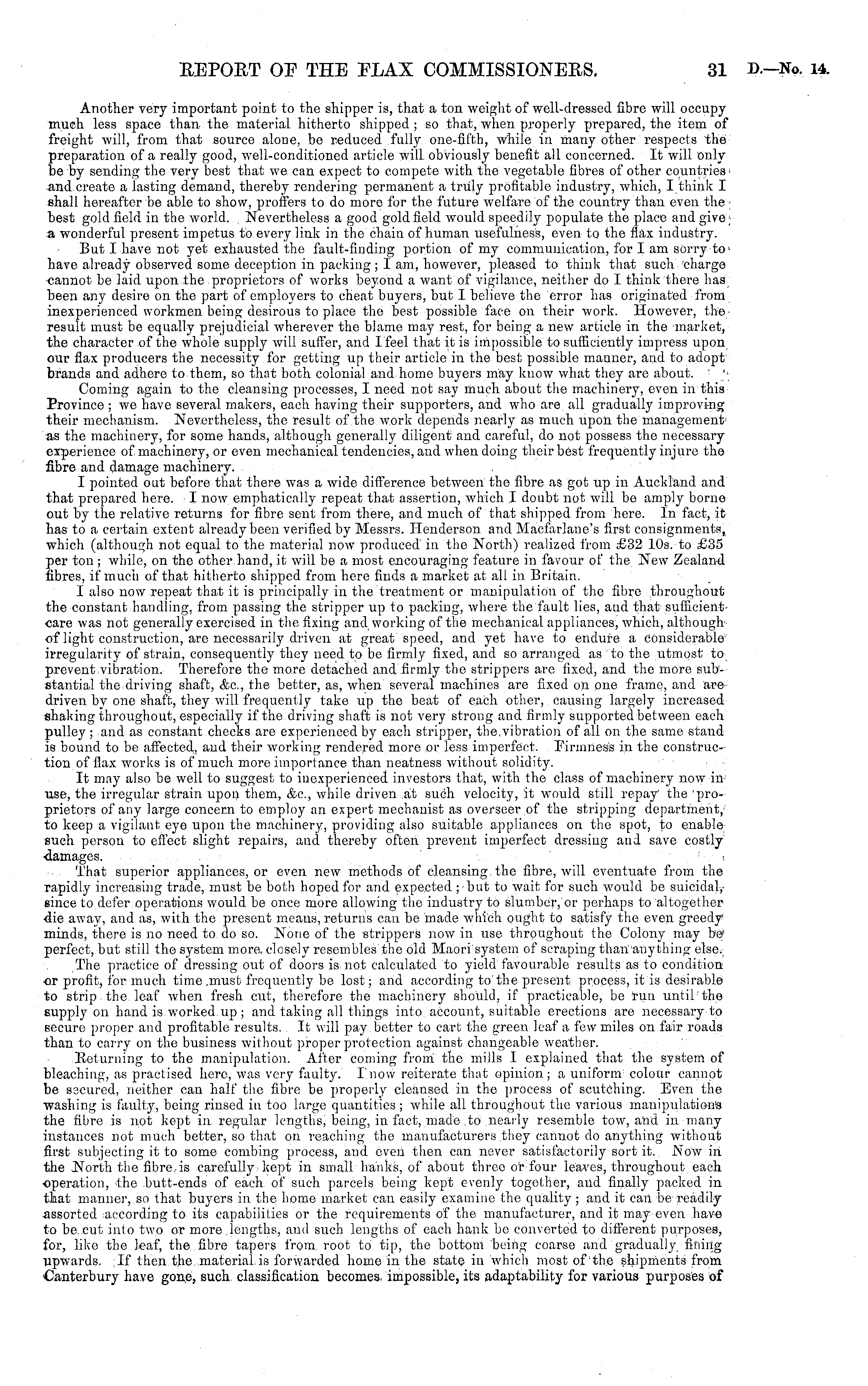 Another very important point to the shipper is, that a ton weight of well-dressed fibre will occupy much less space than the material hitherto shipped ; so that, when properly prepared, the item of freight will, from that source alone, be reduced fully one-fifth, while in many other respects the preparation of a really good, well-conditioned article will obviously benefit all concerned. It will only be by sending the very best that we can expect to compete with the vegetable fibres of other countries and create a lasting demand, thereby rendering permanent a truly profitable industry, which, I think I shall hereafter be able to show, proffers to do more for the future welfare of tho country than even the best gold field in the world. Nevertheless a good gold field would speedily populate the place and give a wonderful present impetus to every link in the chain of human usefulness, even to the flax industry. But I have not yet exhausted the fault-finding portion of my communication, for I am sorry tohave already observed some deception in packing; I am, however, pleased to think that such charge cannot be laid upon the proprietors of works beyond a want of vigilance, neither do I think there has been any desire on the part of employers to cheat buyers, but I believe the error has originated from inexperienced workmen being desirous to place the best possible face on their work. However, the result must be equally prejudicial wherever the blame may rest, for being a new article in the market, the character of the whole supply will suffer, and I feel that it is impossible to sufficiently impress upon our flax producers the necessity for getting up their article in the best possible manner, and to adopt brands and adhere to them, so that both colonial and home buyers may know what they are about. Coming again to the cleansing processes, I need not say much about the machinery, even in this Province ; we have several makers, each having their supporters, and who are all gradually improving their mechanism. Nevertheless, the result of the work depends nearly as much upon the management' as the machinery, for some hands, Halthough generally diligent and careful, do not possess the necessary experience of machinery, or even mechanical tendencies, and when doing their best frequently injure the fibre and damage machinery. I pointed out before that there was a wide difference between the fibre as got up in Auckland and that prepared here. I now emphatically repeat that assertion, which I doubt not will be amply borne out by the relative returns for fibre sent from there, and much of that shipped from here. In fact, it has to a certain extent already been verified by Messrs. Henderson and Macfarlane's first consignments, which (although not equal to the material, now produced in the North) realized from £32 10s. to £35 per ton ; while, on the other hand, it will be a most encouraging feature in favour of the New Zealand fibres, if much of that hitherto shipped from here finds a market at all in Britain. I also now repeat that it is principally in the treatment or manipulation of the fibre throughout the constant handling, from passing the stripper up to packing, where the fault lies, and that sufficient care was not generally exercised in the fixing and working of the mechanical appliances, which, although of light construction, are necessarily driven at great speed, and yet have to endure a considerable irregularity of strain, consequently they need to be firmly fixed, and so arranged as to the utmost to prevent vibration. Therefore the more detached and firmly the strippers are fixed, and the more substantial the driving shaft, &c, the better, as, when several machines are fixed on one frame, and are driven by one shaft, they will frequently take up the beat of each other, causing largely increased shaking throughout, especially if the driving shaft is not very strong and firmly supported between each pulley ; and as constant checks are experienced by each stripper, the .vibration of all on the same stand is bound to be affected, and their working rendered more or less imperfect. Firmness in the construction of flax works is of much more importance than neatness without solidity. It may also be well to suggest to inexperienced investors that, with the class of machinery now in use, the irregular strain upon them, &o, while driven at such velocity, it would still repay the proprietors of any large concern to employ an expert mechanist as overseer of the stripping department, to keep a vigilant eye upon the machinery, providing also suitable appliances on the spot, to enable such person to effect slight repairs, and thereby often prevent imperfect dressing and save costly damages. i That superior appliances, or even new methods of cleansing the fibre, will eventuate from the rapidly increasing trade, must be both hoped for and expected ; but to wait for such would be suicidal,since to defer operations would be once more allowing the industry to slumber, or perhaps to altogether die away, and as, with the present means, returns can be made which ought to satisfy the even greedy minds, there is no need to do so. None of the strippers now in use throughout tho Colony may bo perfect, but still the system more, closely resembles the old Maori system of scraping thairauy thing else. The practice of dressing out of doors is not calculated to yield favourable results as to condition ■or profit, for much time .must frequently be lost; and according to the present process, it is desirable to strip the leaf when fresh cut, therefore the machinery should, if practicable, be ruu until the supply on hand is worked up; and taking all things into account, suitable erections are necessary to secure proper and profitable results. It will pay better to cart the green leaf a few miles on fair roads than to carry on the business without proper protection against changeable weather. Returning to the manipulation. Af