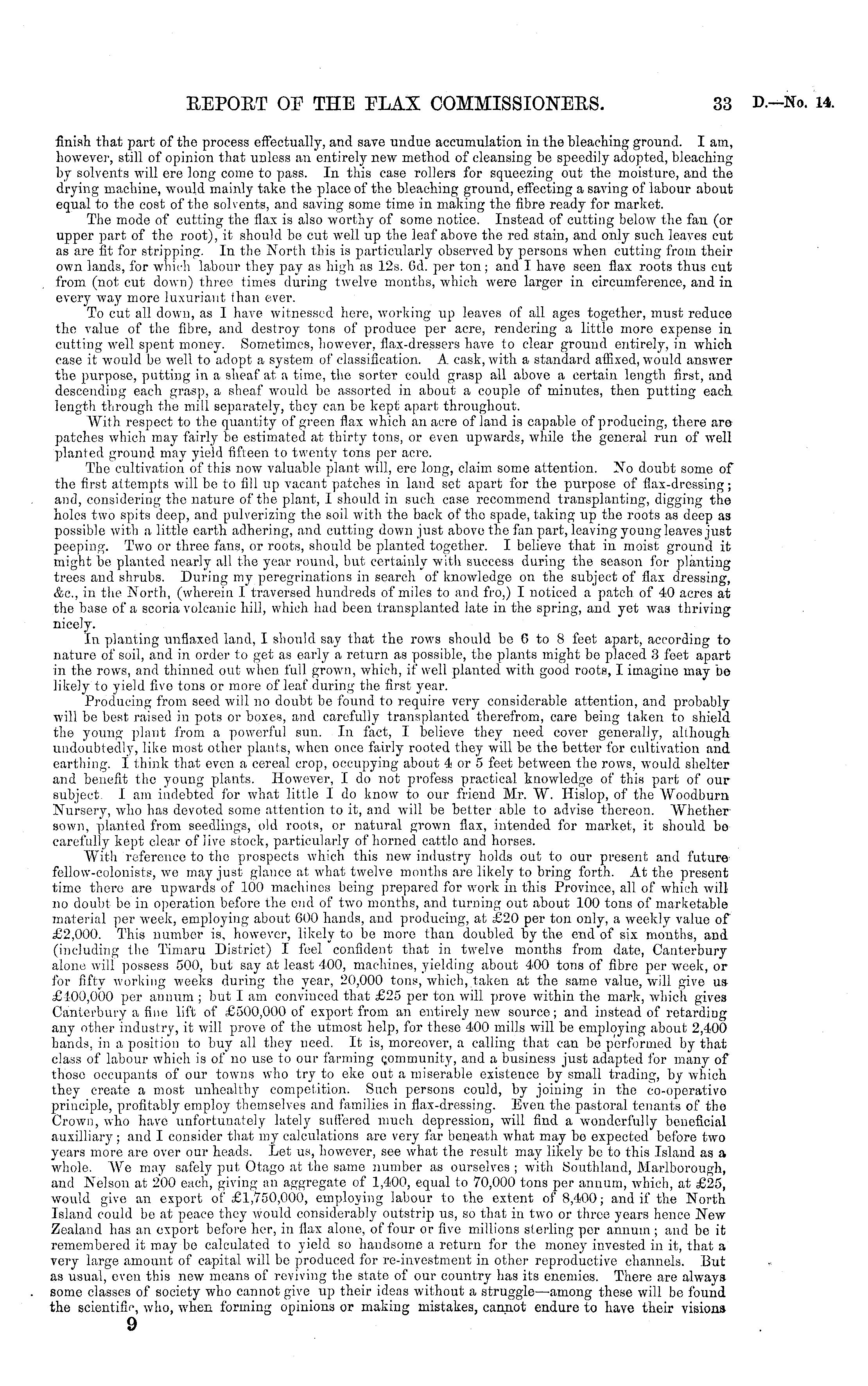 finish that part of tho process effectually, and save undue accumulation in tho bleaching ground. I am, however, still of opinion that unless an entirely new method of cleansing be speedily adopted, bleaching by solvents will ere long come to pass. In this case rollers for squeezing out the moisture, and the drying machine, would mainly take the place of the bleaching ground, effecting a saving of labour about equal to the cost of the solvents, and saving some time in making the fibre ready for market. The mode of cutting the flax is also worthy of some notice. Instead of cutting below the fan (or upper part of the root), it should be cut well up the leaf above the red stain, and only such leaves cut as are fit for stripping. In the North this is particularly observed by persons when cutting from their own lands, for which labour they pay as high as 12s. Od. per ton; and I have seen flax roots thus cut from (not cut down) threo times during twelve months, which were larger in circumference, and in every way more luxuriant than ever. To cut all down, as I have witnessed here, working up leaves of all. ages together, must reduce the value of the fibre, and destroy tons of produce per acre, rendering a little more expense in cutting well spent money. Sometimes, however, flax-dressers have to clear ground entirely, in which case it would bo well to adopt a system of classification. A cask, with a standard affixed, would answer the purpose, putting in a sheaf at a time, the sorter could grasp all above a certain length first, and descending each grasp, a sheaf would be assorted in about a couple of minutes, then putting each length through the mill separately, they can be kept apart throughout. With respect to the quantity of green flax which an acre of land is capable of producing, there are patches which may fairly be estimated at thirty tons, or even upwards, while the general run of well planted ground may yield fifteen to twenty tons per acre. Tho cultivation of this now valuable plant will, ere long, claim some attention. No doubt some of the first attempts will be to fill up vacant patches in land set apart for the purpose of flax-dressing; and, considering the nature of the plant, I should in such case recommend transplanting, digging the holes two spits deep, and pulverizing the soil with the back of the spade, taking up the roots as deep as possible with a little earth adhering, and cutting down just above the fan part, leaving young leaves just peeping. Two or three fans, or roots, should be planted together. I believe that in moist ground it might be planted nearly all the year round, but certainly with success during the season for planting trees and shrubs. During my peregrimations in search of knowledge on tho subject of flax dressing, &c, in the North, (wherein I traversed hundreds of miles to and fro,) I noticed a patch of 40 acres at the base of a scoria volcanic hill, which had been transplanted late in tho spring, and yet was thriving nicely. In planting unflaxod land, I should say that the rows should be 6 to 8 feet apart, according to nature of soil, and in order to get as early a return as possible, the plants might be placed 3 feet apart in the rows, and thinned out when full grown, which, if well planted with good roots, I imagine may be likely to yield five tons or more of leaf during the first year. Producing from seed will no doubt be found to require very considerable attention, and probably will be best raised in pots or boxes, and carefully transplanted therefrom, care being taken to shield the young plant from a powerful sun. In fact, I believe they need cover generally, although undoubtedly, like most other plants, when once fairly rooted they will be the better for cultivation and earthing. I think that even a cereal crop, occupying about 4 or 5 feet between the rows, would shelter and benefit tho young plants. However, I do not profess practical knowledge of this part of our subject lam indebted for what little Ido know to our friend Mr. W. Hislop, of the Woodburn Nursery, who has devoted some attention to it, and will be better able to advise thereon. Whether sown, planted from seedlings, old roots, or natural grown flax, intended for market, it should be carefully kept clear of live stock, particularly of horned cattle and horses. With reference to the prospects which this new industry holds out to our present and future fellow-colonists, we may just glance at what twelve months are likely to bring forth. At the present time there aro upwards of 100 machines being prepared for work in this Province, all of which will no doubt bo in operation before the end of two months, and turning out about 100 tons of marketable material per week, employing about 600 hands, and producing, at £20 per ton only, a weekly value of £2,000. This number is, however, likely to be more than doubled by the end of six months, and (including the Timaru District) I feel confident that in twelve months from date, Canterbury alone will possess 500, but say at least 400, machines, yielding about 400 tons of fibre per week, or for fifty working weeks during the year, 20,000 tons, which, taken at the same value, will give us £100,000 per annum ; but I am convinced that £25 per ton will prove within the mark, which gives Canterbury a fine lift of £500,000 of export from an entirely new source; and instead of retarding any other industry, it will prove of the utmost help, for these 400 mills will be employing .about 2,400 hands, in a position to buy all they need. It is, moreover, a calling that can be performed by that class of labour which is of no use to our farming community, and a business just adapted for many of those occupants of our towns who try to eke out a miserable existence by small trading, by which they create a most unhealthy competition. Such persons could, by joining in the co-operativo principle, profitably employ themselves and families in flax-dressing. Even the 