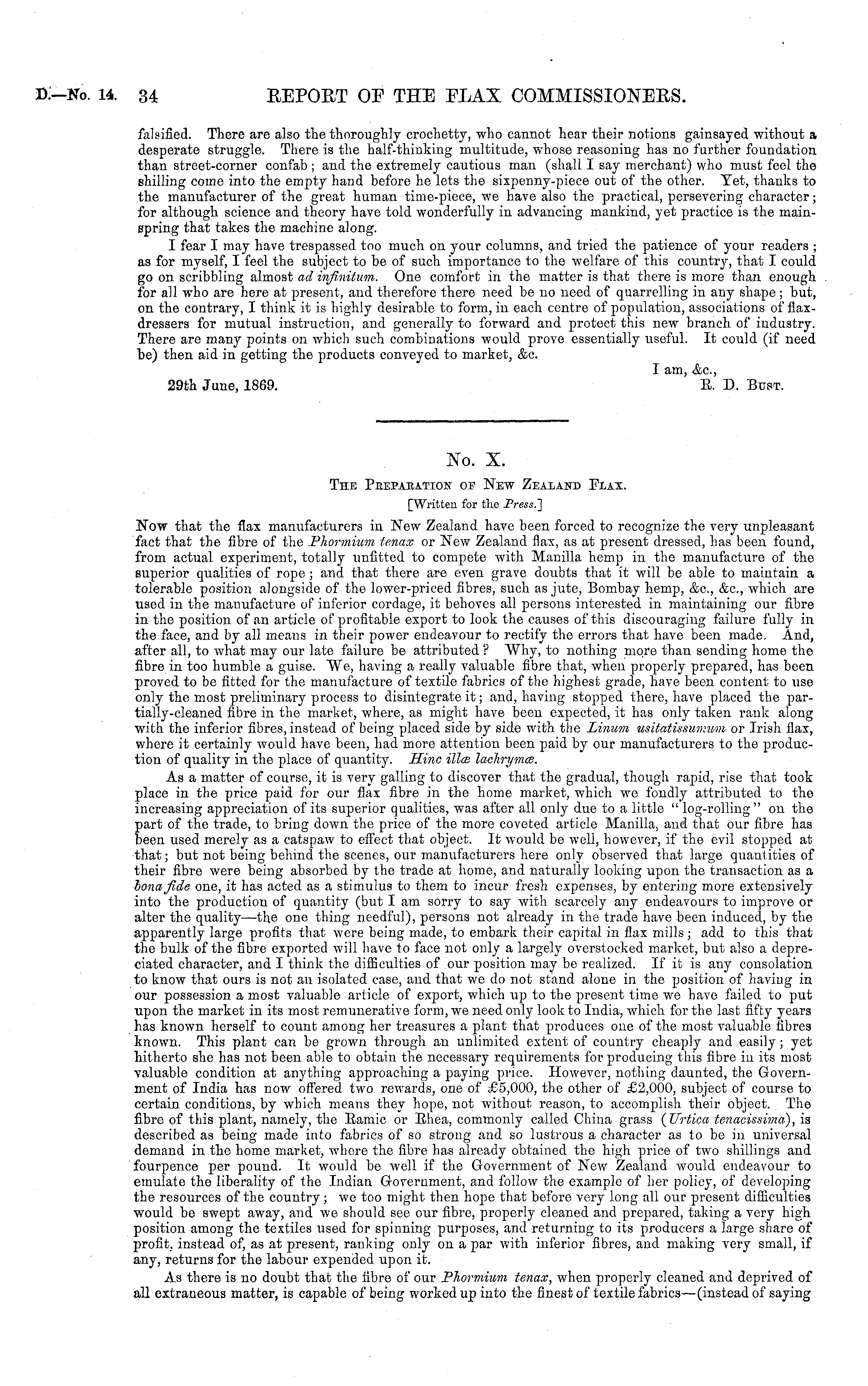 No. X. The Preparation op New Zealand Flax. [Written for the Press.^ Now that the flax manufacturers in New Zealand have been forced to recognize the very unpleasant fact that the fibre of the Phormium tenax or New Zealand flax, as at present dressed, has been found, from actual experiment, totally unfitted to compete with Manilla hemp in the manufacture of the superior qualities of rope ; and that there are even grave doubts that it will be able to maintain a tolerable position alongside of the lower-priced fibres, such as jute, Bombay hemp, &c, &c, which are used in the manufacture of inferior cordage, it behoves all persons interested in maintaining our fibre in the position of an article of profitable export to look the causes of this discouraging failure fully in the face, and by all means in their power endeavour to rectify the errors that have been made. And, after all, to what may our late failure be attributed ? Why, to nothing more than sending home the fibre in too humble a guise. We, having a really valuable fibre that, when properly prepared, has been proved to be fitted for the manufacture of textile fabrics of the highest grade, have been content to use only the most preliminary process to disintegrate it; and, having stopped there, have placed the par-tially-cleaned fibre in the market, where, as might have been expected, it has only taken rank along with the inferior fibres, instead of being placed side by side with the Linum tisitatissumum or Irish flax, where it certainly would have been, had more attention been paid by our manufacturers to the production of quality in the place of quantity. Hinc Mm lachrymce. As a matter of course, it is very galling to discover that the gradual, though rapid, rise that took place in the price paid for our flax fibre in the home market, which we fondly attributed to the increasing appreciation of its superior qualities, was after all only due to a little " log-rolling" on the part of the trade, to bring down the price of the more coveted article Manilla, and that our fibre has been used merely as a catspaw to effect that object. It would be well, however, if the evil stopped at that; but not being behind the scenes, our manufacturers here only observed that large quantities of their fibre were being absorbed by the trade at home, and naturally looking upon the transaction as a bona fide one, it has acted as a stimulus to them to incur fresh expenses, by entering more extensively into the production of quantity (but I am sorry to say with scarcely any endeavours to improve or alter the quality—the one thing needful), persons not already in the trade have been induced, by the apparently large profits that were being made, to embark their capital in flax mills ; add to this that the bulk of the fibre exported will have to face not only a largely overstocked market, but also a depreciated character, and I think the difficulties of our position may be realized. If it is any consolation to know that ours is not an isolated case, and that we do not stand alone in the position of having in our possession a most valuable article of export, which up to the present time we have failed to put upon the market in its most remunerative form, we need only look to India, which for the last fifty years has known herself to count among her treasures a plant that produces one of the most valuable fibres known. This plant can be grown through an unlimited extent of country cheaply and easily; yet hitherto she has not been able to obtain the necessary requirements for producing this fibre in its most valuable condition at anything approaching a paying price. However, nothing daunted, the Government of India has now offered two rewards, one of £5,000, the other of £2,000, subject of course to certain conditions, by which means they hope, not without reason, to accomplish their object. The fibre of this plant, namely, the Ramie or Rhea, commonly called China grass (Urtica tenacissima), is described as being made into fabrics of so strong and so lustrous a character as to be in universal demand in the home market, where the fibre has already obtained the high price of two shillings and fourponce per pound. It would be well if tho Government of New Zealand would endeavour to emulate the liberality of the Indian Government, and follow the example of her policy, of developing the resources of the country ; we too might then hope that before very long all our present difficulties would be swept away, and we should see our fibre, properly cleaned and prepared, taking a very high position among the textiles used for spinning purposes, and returning to its producers a large share of profit, instead of, as at present, ranking only on a par with inferior fibres, and making very small, if any, returns for the labour expended upon it. As there is no doubt that tho fibre of our Phormium tenax, when properly cleaned and deprived of all extraneous matter, is capable of being worked up into the finest of textile fabrics —(instead of saying