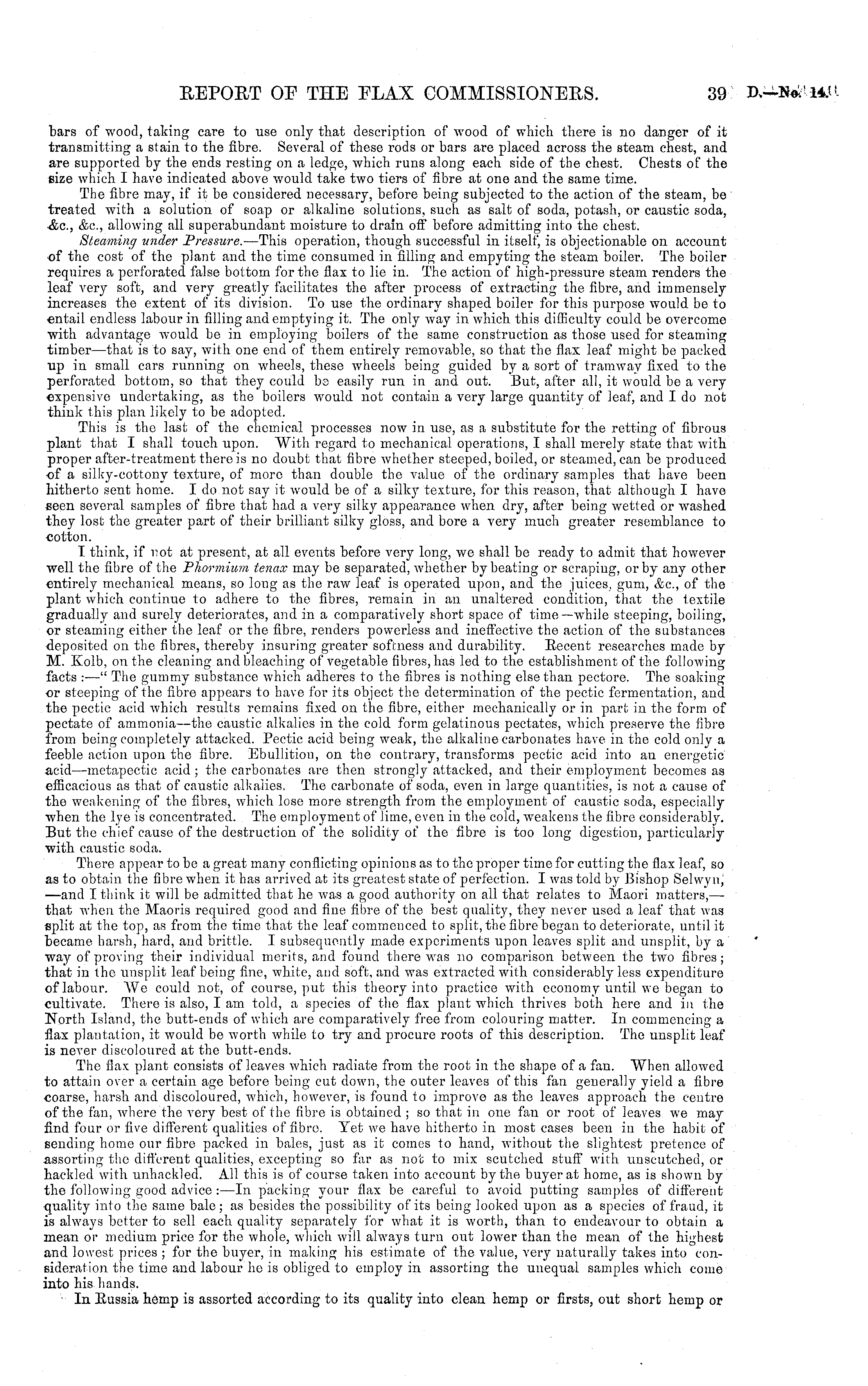 bars of wood, taking care to use only that description of wood of which there is no danger of it transmitting a stain to the fibre. Several of these rods or bars are placed across the steam chest, and are supported by the ends resting on a ledge, which runs along each side of the chest. Chests of the size which I have indicated above would take two tiers of fibre at one and the same time. The fibre may, if it be considered necessary, before being subjected to the action of the steam, be treated with a solution of soap or alkaline solutions, such as salt of soda, potash, or caustic soda, &c, &c, allowing all superabundant moisture to drain off before admitting into the chest. Steaming under Pressure. —This operation, though successful in itself, is objectionable on account of the cost of the plant and the time consumed in filling and empyting the steam boiler. The boiler requires a perforated false bottom for the flax to lie in. The action of high-pressure steam renders the leaf very soft, and very greatly facilitates the after process of extracting the fibre, and immensely increases the extent of its division. To use the ordinary shaped boiler for this purpose would be to entail endless labour in filling and emptying it. The only way in which this difficulty could be overcome with advantage would be in employing boilers of the same construction as those used for steaming timber —that is to say, with one end of them entirely removable, so that the flax leaf might be packed up in small cars running on wheels, these wheels being guided by a sort of tramway fixed to the perforated bottom, so that they could be easily run in and out. But, after all, it would be a very expensive undertaking, as the boilers would not contain a very large quantity of leaf, and I do not think this plan likely to be adopted. This is the last of the chemical processes now in use, as a substitute for the retting of fibrous plant that I shall touch upon. With regard to mechanical operations, I shall merely state that with proper after-treatment there is no doubt that fibre whether steeped, boiled, or steamed, can be produced of a silky-cottony texture, of more than double the value of the ordinary samples that have been hitherto sent home. Ido not say it would be of a silk)' texture, for this reason, that although I have fieen several samples of fibre that had a very silky appearance when dry, after being wetted or washed they lost the greater part of their brilliant silky gloss, and bore a very much greater resemblance to cotton. I think, if not at present, at all events before very long, we shall be ready to admit that however well the fibre of the Phormium tenax may be separated, whether by beating or scraping, or by any other entirely mechanical means, so long as the raw leaf is operated upon, and the juices, gum, &c, of the plant which continue to adhere to the fibres, remain in an unaltered condition, that the textile gradually and surely deteriorates, and in a comparatively short space of time—while steeping, boiling, or steaming either the leaf or the fibre, renders powerless and ineffective the action of the substances deposited on the fibres, thereby insuring greater softness and durability. Becent researches made by M. Kolb, on the cleaning and bleaching of vegetable fibres, has led to the establishment of the following facts : —" The gummy substance which adheres to the fibres is nothing else than pectore. The soaking or steeping of the fibre appears to have for its object the determination of the pcctic fermentation, and the pectic acid which results remains fixed on the fibre, either mechanically or in part in the form of pectate of ammonia—the caustic alkalies in the cold form gelatinous pectates, which preserve the fibre from being completely attacked. Pectic acid being weak, the alkaline carbonates have in the cold only a feeble action upon the fibre. Ebullition, on the contrary, transforms pectic acid into an energetic acid —metapectic acid ; the carbonates arc then strongly attacked, and their employment becomes as efficacious as that of caustic alkalies. The carbonate of soda, even in large quantities, is not a cause of the weakening of the fibres, which lose more strength from the employment of caustic soda, especially when the lye is concentrated. The employment of lime, even in the cold, weakens the fibre considerably. But the chief cause of the destruction of the solidity of the fibre is too long digestion, particularly with caustic soda. There appear to be a great many conflicting opinions as to the proper time for cutting the flax leaf, so as to obtain the fibre when it has arrived at its greatest state of perfection. I was told by Bishop Selwynj —and I think it will be admitted that he was a good authority on all that relates to Maori matters, — that when the Maoris required good and fine fibre of the best quality, they never used a leaf that was split at the top, as from the time that the leaf commenced to split, the fibre began to deteriorate, until it became harsh, hard, and brittle. I subsequently made experiments upon leaves split and unsplit, by a way of proving their individual merits, and found there was no comparison between the two fibres; that in the unsplit leaf being fine, white, and soft, and was extracted with considerably less expenditure of labour. Wo could not, of course, put this theory into practice with economy until we began to cultivate. There is also, lam told, a species of the flax plant which thrives both here and in the North Island, the butt-ends of which are comparatively free from colouring matter. In commencing a flax plantation, it would be worth while to try and procure roots of this description. The unsplit leaf is never discoloured at the butt-ends. The flax plant consists of leaves which radiate from the root in the shape of a fan. When allowed to attain over a certain age before being cut down, the outer leaves of this fan generally yield