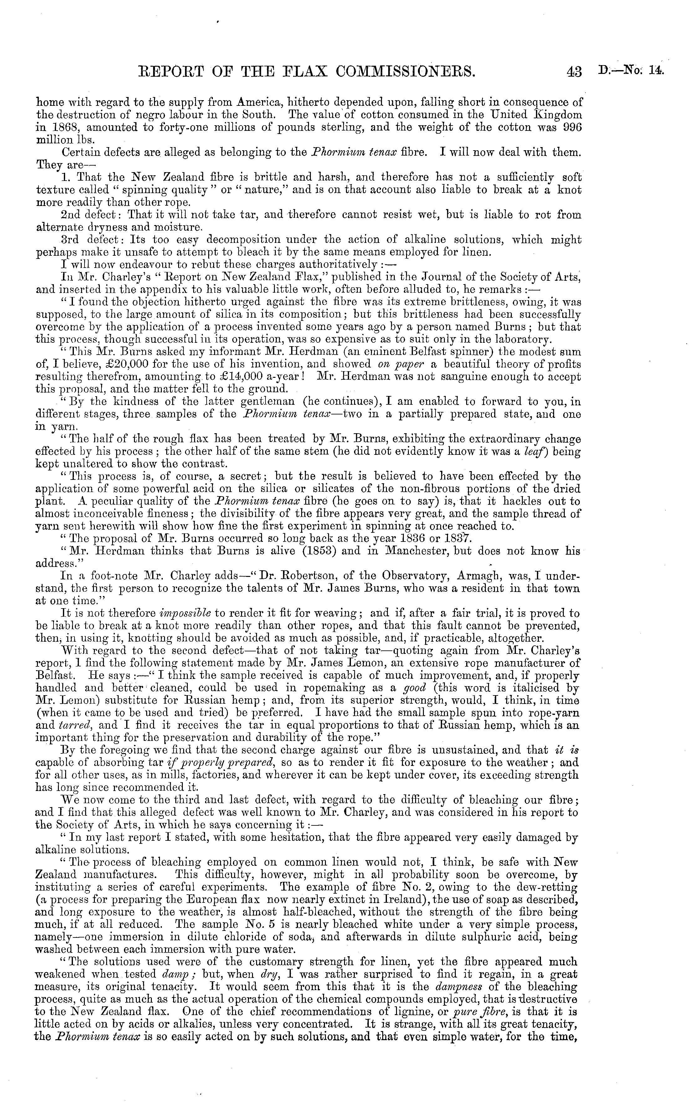 home with regard to the supply from America, hitherto depended upon, falling short in consequence of the destruction of negro labour in the South. The value of cotton consumed in the United Kingdom in 1868, amounted to forty-one millions of pounds sterling, and the weight of the cotton was 996 million lbs. Certain defects are alleged as belonging to the Phormium tenax fibre. I will now deal with them. They are — 1. That the New Zealand fibre is brittle and harsh, and therefore has not a sufficiently soft texture called " spinning quality " or " nature," and is on that account also liable to break at a knot more readily than other rope. 2nd defect: That it will not take tar, and therefore cannot resist wet, but is liable to rot from alternate dryness and moisture. 3rd defect: Its too easy decomposition under the action of alkaline solutions, which might perhaps make it unsafe to attempt to bleach it by the same means employed for linen. I will now endeavour to rebut these charges authoritatively : — In Mr. Charley's " Report on New Zealand Flax," published in the Journal of the Society of Arts, and inserted in the appendix to his valuable little work, often before alluded to, he remarks : — "I found the objection hitherto urged against tho fibre was its extreme brittleness, owing, it was supposed, to the largo amount of silica in its composition; but this brittleness had been successfully overcome by the application of a process invented some years ago by a person named Burns ; but that this process, though successful in its operation, was so expensive as to suit only in the laboratory. " This Mr. Burns asked my informant Mr. Herdman (an eminent Belfast spinner) the modest sum of, I believe, £20,000 for the use of his invention, and showed on paper a beautiful theory of profits resulting therefrom, amounting to £14,000 a-year ! Mr. Herdman was not sanguine enough to accept this proposal, and the matter fell to the ground. "By the kindness of the latter gentleman (he continues), I am enabled to forward to you, in different stages, three samples of the Phormium tenax —two in a partially prepared state, and one in yarn. " The half of the rough flax has been treated by Mr. Burns, exhibiting the extraordinary change effected by his process ; the other half of the same stem (he did not evidently know it was a leaf) being kept unaltered to show the contrast. " This process is, of course, a secret; but the result is believed to have been effected by the application of some powerful acid on the silica or silicates of the non-fibrous portions of the dried plant. A peculiar quality of the Phormium tenax fibre (he goes on to say) is, that it hackles out to almost inconceivable fineness; the divisibility of the fibre appears very great, and the sample thread of yarn sent herewith will show how fine the first experiment in spinning at once reached to. " The proposal of Mr. Burns occurred so long back as the year 1836 or 1837. " Mr. Herdman thinks that Burns is alive (1853) and in Manchester, but does not know his address." In a foot-note Mr. Charley adds—" Dr. Robertson, of the Observatory, Armagh, was, I understand, the first person to recognize the talents of Mr. James Burns, who was a resident in that town at one time." It is not therefore impossible to render it fit for weaving; and if, after a fair trial, it is proved to be liable to break at a knot more readily than other ropes, and that this fault cannot be prevented, then, in using it, knotting should be avoided as much as possible, and, if practicable, altogether. With regard to the second defect —that of not taking tar —quoting again from Mr. Charley's report, 1 find the following statement made by Mr. James Lemon, an extensive rope manufacturer of Belfast. He says : —" I think the sample received is capable of much improvement, and, if properly handled and better cleaned, could be used in ropemaking as a good (this word is italicised by Mr. Lemon) substitute for Russian hemp; and, from its superior strength, would, I think, in time (when it came to be used and tried) be preferred. I have had the small sample spun into rope-yarn and tarred, and I find it receives the tar in equal proportions to that of Russian hemp, wliich is an important thing for the preservation and durability of the rope." By the foregoing we find that the second charge against our fibre is unsustained, and that it is capable of absorbing tar if properly prepared, so as to render it fit for exposure to the weather ; and for all other uses, as in mills, factories, and wherever it can be kept under cover, its exceeding strength has long since recommended it. Wc now come to the third and last defect, with regard to the difficulty of bleaching our fibre; and I find that this alleged defect was well known to Mr. Charley, and was considered in his report to the Society of Arts, in which he says concerning it: — " In my last report I stated, with some hesitation, that the fibre appeared very easily damaged by alkaline solutions. " The process of bleaching employed on common linen would not, I think, be safe with New Zealand manufactures. This difficulty, however, might in all probability soon be overcome, by instituting a series of careful experiments. The example of fibre No. 2, owing to the dew-retting (a process for preparing the European flax now nearly extinct in Ireland), the use of soap as described, and long exposure to tho weather, is almost half-bleached, without the strength of the fibre being much, if at all reduced. The sample No. 5 is nearly bleached white under a very simple process, namely—one immersion in dilute chloride of sodaj and afterwards in dilute sulphuric acid, being washed between each immersion with pure water. " The solutions used were of the customary strength for linen, yet the fibre appeared much weakened when tested damp ; but, when dry, I was rather surprised to find it regain, in a great measure, its original tenacity. It 