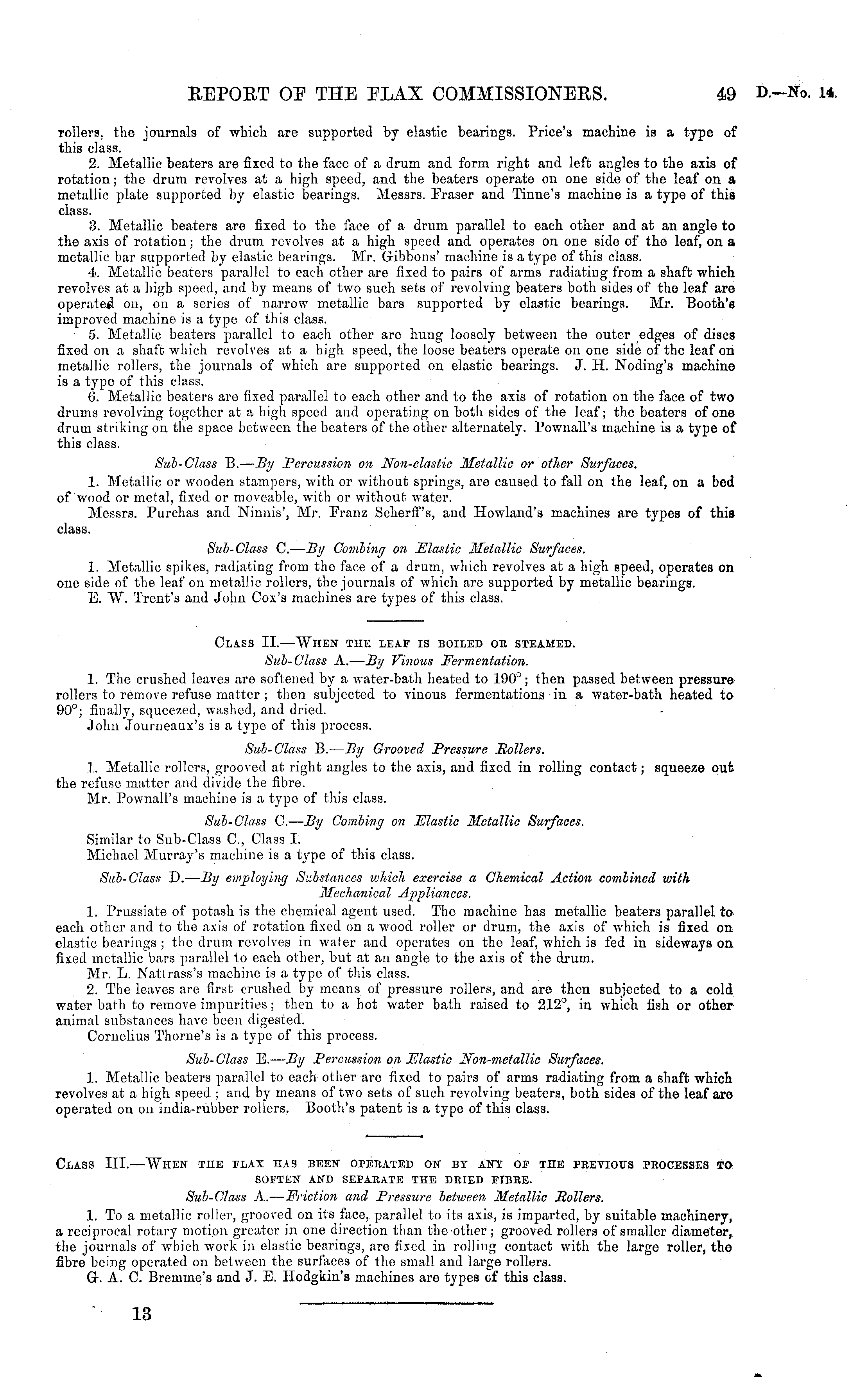 Class 111.- —When the plax has been operated on by any op the previous processes to sopten and separate the dried pibre. Sub-Class A. — Friction and Pressure between. Metallic Rollers. 1. To a metallic roller, grooved on its face, parallel to its axis, is imparted, by suitable machinery, a reciprocal rotary motion greater in one direction than the other; grooved rollers of smaller diameter, the journals of which work in elastic bearings, are fixed in rolling contact with the large roller, the fibre being operated on between the surfaces of the small and large rollers. G. A. C. Bremme's and J. E. Hodgkin's machines are types of this class.