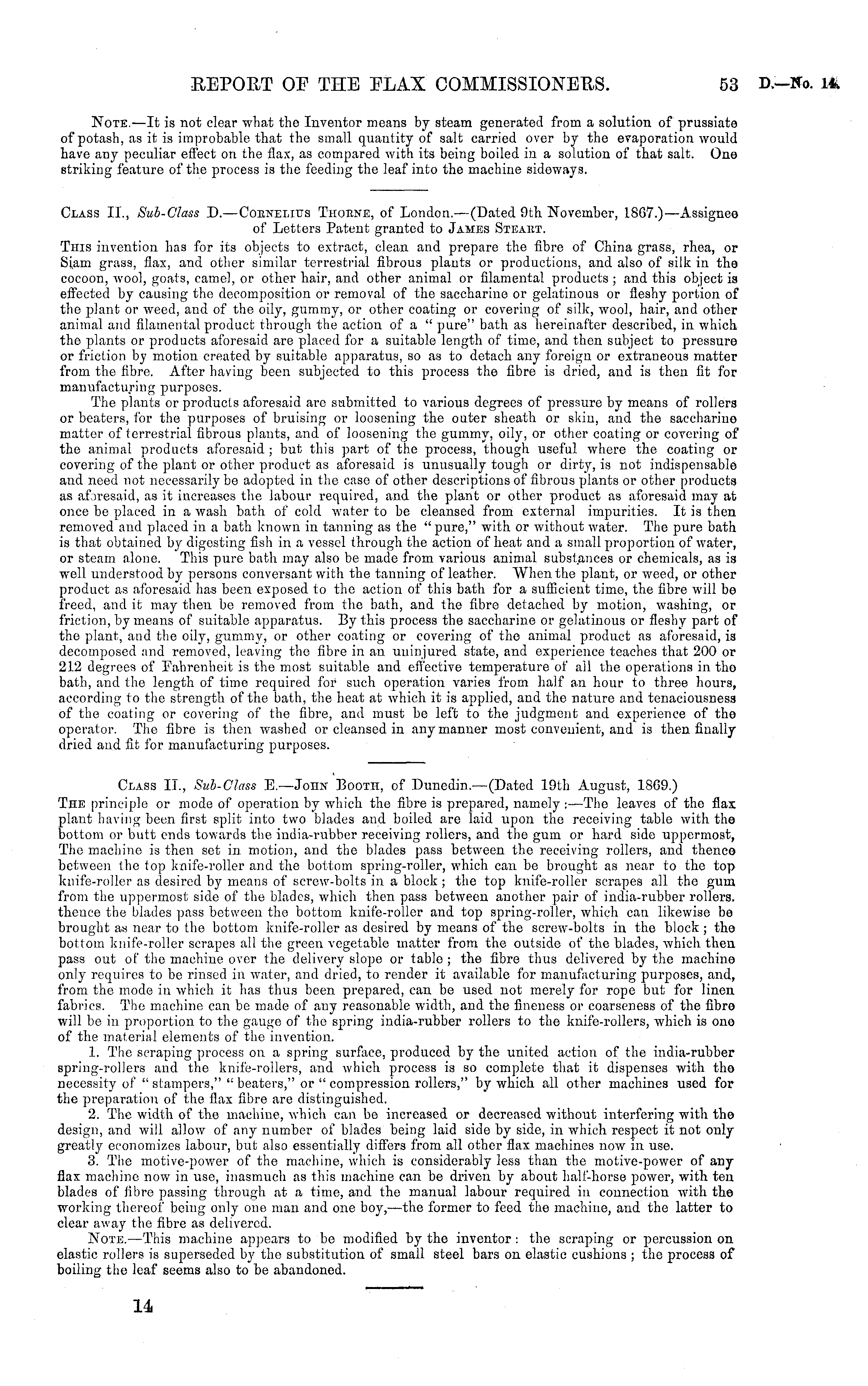 Class 11., Sub-Class D.—Cornelius Thorne, of London. —(Dated 9th November, 1867.) —Assignee of Letters Patent granted to James Steart. This invention has for its objects to extract, clean and prepare the fibre of China grass, rhea, or Siam grass, flax, and other similar terrestrial fibrous plants or productions, and also of silk in the cocoon, wool, goats, camel, or other hair, and other animal or filamental products ; and this object is effected by causing the decomposition or removal of the saccharine or gelatinous or fleshy portion of the plant or weed, and of the oily, gummy, or other coating or covering of silk, wool, hair, and other animal and filamental product through the action of a " pure" bath as hereinafter described, in which tho plants or products aforesaid are placed for a suitable length of time, and then subject to pressure or friction by motion created by suitable apparatus, so as to detach any foreign or extraneous matter from the fibre. After having been subjected to this process the fibre is dried, and is then fit for manufacturing purposes. The plants or products aforesaid arc submitted to various degrees of pressure by means of rollers or beaters, for the purposes of bruising or loosening the outer sheath or skin, and the saccharine matter of terrestrial fibrous plants, and of loosening the gummy, oily, or other coating or covering of the animal products aforesaid ; but this part of the process, though useful where the coating or covering of the plant or other product as aforesaid is unusually tough or dirty, is not indispensable and need not necessarily bo adopted in the case of other descriptions of fibrous plants or other products as aforesaid, as it increases the labour required, and the plant or other product as aforesaid may at once be placed in a wash bath of cold water to be cleansed from external impurities. It is then removed and placed in a bath known in tanning as the " pure," with or without water. The pure bath is that obtained by digesting fish in a vessel through the action of heat and a small proportion of water, or steam alone. This pure bath may also be made from various animal substances or chemicals, as is well understood by persons conversant with the tanning of leather. When the plant, or weed, or other product as aforesaid has been exposed to the action of this bath for a sufficient time, the fibre will be freed, and it may then be removed from the bath, and the fibre detached by motion, washing, or friction, by means of suitable apparatus. By this process the saccharine or gelatinous or fleshy part of the plant, and the oily, gummy, or other coating or covering of the animal product as aforesaid, is decomposed and removed, leaving the fibre in an uninjured state, and experience teaches that 200 or 212 degrees of Fahrenheit is the most suitable and effective temperature of all the operations in tho bath, and the length of time required for such operation varies from half an hour to three hours, according to the strength of the bath, the heat at which it is applied, and the nature and tenaciousness of the coating or covering of the fibre, and must be left to the judgment and experience of the operator. The fibre is then washed or cleansed in any manner most convenient, and is then finally dried and fit for manufacturing purposes.