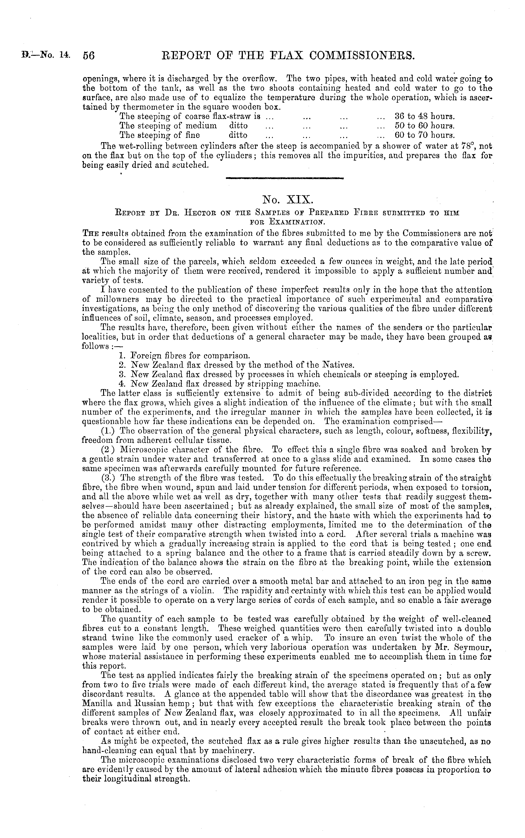 No. XIX. Report by Dr. Hector on the Samples op Prepared Fibre submitted to him for Examination. The results obtained from the examination of the fibres submitted to me by the Commissioners are not to be considered as sufficiently reliable to warrant any final deductions as to the comparative value of the samples. The small size of the parcels, which seldom exceeded a few ounces in weight, and the late period at which the majority of them were received, rendered it impossible to apply a sufficient number and variety of tests. I have consented to the publication of these imperfect results only in the hope that the attention of mil'owners may be directed to the practical importance of such experimental and comparative investigations, as being the only method of discovering the various qualities of the fibre under different influences of soil, climate, season, and processes employed. The results have, therefore, been given without either the names of the senders or tho particular localities, but in order that deductions of a general character may be made, they have been grouped as follows : —■ 1. Foreign fibres for comparison. 2. New Zealand flax dressed by the method of the Natives. 3. New Zealand flax dressed by processes in which chemicals or steeping is employed. 4. New Zealand flax dressed by stripping machine. The latter class is sufficiently extensive to admit of being sub-divided according to the district where the flax grows, which gives a slight indication of the influence of the climate; but with the small number of the experiments, and the irregular manner in which the samples have been collected, it is questionable how far these indications can be depended on. The examination comprised —■ (1.) The observation of the general physical characters, such as length, colour, softness, flexibility, freedom from adherent cellular tissue. (2) Microscopic character of the fibre. To effect this a single fibre was soaked and broken by a gentle strain under water and transferred at once to a glass slide and examined. In some cases the same specimen was afterwards carefully mounted for future reference. (3.) The strength of the fibre was tested. To do this effectually the breaking strain of the straight fibre, tho fibre when wound, spun and laid under tension for different periods, when exposed to torsion, and all the above while wet as well as dry, together with many other tests that readily suggest themselves —should have been ascertained; but as already explained, the small size of most of the samples, the absence of reliable data concerning their history, and the haste with which the experiments had to be performed amidst many other distracting employments, limited me to the determination of the single test of their comparative strength when twisted into a cord. After several trials a machine was contrived by which a gradually increasing strain is applied to the cord that is being tested ; one end being attached to a spring balance and the other to a frame that is carriod steadily down by a screw. The indication of tho balance shows the strain on the fibre at the breaking point, while tho extension of the cord can also be observed. The ends of the cord are carried over a smooth metal bar and attached to an iron peg in the same manner as the strings of a violin. The rapidity and certainty with which this test can be applied would render it possible to operate on a very large series of cords of each sample, and so enable a fair average to be obtained. The quantity of each sample to be tested was carefully obtained by tho weight of well-cleaned fibres cut to a constant length. These weighed quantities were then carefully twisted into a double strand twine like the commonly used cracker of a whip. To insure an even twist tho whole of the samples were laid by one person, which very laborious operation was undertaken by Mr. Seymour, whose material assistance in performing these experiments enabled me to accomplish them in time for this report. The test as applied indicates fairly the breaking strain of the specimens operated on; but as only from two to five trials were made of each different kind, the average stated is frequently that of a few discordant results. A glance at the appended table will show that the discordance was greatest in the Manilla and Russian hemp ; but that with few exceptions the characteristic breaking strain of the different samples of New Zealand flax, was closely approximated to in all the specimens. All unfair breaks were thrown out, and in nearly every accepted result the break took place between tho points of contact at either end. As might be expected, the scutched flax as a rule gives higher results than the unscutched, as no hand-cleaning can equal that by machinery. The microscopic examinations disclosed two very characteristic forms of break of the fibre which are evidenily caused by the amount of lateral adhesion which the minute fibres possess in proportion to their longitudinal strength.