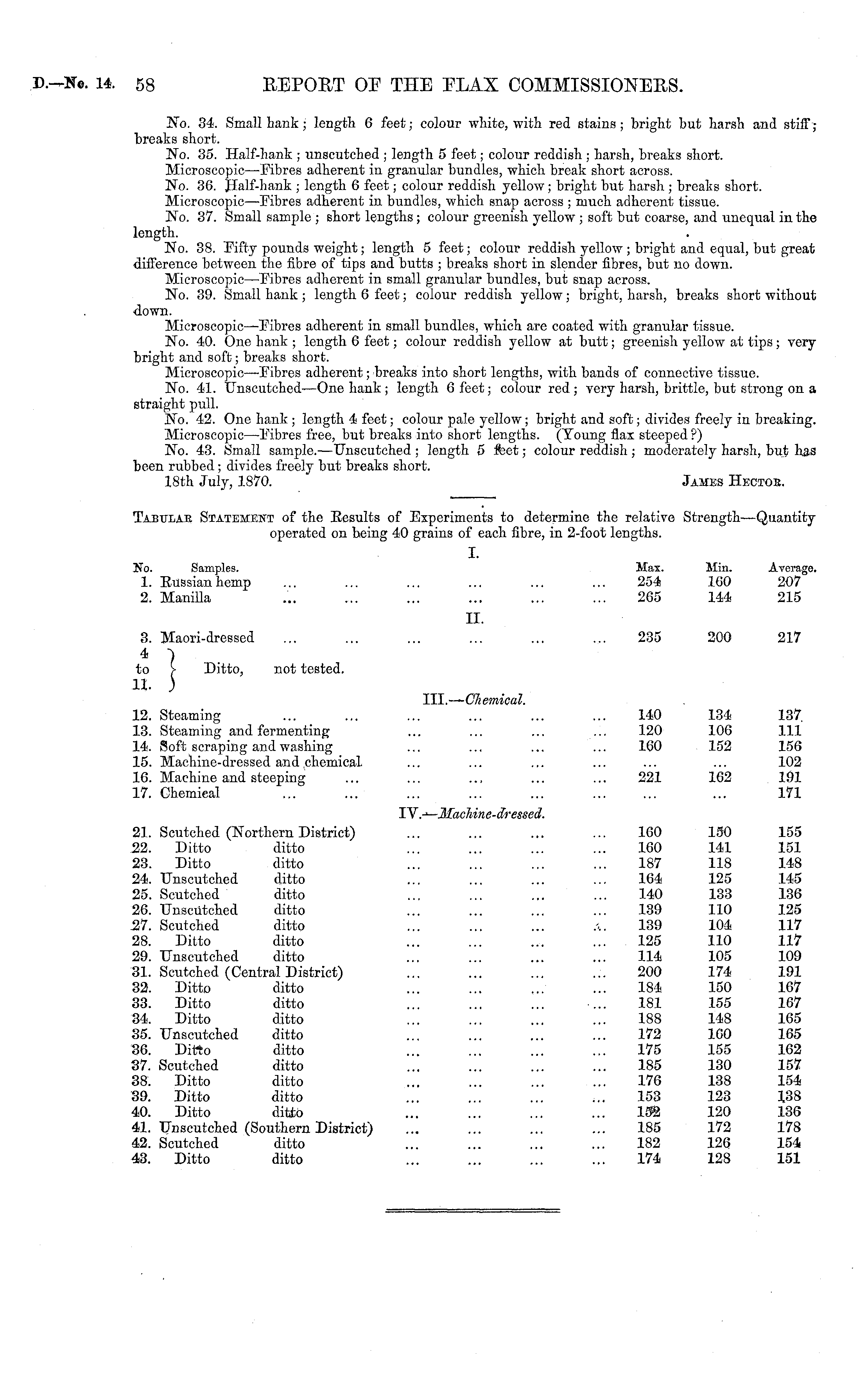 No. 34. Small hank ; length 6 feet; colour white, with red stains ; bright but harsh and stiff-; breaks short. No. 35. Half-hank ; unscutched ; length 5 feet; colour reddish ; harsh, breaks short. Microscopic —Fibres adherent in granular bundles, which break short across. No. 36. Half-hank ; length 6 feet; colour reddish yellow; bright but harsh ; breaks short. Microscopic—Fibres adherent in bundles, which snap across ; much adherent tissue. No. 37. Small sample ; short lengths ; colour greenish yellow ; soft but coarse, and unequal in the length. No. 38. Fifty pounds weight; length 5 feet; colour reddish yellow ; bright and equal, but great difference between the fibre of tips and butts ; breaks short in slender fibres, but no down. Microscopic —Fibres adherent in small granular bundles, but snap across. No. 39. Small hank ; length 6 feet; colour reddish yellow; bright, harsh, breaks short without down. Microscopic—Fibres adherent in small bundles, which are coated with granular tissue. No. 40. One hank ; length 6 feet; colour reddish yellow at butt; greenish yellow at tips; very bright and soft; breaks short. Microscopic—Fibres adherent; breaks into short lengths, with bands of connective tissue. No. 41. Unscutched—One hank ; length 6 feet; colour red ; very harsh, brittle, but strong on a straight pull. No. 42. One hank ; length 4 feet; colour pale yellow; bright and soft; divides freely in breaking. Microscopic —Fibres free, but breaks into short lengths. (Toung flax steeped ?) No. 43. Small sample. —Unscutched ; length 5 feet; colour reddish ; moderately harsh, but has been rubbed; divides freely but breaks short. 18th July, 1870. James Hector.