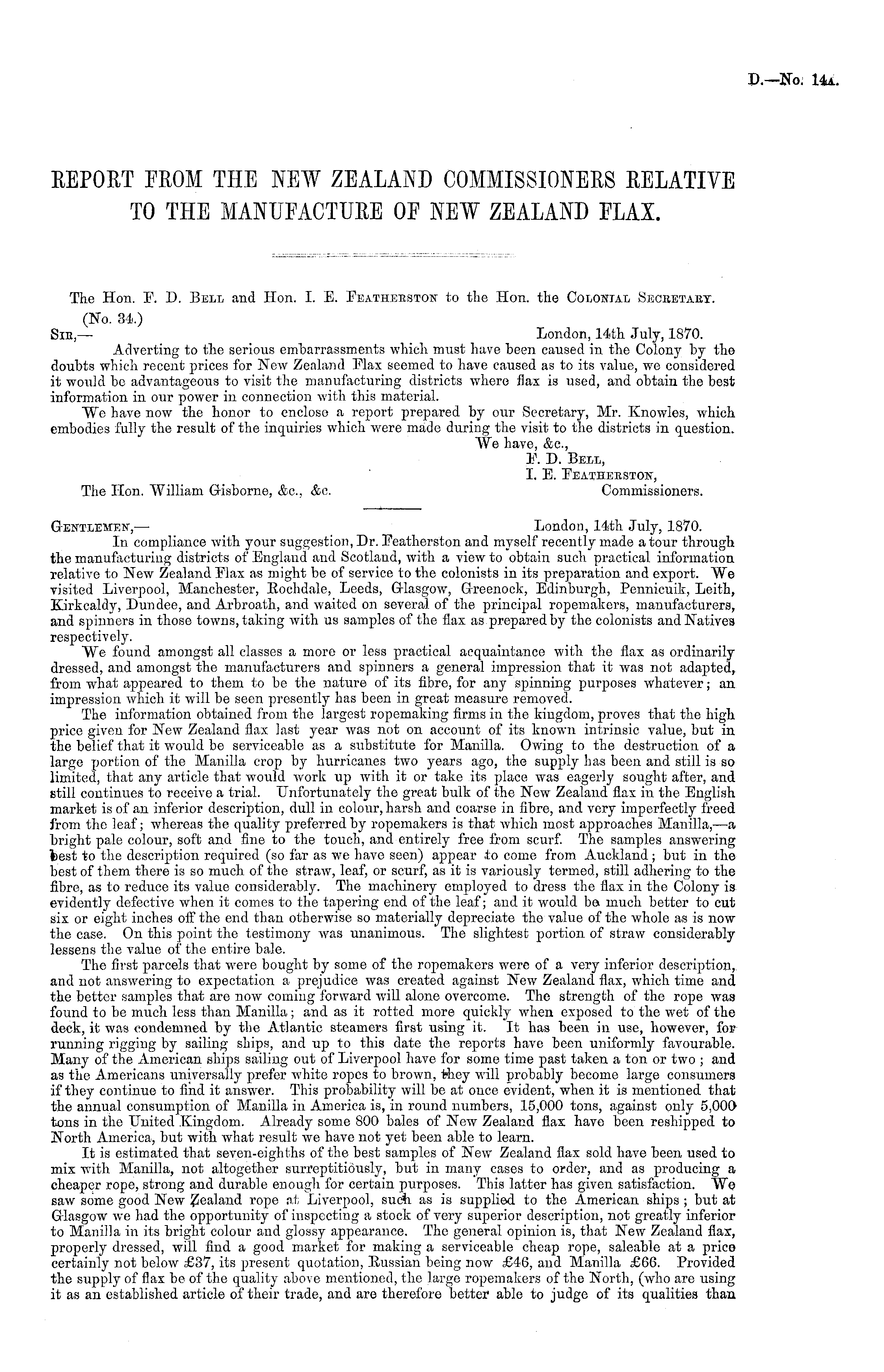 The Hon. F. D. Bell and Hon. I. E. Feathebston to the Hon. the Colonial Seceetaey. (No. 34.) Sib,— London, 14th July, 1870. Adverting to the serious embarrassments which must have been caused in the Colony by the doubts which recent prices for New Zealand Flax seemed to have caused as to its value, we considered it would be advantageous to visit the manufacturing districts where flax is used, and obtain the best information in our power in connection with this material. We have now the honor to enclose a report prepared by our Secretary, Mr. Knowles, which embodies fully the result of the inquiries which were made during the visit to the districts in question. We have, &c., F. D. Bell, I. E. Featheeston, The Hon. William Gisborne, &c. &c. Commissioners.