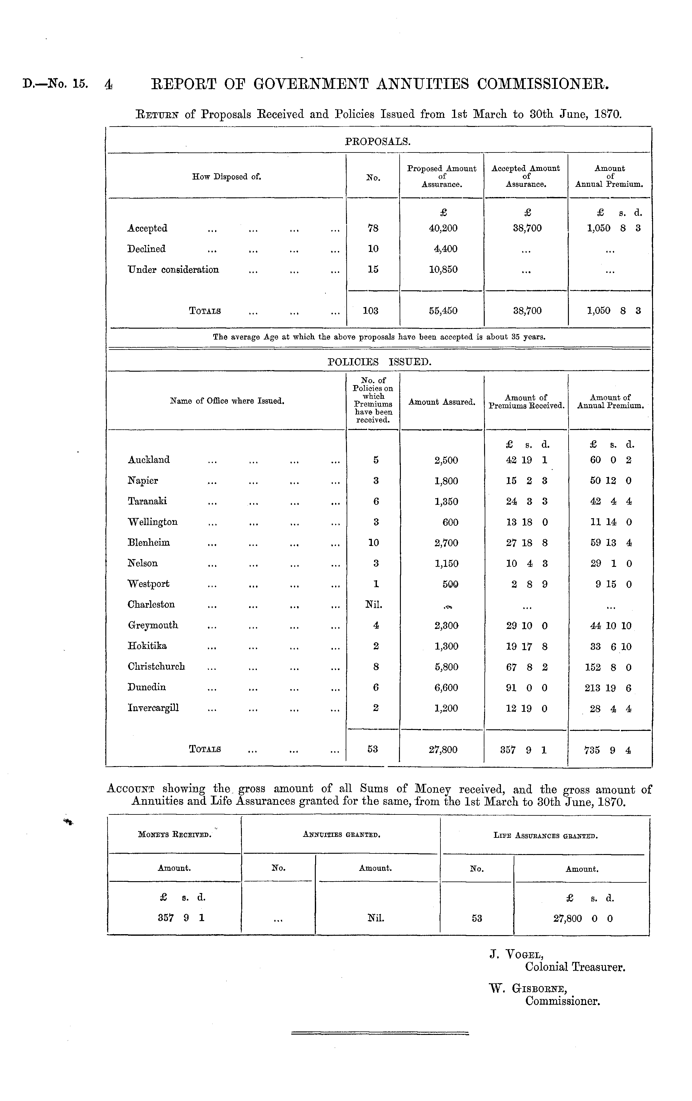 'EOPOSALS. How Disposed of. No. Proposed Amount of Assurance. Accepted Amount of Assurance. Amount of Annual Premium. £ £ £ s. d. Accepted 78 40,200 38,700 1,050 8 3 Declined 10 4,400 Under consideration 15 10,850 Totals 103 55,450 38,700 1,050 8 3 The average Age at which the ab< >ve proposals have been accepted is about 35 years. POLICIES ISSUED. Name of Office where Issued. No. of Policies on which Premiums have been received. Amount Assured. Amount of Premiums Received. Amount of Annual Premium. £ s. d. £ s. d. Auckland 5 2,500 42 19 1 60 0 2 Napier 3 1,800 15 2 3 50 12 0 Taranaki 6 1,350 24 3 3 42 4 4 Wellington 3 600 13 18 0 11 14 0 Blenheim 10 2,700 27 18 8 59 13 4 Nelson 3 1,150 10 4 3 29 1 0 Westport 1 500 2 8 9 9 15 0 Charleston Nil. .Ci Greymouth. 4 2,300 29 10 0 44 10 10 Hokitika 2 1,300 19 17 8 33 6 10 Christchurek 8 5,800 67 8 2 152 8 0 Dunedin 6 6,600 91 0 0 213 19 6 Invercargill 2 1,200 12 19 0 28 4 4 Totals 53 27,800 357 9 1 735 9 4 .C count showing the Annuities and Life ;ross amount of a] .ssurances granted f 11 Sums or the sai if Mom ie, from ij rece: the 1st ived, and the March to 30th ;ross amount o: lune, 1870. Moneys Received. Am HJITIES GRANTED. Life Assurances granted. Amount. No. Amount. No. Amount. £ B. d. £ s. d. 357 9 1 Nil. 27,800 0 0 53 J. Vogel, Colonial Treasurer. W. Gisboene, Commissioner.