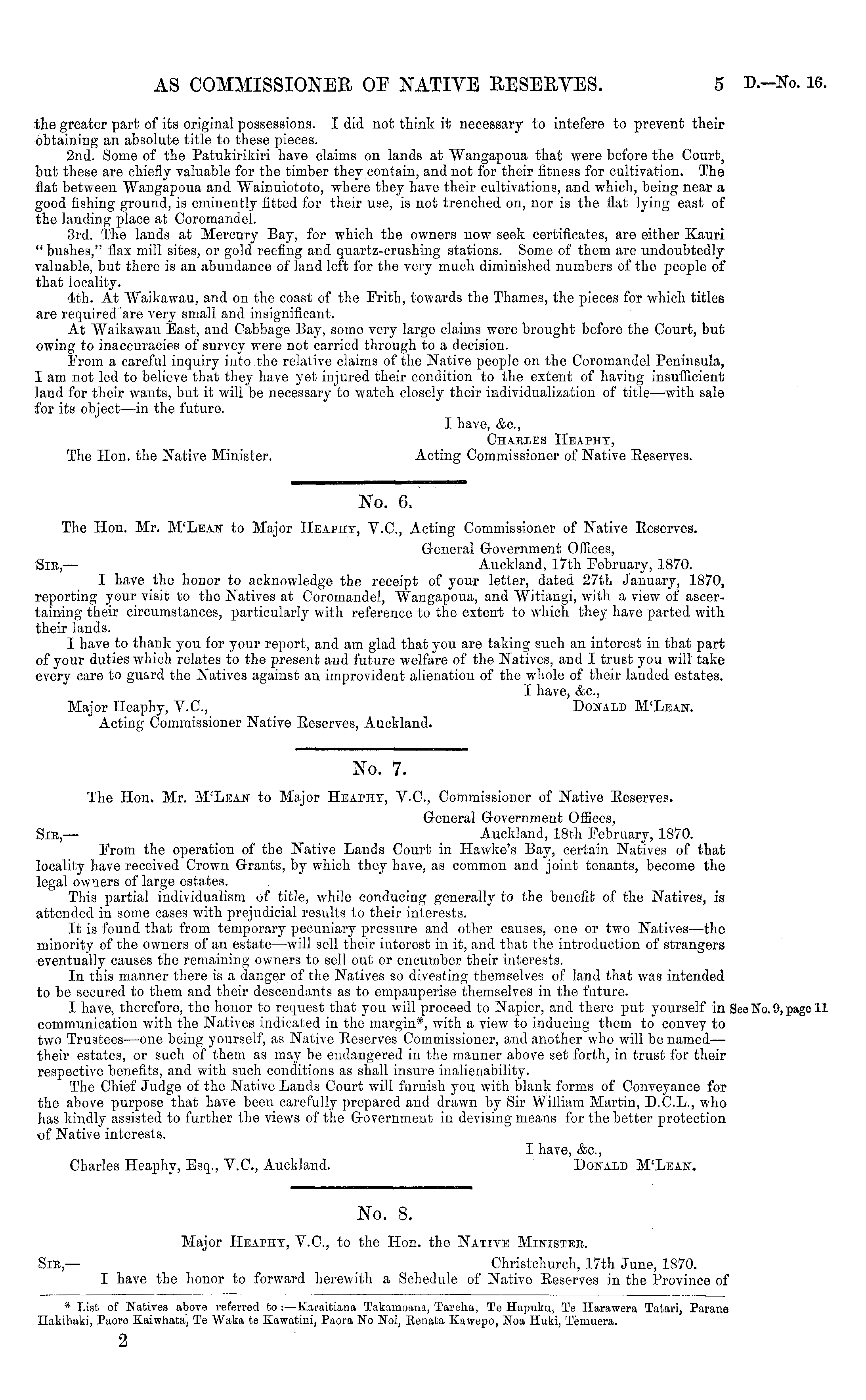 No. 6. The Hon. Mr. M'Lean to Major Heaphy, V.C, Acting Commissioner of Native Eeserves. General Government Offices, Sir,— Auckland, 17th Eebruary, 1870. I have the honor to acknowledge the receipt of your letter, dated 27th January, 1870, reporting your visit to the Natives at Coromandel, Wangapoua, and "Witiangi, with a view of ascertaining their circumstances, particularly with reference to the extent to which they have parted with their lands. I have to thank you for your report, and am glad that you are taking such an interest in that part of your duties which relates to the present and future welfare of the Natives, and I trust you will take every care to guard the Natives against an improvident alienation of the whole of their landed estates. I have, &c, Major Heaphy, V.C, Donald M'Lean. Acting Commissioner Native Eeserves, Auckland.
