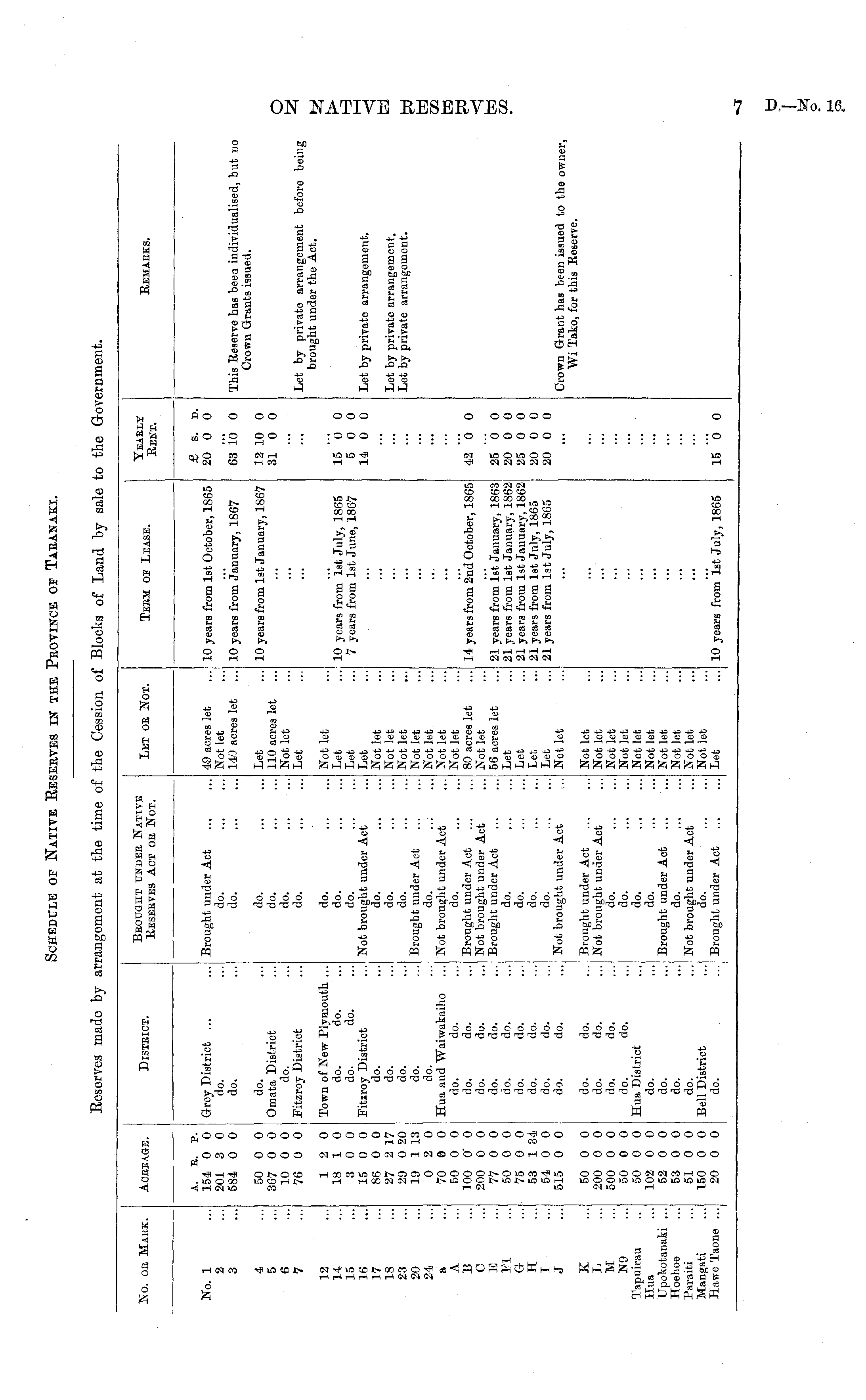No. oe Make. Aceeage. DlSTEICT. Beought undee Native Reseeves Act oe Not. Let oe Not. Teem or Lease. Yeaeey Rent. Remaeks. No. 1 2 3 A. K. P. 154 0 0 201 3 0 584 0 0 Grey District ... do. do. Brought under Act do. do. 49 acres let Not let 140 acres let 10 years from 1st October, 1865 £ s. D. 20 0 0 10 years from January, 1867 63 10 0 This Reserve has beea individualised, but no Crown Grants issued. 4 5 6 7 50 0 0 367 0 0 10 0 0 76 0 0 do. Omata District do. Eitzroy District do. do. do. do. Let 110 acres let Not let Let 10 years from 1st January, 1867 12 10 0 31 0 0 Let by private arrangement before being brought under the Act. 12 14 15 16 17 18 23 20 24 12 0 18 1 0 3 0 0 15 0 0 86 0 0 27 2 17 29 0 20 19 1 13 0 2 0 70 0 0 50 0 0 100 0' 0 200 0 0 77 0 0 50 0 0 75 0 0 53 1 34 54 0 0 515 0 0 Town of New Plymouth ... do. do. do. do. FiUroy District do. do. do. do. do. Hua and Waiwakaiho do. do. do. do. do. do. do. do. do. do. do. do. do. do. do. do. do. do. do. do. do. Not brought under Act do. do. do. Brought under Act do. Not brought under Act do. Brought under Act Not brought under Act Brought under Act do. do. do. do. Not brought under Act ... Not let Let Let Let Not let Not let Not let Not let Not let Not let Not let 80 acres let Not let 56 acres let Let Let Let Let Not let 10 years from 1st July, 1865 7 years from 1st June, 1867 15 0 0 5 0 0 14 0 0 Let by private arrangement. Let by private arrangement. Let by private arrangement. a A B C E El G H I 14 years from 2nd October, 1865 21 years from 1st January, 1863 21 years from 1st January, 1862 21 years from 1st January, 1862 21 years from 1st July, 1865 21 years from 1st July, 1865 42 "6 0 25 0 0 20 0 0 25 0 0 20 0 0 20 0 0 Crown Grant has been issued to the owner, Wi Tako, for this Reserve. K L M N9 Tapuirau Hua Upokotanaki ... Hoehoe Paraiti Mangati Hawe Taono ... 50 0 0 200 0 0 500 0 0 50 0 0 50 0 0 102 0 0 52 0 0 53 0 0 51 0 0 150 0 0 20 0 0 do. do. do. do. do. do. do. do. Hua District do. do. do. do. Bell District do. Brought under Act Not brought under Act do. do. do. do. Brought under Act do. Not brought under Act do. Brought under Act Not let Not let Not let Not let Not let Not let Not let Not let Not let Not let Let 10 years from 1st July, 1865 15 0 0