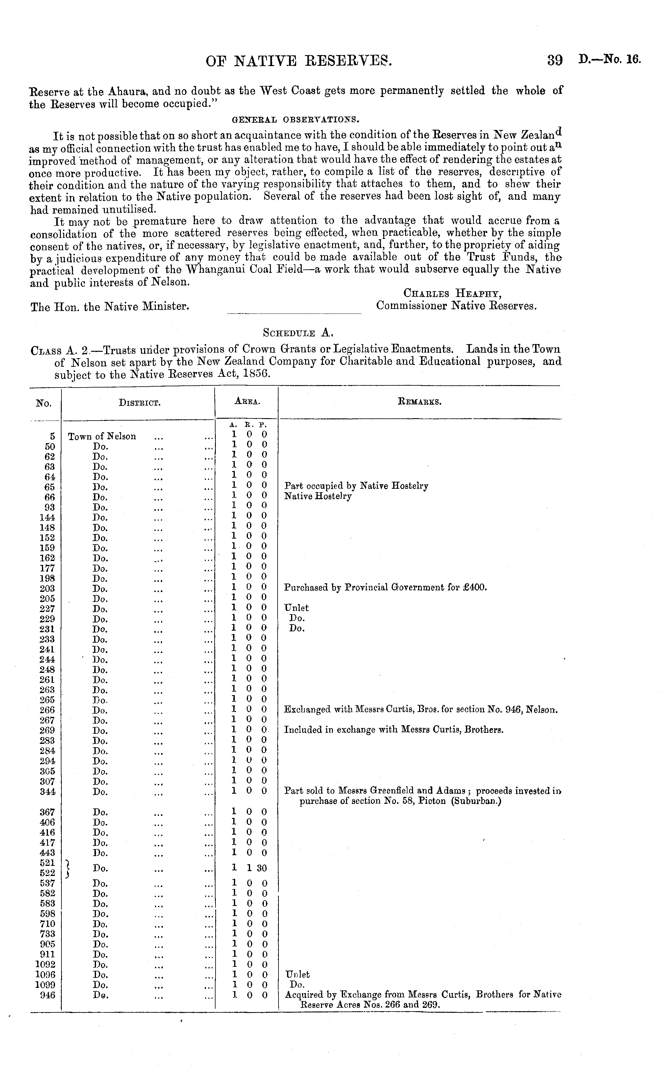 Eeserve at the Ahaura, and no doubt as the West Coast gets more permanently settled the whole of the Eeserves will become occupied." GENERAL OBSERVATIONS. It is not possible that on so short an acquaintance with the condition of the Eeserves in New Zealan" as my official connection with the trust has enabled me to have, I should be able immediately to point out aa improved method of management, or any alteration that would have the effect of rendering the estates at once more productive. It has been my object, rather, to compile a list of the reserves, descriptive of their condition and the nature of the varying responsibility that attaches to them, and to shew their extent in relation to the Native population. Several of the reserves had been lost sight of, and many had remained unutilised. It may not be premature here to draw attention to the advantage that would accrue from a consolidation of the more scattered reserves being effected, when practicable, whether by the simple consent of the natives, or, if necessary, by legislative enactment, and, further, to the propriety of aiding by a judicious expenditure of any money that could be made available out of the Trust Funds, the practical development of the Whanganui Coal Field —a work that would subserve equally the Native and public interests of Nelson. Charles Heaphy, The Hon. the Native Minister. Commissioner Native Eeserves.