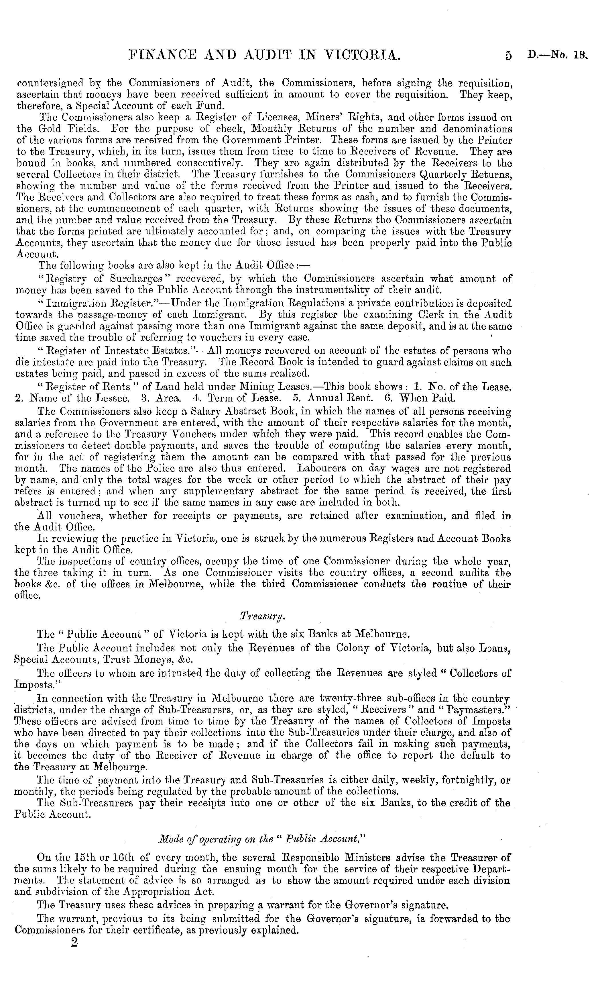 countersigned by the Commissioners of Audit, the Commissioners, before signing the requisition, ascertain that moneys have been received sufficient in amount to cover the requisition. They keep, therefore, a Special Account of each Fund. The Commissioners also keep a Register of Licenses, Miners' Rights, and other forms issued on the Gold Fields. For the purpose of check, Monthly Returns of the number and denominations of the various forms are received from the Government Printer. These forms are issued by the Printer to the Treasury, which, in its turn, issues them from time to time to Receivers of Revenue. They are bound in books, and numbered consecutively. They are again distributed by the Receivers to the several Collectors in their district. The Treasury furnishes to the Commissioners Quarterly Returns, showing the number and value of the forms received from the Printer and issued to the Receivers. The Receivers and Collectors are also required to treat these forms as cash, and to furnish the Commissioners, at the commencement of each quarter, with Returns showing the issues of these documents, and the number and value received from the Treasury. By these Returns the Commissioners ascertain that the forms printed are ultimately accounted for; and, on comparing the issues with the Treasury Accounts, they ascertain that the money due for those issued has been properly paid into the Public Account. The following books are also kept in tho Audit Office: — " Registry of Surcharges" recovered, by which the Commissioners ascertain what amount of money has been saved to the Public Account through the instrumentality of their audit. " Immigration Register."—Under tho Immigration Regulations a private contribution is deposited towards the passage-money of each Immigrant. By this register the examining Clerk in the Audit Office is guarded against passing more than one Immigrant against tho same deposit, and is at the same time saved the trouble of referring to vouchers in every case. " Begister of Intestate Estates." —All moneys recovered on account of the estates of persons who die intestate are paid into the Treasury. The Becord Book is intended to guard against claims on such estates being paid, and passed in excess of the sums realized. " Register of Rents " of Land held under Mining Leases. —This book shows : 1. No. of the Lease. 2. Name of the Lessee. 3. Area. 4. Term of Lease. 5. Annual Rent. 6. When Paid. The Commissioners also keep a Salary Abstract Book, in which the names of all persons receiving salaries from tho Government are entered, with the amount of their respective salaries for the month, and a reference to the Treasury Vouchers under which they were paid. This record enables the Commissioners to detect double payments, and saves the trouble of computing the salaries every month, for in the act of registering them the amount can be compared with that passed for the previous month. The names of the Police are also thus entered. Labourers on day wages are not registered by name, and only the total wages for the week or other period to which the abstract of their pay refers is entered ; and when any supplementary abstract for the same period is received, the first abstract is turned up to see if the same names in any case are included in both. All vouchers, whether for receipts or payments, are retained after examination, and filed in the Audit Office. In reviewing the practice in Victoria, one is struck by the numerous Registers and Account Books kept in the Audit Office. The inspections of country offices, occupy the time of one Commissioner during the whole year, the three taking it in turn. As one Commissioner visits the country offices, a second audits tho books &c. of the offices in Melbourne, while the third Commissioner conducts the routine of their office. Treasury. The " Public Account " of Victoria is kept with the six Banks at Melbourne. The Bublic Account includes not only the Revenues of the Colony of Victoria, but also Loans, Special Accounts, Trust Moneys, &c. The officers to whom are intrusted the duty of collecting the Revenues are styled " Collectors of Imposts." In connection with the Treasury in Melbourne there are twenty-three sub-offices in the country districts, under the charge of Sub-Treasurers, or, as they are styled, " Receivers " and " Baymasters." These officers are advised from time to time by the Treasury of the names of Collectors of Imposts who have been directed to pay their collections into the Sub-Treasuries under their charge, and also of the days on which payment is to be made ; and if the Collectors fail in making such payments, it becomes the duty of the Receiver of Revenue in charge of the office to report the default to the Treasury at Melbourne. The time of payment into the Treasury and Sub-Treasuries is either daily, weekly, fortnightly, or monthly, the periods being regulated by the probable amount of the collections. The Sub-Treasurers pay their receipts into one or other of the six Banks, to the credit of the Public Account. Mode of operating on the " Public Account," On the 15th or 16th of every month, the several Responsible Ministers advise the Treasurer of the sums likely to be required during the ensuing month for the service of their respective Departments. The statement of advice is so arranged as to show the amount required under each division and subdivision of the Appropriation Act. The Treasury uses these advices in preparing a warrant for the Governor's signature. The warrant, previous to its being submitted for the Governor's signature, is forwarded to the Commissioners for their certificate, as previously explained. 2