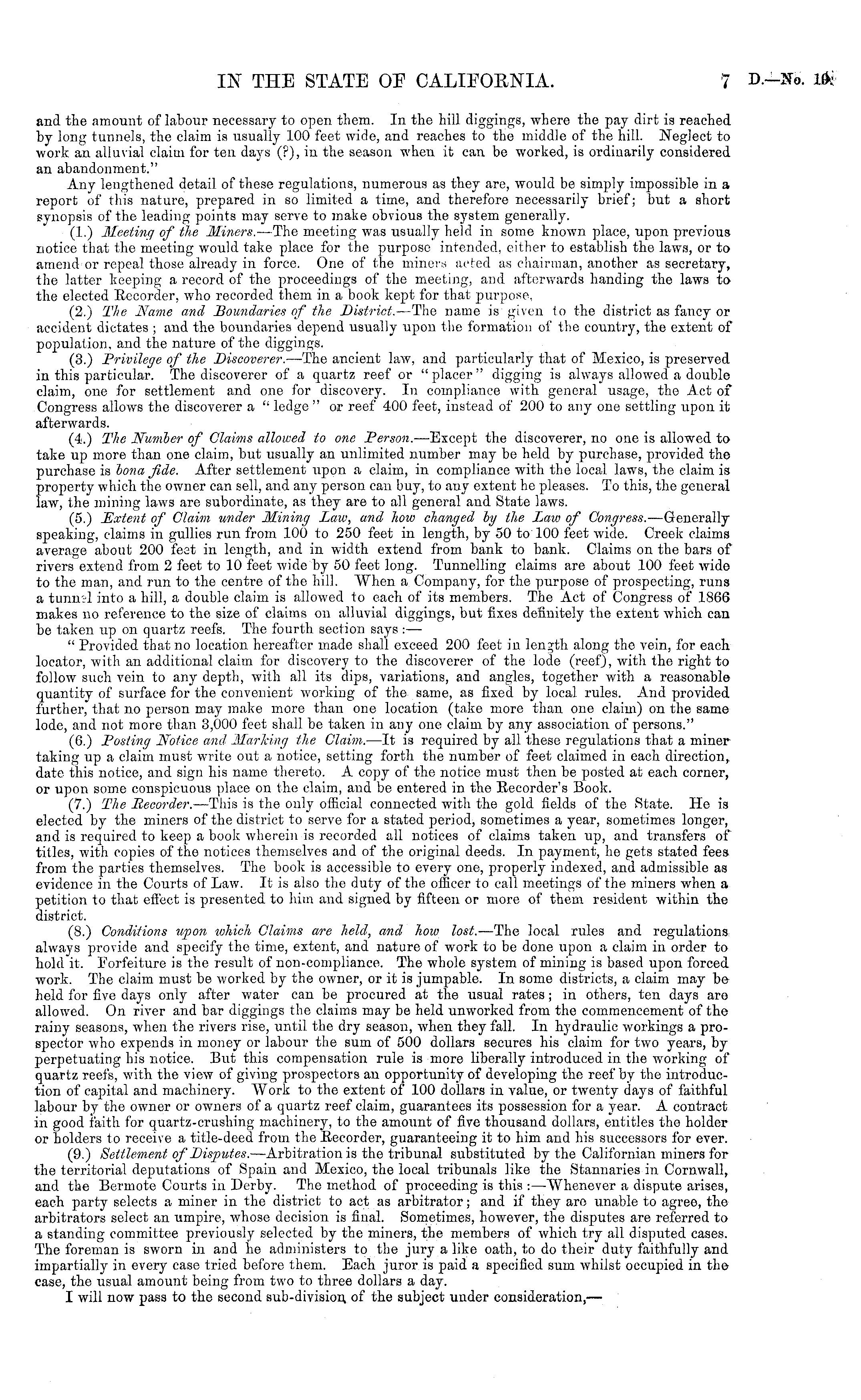 and the amount of labour necessary to open them. In the hill diggings, where the pay dirt is reached by long tunnels, the claim is usually 100 feet wide, and reaches to the middle of the hill. Neglect to work an alluvial claim for ten days (?), in the season when it can be worked, is ordinarily considered an abandonment." Any lengthened detail of these regulations, numerous as they are, would be simply impossible in a report of this nature, prepared in so limited a time, and therefore necessarily brief; but a short synopsis of the leading points may serve to make obvious the S3 rstem generally. (1.) Meeting of the Miners. —The meeting was usually held in some known place, upon previous notice that the meeting would take place for the purpose intended, either to establish the laws, or to amend or repeal those already in force. One of the miners acted as chairman, another as secretary, the latter keeping a record of the proceedings of the meeting, and afterwards handing the laws to the elected Recorder, who recorded them in a book kept for that purpose, (2.) The Name and Boundaries of the District. —The name is given to the district as fancy or accident dictates ; and the boundaries depend usually upon the formation of the country, the extent of population, and the nature of the diggings. (3.) Privilege of the Discoverer. —The ancient law, and particularly that of Mexico, is preserved in this particular. The discoverer of a quartz reef or " placer " digging is always allowed a double claim, one for settlement and one for discovery. In compliance with general usage, the Act of Congress allows tho discoverer a " ledge " or reef 400 feet, instead of 200 to any one settling upon it afterwards. (4.) The Number of Claims allowed to one Person. —Except the discoverer, no one is allowed to take up more than one claim, but usually an unlimited number may be held by purchase, provided the purchase is bona fide. After settlement upon a claim, in compliance with the local laws, the claim is property which the owner can sell, and any person can buy, to any extent he pleases. To this, the general law, the mining laws are subordinate, as they are to all general and State laws. (5.) Extent of Claim under Mining Law, and how changed by the Law of Congress. —Generally speaking, claims in gullies run from 100 to 250 feet in length, by 50 to 100 feet wide. Creek claims average about 200 feet in length, and in width extend from bank to bank. Claims on the bars of rivers extend from 2 feet to 10 feet wide by 50 feet long. Tunnelling claims are about 100 feet w ride to the man, and run to the centre of the hill. When a Company, for the purpose of prospecting, runs a tumrrl into a hill, a double claim is allowed to each of its members. The Act of Congress of 1866 makes no reference to the size of claims on alluvial diggings, but fixes definitely the extent which can be taken up on quartz reefs. The fourth section says : — " Provided that no location hereafter made shall exceed 200 feet in length along the vein, for each locator, with an additional claim for discovery to the discoverer of the lode (reef), with the right to follow such vein to any depth, with all its dips, variations, and angles, together with a reasonable quantity of surface for the convenient working of the same, as fixed by local rules. And provided further, that no person may make more than one location (take more than one claim) on the same lode, and not more than 3,000 feet shall be taken in any one claim by any association of persons." (6.) Posting Notice and Marking the Claim. —It is required by all these regulations that a miner taking up a claim must write out a notice, setting forth the number of feet claimed in each direction, date this notice, and sign his name thereto. A copy of the notice must then be posted at each corner, or upon some conspicuous place on the claim, and be entered in the Recorder's Book. (7.) The Becorder. —This is the only official connected with the gold fields of the State. He is elected by the miners of the district to serve for a stated period, sometimes a year, sometimes longer, and is required to keep a book wherein is recorded all notices of claims taken up, and transfers of titles, with copies of the notices themselves and of the original deeds. In payment, he gets stated fees from the parties themselves. The book is accessible to every one, properly indexed, and admissible as evidence in the Courts of Law. It is also the duty of the officer to call meetings of the miners when a petition to that effect is presented to him and signed by fifteen or more of them resident within the district. (8.) Conditions upon which Claims are held, and how lost. —The local rules and regulations always provide and specify the time, extent, and nature of work to be done upon a claim in order to hold it. Forfeiture is the result of non-compliance. The whole system of mining is based upon forced work. The claim must be worked by the owner, or it is jumpable. In some districts, a claim may be held for five days only after water can be procured at tho usual rates; in others, ten days are allowed. On river and bar diggings the claims may be held unworked from the commencement of the rainy seasons, when the rivers rise, until the dry season, when they fall. In hydraulic workings a prospector who expends in money or labour the sum of 500 dollars secures his claim for two years, by perpetuating his notice. But this compensation rule is more liberally introduced in the working of quartz reefs, with the view of giving prospectors an opportunity of developing the reef by the introduction of capital and machinery. Work to the extent of 100 dollars in value, or twenty days of faithful labour by tho owner or owners of a quartz reef claim, guarantees its possession for a year. A contract in good faith for quartz-crushing machinery, to the amount of five thousand dollars, entitles the holder or holders to receive a title-d