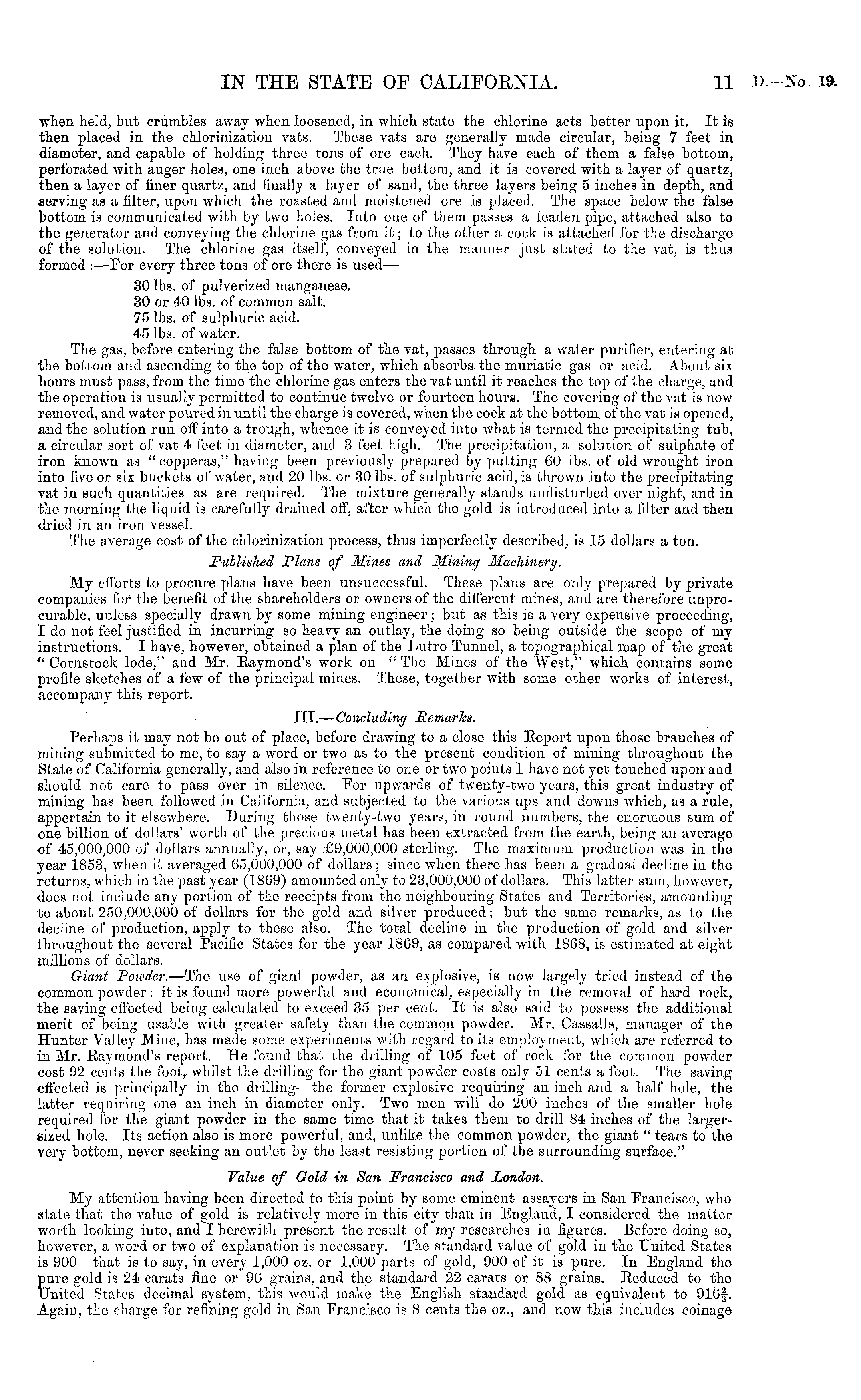 when held, but crumbles away when loosened, in which state the chlorine acts better upon it. It is then placed in the chlorinization vats. These vats are generally made circular, being 7 feet in diameter, and capable of holding three tons of ore each. They have each of them a false bottom, perforated with auger holes, one inch above the true bottom, and it is covered with a layer of quartz, then a layer of finer quartz, and finally a layer of sand, the three layers being 5 inches in depth, and serving as a filter, upon which the roasted and moistened ore is placed. The space below the false bottom is communicated with by two holes. Into one of them passes a leaden pipe, attached also to the generator and conveying the chlorine gas from it; to the other a cock is attached for the discharge of the solution. The chlorine gas itself, conveyed in the manner just stated to the vat, is thus formed :■ —For every three tons of ore there is used— 30 lbs. of pulverized manganese. 30 or 40 lbs. of common salt. 75 lbs. of sulphuric acid. 45 lbs. of water. The gas, before entering the false bottom of the vat, passes through a water purifier, entering at the bottom and ascending to the top of the water, which absorbs the muriatic gas or acid. About six hours must pass, from the time the chlorine gas enters the vat until it reaches the top of the charge, and the operation is usually permitted to continue twelve or fourteen hour*. The covering of the vat is now removed, and water poured in until the charge is covered, when the cock at the bottom of the vat is opened, and the solution run off into a trough, whence it is conveyed into what is termed the precipitating tub, a circular sort of vat 4 feet in diameter, and 3 feet high. The precipitation, a solution of sulphate of iron known as " copperas," having been previously prepared by putting 60 lbs. of old wrought iron into five or six buckets of water, and 20 lbs. or 30 lbs. of sulphuric acid, is thrown into the precipitating vat in such quantities as are required. The mixture generally stands undisturbed over night, and in the morning the liquid is carefully drained off, after which the gold is introduced into a filter and then dried in an iron vessel. The average cost of the chlorinization process, thus imperfectly described, is 15 dollars a ton. Published Plans of Mines and Mining Machinery. My efforts to procure plans have been unsuccessful. These plans are only prepared by private companies for the benefit of the shareholders or owners of the different mines, and are therefore unprocurable, unless specially drawn by some mining engineer; but as this is a very expensive proceeding, I do not feel justified in incurring so heavy an outlay, the doing so being outside the scope of my instructions. I have, however, obtained a plan of the Lutro Tunnel, a topographical map of the great " Cornstoek lode," and Mr. Raymond's work on " The Mines of the West," which contains some profile sketches of a few of the principal mines. These, together with some other works of interest, accompany this report. 111. — Concluding Bemarks. Perhaps it may not be out of place, before drawing to a close this Report upon those branches of mining submitted to me, to say a word or two as to the present condition of mining throughout the State of California generally, and also in reference to one or two points I have not yet touched upon and should not care to pass over in silence. For upwards of twenty-two years, this great industry of mining has been followed in California, and subjected to the various ups and downs which, as a rule, appertain to it elsewhere. During those twenty-two years, in round numbers, the enormous sum of one billion of dollars' worth of the precious metal has been extracted from the earth, being an average of 45,000,000 of dollars annually, or, say £9,000,000 sterling. The maximum production was in the year 1853, when it averaged 65,000,000 of dollars ; since when there has been a gradual decline in the returns, which in the past year (1869) amounted only to 23,000,000 of dollars. This latter sum, however, does not include any portion of the receipts from the neighbouring States and Territories, amounting to about 250,000,000 of dollars for the gold and silver produced; but the same remarks, as to the decline of production, apply to these also. The total decline in the production of gold and silver throughout the several Pacific States for the year 1869, as compared with 1868, is estimated at eight millions of dollars. Giant Powder. —The use of giant powder, as an explosive, is now largely tried instead of the common powder: it is found more powerful and economical, especially in the removal of hard rock, the saving effected being calculated to exceed 35 per cent. It is also said to possess the additional merit of being usable with greater safety than the common powder. Mr. Cassalls, manager of the Hunter Valley Mine, has made some experiments with regard to its employment, which are referred to in Mr. Raymond's report. He found that the drilling of 105 feet of rock for the common powder cost 92 cents the foot, whilst the drilling for the giant powder costs only 51 cents a foot. The saving effected is principally in the drilling —the former explosive requiring an inch and a half hole, the latter requiring one an inch in diameter only. Two men will do 200 inches of the smaller hole required for the giant powder in the same time that it takes them to drill 84 inches of the largersized hole. Its action also is more powerful, and, unlike the common powder, the giant " tears to the very bottom, never seeking an outlet by the least resisting portion of the surrounding surface." Value of Gold in San Francisco and London. My attention having been directed to this point by some eminent assayers in San Francisco, who state that the value of gold is relatively more in this city than in England, I considered the matter worth looking into, and I herewith