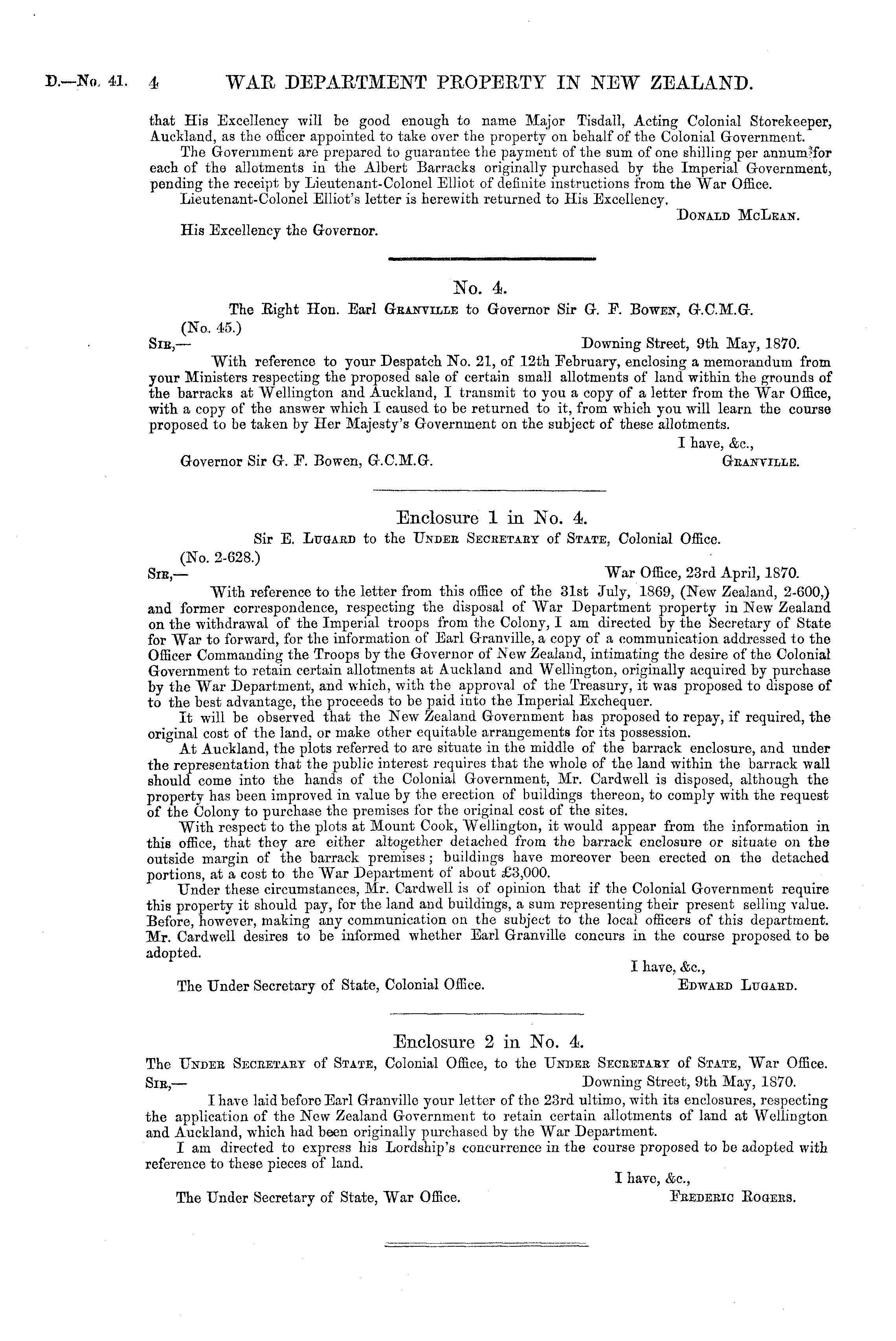 No. 4. The Right Hon. Earl Geanville to Governor Sir G. F. Bowen, G.C.M.G. (No. 45.) Sib,— Downing Street, 9th May, 1870. With reference to your Despatch No. 21, of 12th February, enclosing a memorandum from your Ministers respecting the proposed sale of certain small allotments of land within the grounds of the barracks at Wellington and Auckland, I transmit to you a copy of a letter from the War Office, with a copy of the answer which I caused to be returned to it, from which you will learn the course proposed to be taken by Her Majesty's Government on the subject of these allotments. I have, &c, Governor Sir G. F. Bowen, G.C.M.G. Geanyille.