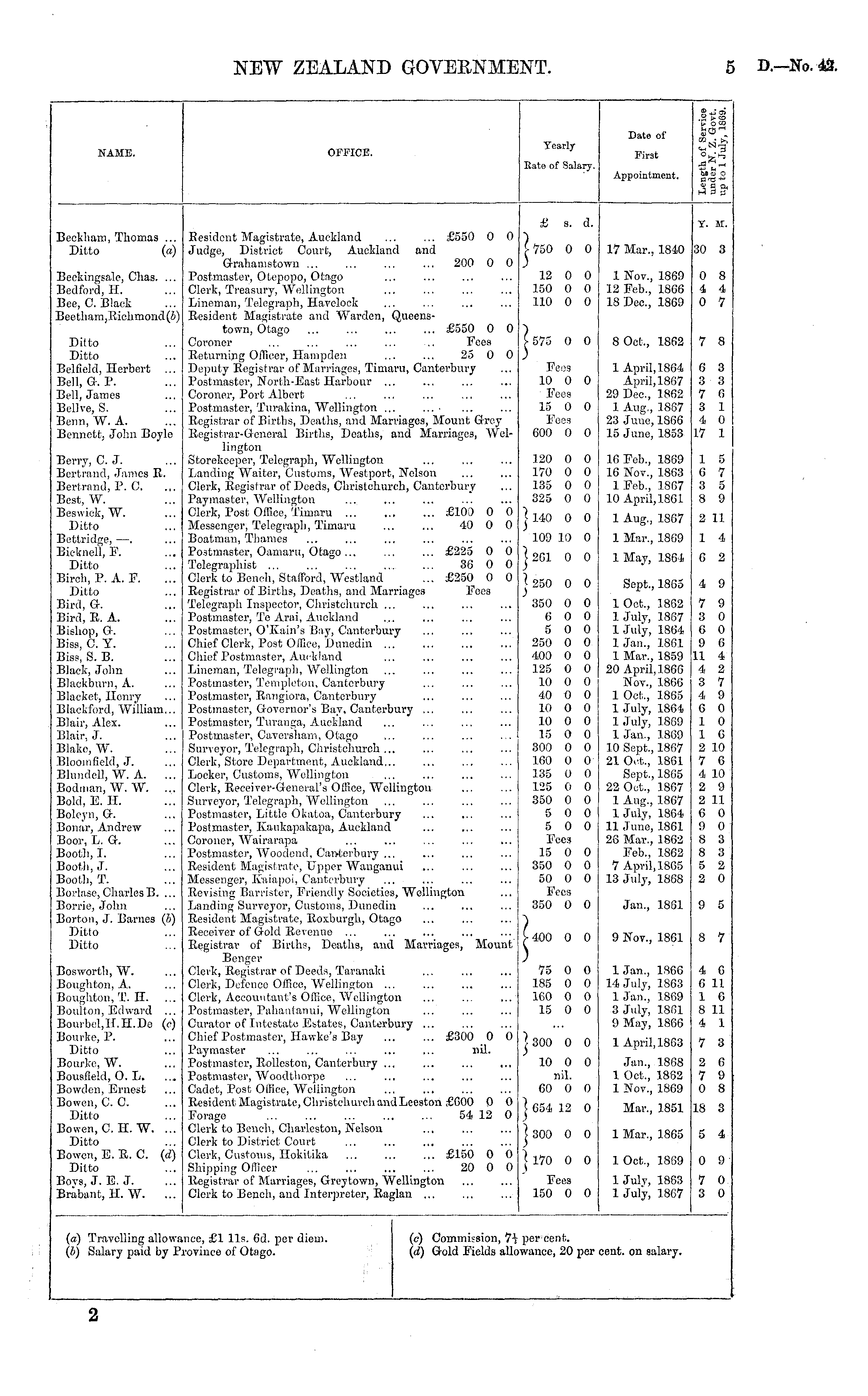 NAME. OFFICE. Yearly Date of First g«o> ■m F s> 3§§Rate of Salary. Appointment. £ s. d. T. K. Beckham, Thomas ... Ditto (a) Beckingeale, Chas. ... Bedford, H. Bee, C. Black Beetham,Richmond (5) Ditto Ditto Belfield, Herbert ... Bell, G. P. Bell, James Bellve, S. Benn, W. A. Bennett, John Boyle Berry, C. J. Bertrand, James R. Bertrand, P. C. Best, W. Beswiek, W. Ditto Bettridgo, —. Bickneli, F. Ditto Birch, P. A. F. Ditto Bird, G. Bird, R. A. Bishop, G. Biss, C. Y. Biss, S. B. Black, John Blackburn, A. Blacker, Henry Blackford, William... Blair, Alex. Blair, J. Blake, W. Blooinficld, J. Blundell, W. A. ... Bodinan, W. W. ... Bold, E. H. Boleyn, G. Bonar, Andrew Boor, L. G. Booth, I. Booth, J. Booth, T. Borlase,CharlesB. ... Borne, John Borton, J. Barnes (b) Ditto Ditto Eesident Magistrate, Auckland ... ... £550 0 0 Judge, District Court, Auckland and Grahamstown 200 0 0 Postmaster, Otepopo, Otago Clerk, Treasury, Wellington Lineman, Telegraph, Havelock Resident Magistrate and Warden, Queenstown, Otago £550 0 0 Coroner ... ... ... ... ... Fees Returning Officer, Hampden 25 0 0 Deputy Registrar of Marriages, Timaru, Canterbury Postmaster, North-East Harbour ... Coroner, Port Albert Postmaster, Turakina, Wellington ... ... Registrar of Births, Deaths, and Marriages, Mount Grey Registrar-General Births, Deaths, and Marriages, Wellington Storekeeper, Telegraph, Wellington Landing Waiter, Customs, Westport, Nelson Clerk, Registrar of Deeds, Christchurch, Canterbury Paymaster, Wellington Clerk, Post Office, Timaru £109 0 0 Messenger, Telegraph, Timaru ... ... 40 0 0 Boatman, Thames Postmaster, Oamaru, Otago... ... ... £225 0 0 Telegraphist ... ... ... ... ... 36 0 O Clerk to Bench, Stafford, Westland ... £250 0 0 Registrar of Births, Deaths, and Marriages Fees Telegraph Inspector, Christchurch ... Postmaster, Te Aral, Auckland Postmaster, O'Kain's Bay, Canterbury Chief Clerk, Post Office, Dunedin Chief Postmaster, Auckland Lineman, Telegraph, Wellington Postmaster, Templeton, Canterbury Postmaster, Rangiora, Canterbury Postmaster, Governor's Bay, Canterbury ... Postmaster, Turanga, Auckland Postmaster, Caversham, Otago Surveyor, Telegraph, Christchurch ... Clerk, Store Department, Auckland... Locker, Customs, Wellington Clerk, Receiver-General's Office, Wellington Surveyor, Telegraph, Wellington Postmaster, Little Okatoa, Canterbury Postmaster, Kaukapakapa, Auckland Coroner, Wairarapa Postmaster, Woodend, Canterbury ... Resident Magistrate, Upper Wanganui Messenger, Ivniapoi, Canterbury Revising Barrister, Friendly Societies, Wellington Landing Surveyor, Customs, Dunedin Resident. Magistrate, Roxburgh, Otago Receiver of Gold Revenue ... Registrar of Births, Deaths, and Marriages, Mount Benger Clerk, Registrar of Deeds, Taranaki Clerk, Defence Office, Wellington Clerk, Accountant's Office, Wellington Postmaster, Pahantanui, Wellington Curator of Intestate Estates, Canterbury ... Chief Postmaster, Hawke's Bay £300 0 0 Paymaster ... ... ... nil. Postmaster, Rolleston, Canterbury ... ... Postmaster, Woodthorpe Cadet, Post Office, Wellington Resident Magistrate, ChristehurchandLeeston £600 0 0 Forage 54 12 0 Clerk to Bench, Charleston, Nelson Clerk to District Court ... ... ... Clerk, Customs, Hokitika £150 0 0 Shipping Officer 20 0 0 Registrar of Marriages, Greytown, Wellington Clerk to Bench, and Interpreter, Raglan ... 0 0 12 0 0 150 0 0 110 0 0 !• 575 0 0 Fees 10 0 0 Fees 15 0 0 Fees 600 0 0 120 0 0 170 0 0 135 0 0 325 0 0 ] 140 0 0 109 10 0 j 261 0 0 | 250 0 0 350 0 0 6 0 0 5 0 0 250 0 0 400 0 0 125 0 0 10 0 0 40 0 0 10 0 0 10 0 0 15 0 0 300 0 0 160 0 0 135 0 0 125 0 0 350 0 0 5 0 0 5 0 0 Fees 15 0 0 350 0 0 50 0 0 Fees 350 0 0 17 Mar., 1840 1 Nov., 1869 12 Feb., 1866 18 Dec, 1869 8 Oct., 1862 1 April, 1864 April, 1867 29 Dee., 1862 1 Aug., 1867 23 June, 1866 15 June, 1853 16 Feb., 1869 16 Nov., 1863 1 Feb., 1867 10 April, 1861 1 Aug., 1867 1 Mar., 1869 1 May, 1864 Sept., 1865 lOet., 1862 1 July, 1867 1 July, 1864 1 Jan., 1861 1 Mar., 1859 20 April, 1866 Nov., 1866 1 Oct., 1865 1 July, 1864 1 July, 1869 1 Jan., 1869 10 Sept., 1867 21 Oct., 1861 Sept., 1865 22 Oct., 1867 1 Aug., 1867 lJuly, 1864 11 June, 1861 26 Mar., 1862 Feb., 1862 7 April, 1865 13 July, 1868 30 3 0 8 4 4 0 7 7 8 6 3 3 3 7 6 3 1 4 0 17 1 1 5 6 7 3 5 8 9 2 11 1 4 6 2 4 9 7 9 3 0 6 0 9 6 11 4 4 2 3 7 4 9 6 0 1 0 1 6 2 10 7 6 4 10 2 9 2 11 6 0 9 0 8 3 8 3 5 2 2 0 Jan., 1831 9 5 [ 400 0 0 9 Nov., 1861 S 7 Bosworth, W. Boughton, A. Boughton, T. H. ... Boulton, Edward ... Bourbel/H.H.De (c) Bourke, P. Ditto Bourke, W. Bousfield, O. L. Bowden, Ernest Bowen, C. C. Ditto Bowen, C. H. W. ... Ditto Bowen, E. E. C. (d) Ditto Bovs, J. E. J. Brabant, H. W. ... 75 0 0 185 0 0 160 0 0 15 0 0 1 Jan., 1866 14 July, 1863 1 Jan., 1869 3 July, 1861 9 May, 1866 4 6 6 11 1 6 8 11 4 1 ] 300 0 0 1 April, 1863 7 3 10 0 0 nil. 60 0 0 Jan., 1868 1 Oct., 1862 1 Nov., 1869 2 6 7 9 0 8 | 654 12 0 ] 300 0 0 ] 170 0 0 Mar., 1851 1 Mar., 1865 18 3 5 4 1 Oct., 1869 0 9 Fees 150 0 0 1 July, 1863 1 July, 1867 7 0 3 0 (a) Travelling allowa (b) Salary paid by P. tnee, £1 lis. 6d. per diem, royince of Otago. (c) Commission, 7t (d) Gold Fields alio per cent, iwance, 20 per lent, on salary.