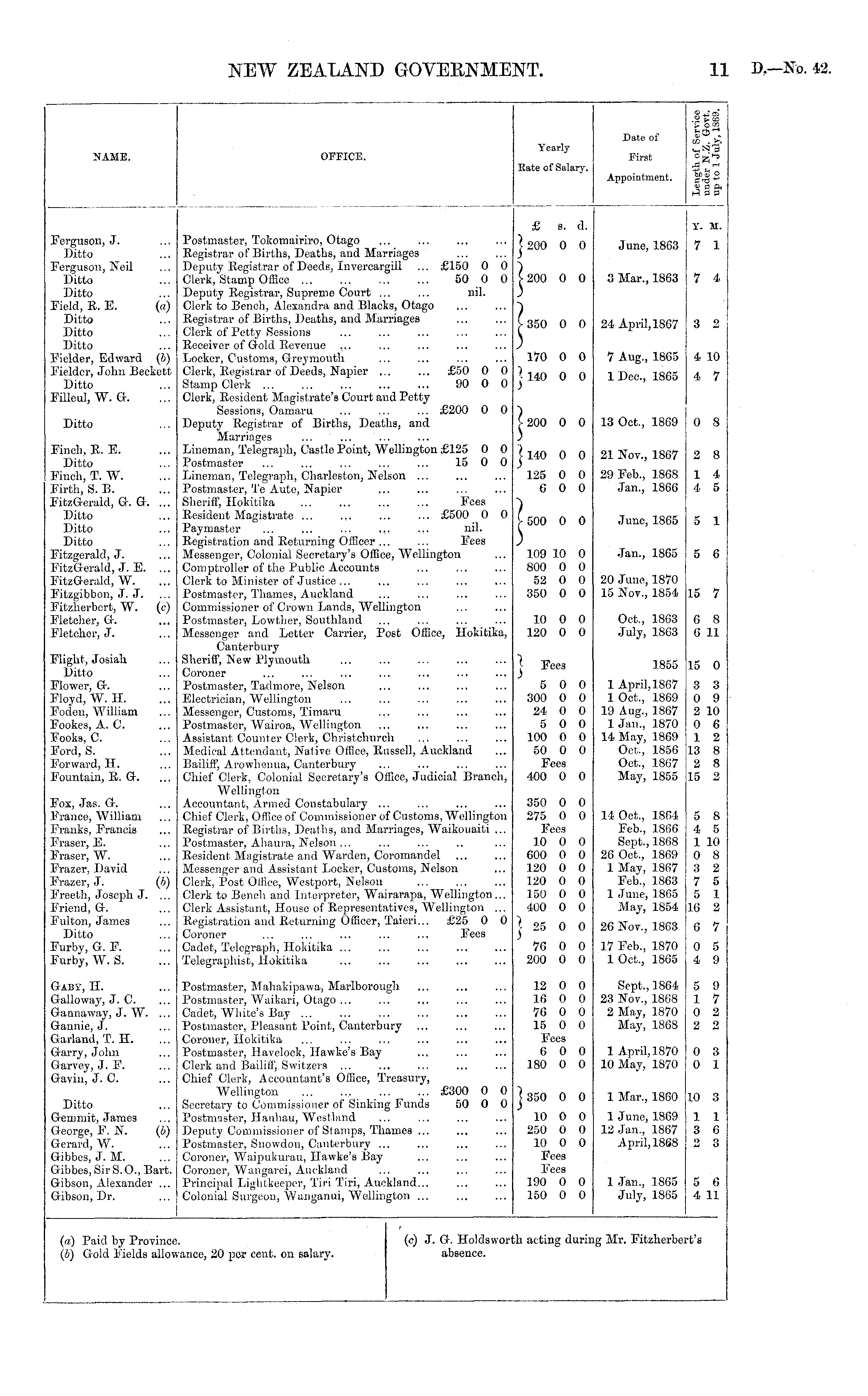 NAME. OFFICE. Yearly Date of First g*'m" P o<» 8c51 .3 -< tea! o « 3 3. Hi 3 3 Kate of Salary. Appointment. Ferguson, J. Ditto Ferguson, Neil Ditto Ditto Field, R. E. (a) Ditto Ditto Ditto Fielder, Edward (b) Fielder, John Beckett Ditto Filleul, W. G. Postmaster, Tokomairiro, Otago Registrar of Births, Deaths, and Marriages Deputy Registrar of Deeds, Invercargill ... £150 0 0 Clerk, Stamp Office 50 0 0 Deputy Registrar, Supreme Court ... ... nil. Clerk to Bench, Alexandra and Blacks, Otago Registrar of Births, Deaths, and Marriages Clerk of Petty Sessions Receiver of Gold Revenue Locker, Customs, Greymouth Clerk, Registrar of Deeds, Napier ... ... £50 0 0 Stamp Clerk 90 0 0 Clerk, Resident Magistrate's Court and Petty Sessions, Oamaru ... ... ... £200 0 0 Deputy Registrar of Births, Deaths, and Marriages Lineman, Telegraph, Castle Point, Wellington £125 0 0 Postmaster ... ... ... ... ... 15 0 0 Lineman, Telegraph, Charleston, Nelson Postmaster, Te Aute, Napier Sheriff, Hokitika ... ... Fees Resident Magistrate £500 0 0 Paymaster ... ... ... ... ,,, nil. Registration and Returning Officer ... ... Fees Messenger, Colonial Secretary's Office, Wellington Comptroller of the Public Accounts Clerk to Minister of Justice ... Postmaster, Thames, Auckland Commissioner of Crown Lands, Wellington Postmaster, Lowther, Southland Messenger and Letter Carrier, Post Office, Hokitika, Canterbury Sheriff, New Plymouth Coroner Postmaster, Tadmore, Nelson Electrician, Wellington Messenger, Customs, Timaru ... Postmaster, Wairoa, Wellington Assistant Counter Clerk, Christchurch Medical Attendant, Native Office, Russell, Auckland Bailiff, Arowhenua, Canterbury Chief Clerk, Colonial Secretary's Office, Judicial Branch, Wellington Accountant, Armed Constabulary ... Chief Clerk, Office of Commissioner of Customs, Wellington Registrar of Births, Deaths, and Marriages, Waikouaiti ... Postmaster, Ahaura, Nelson ... Resident Magistrate and Warden, Coromandel Messenger and Assistant Locker, Customs, Nelson Clerk, Post Office, Westport, Nelson Clerk to Bench and Interpreter, Wairarapa, Wellington... Clerk Assistant, House of Representatives, Wellington ... Registration and Returning Officer, Taieri... £25 0 0 Coroner ... ... ... ... ... Fees Cadet, Telegraph, Hokitika ... Telegraphist, Hokitika £ s. d. Y. M. 1 200 0 0 S200 0 0 i 350 0 0 June, 1863 7 1 3 Mar., 1863 7 4 24 April, 1867 3 2 170 0 0 7 Aug., 1865 4 10 I 140 0 0 1 Dec, 1865 4 7 Ditto I 200 0 0 1 140 0 0 13 Oct., 1869 0 8 Finch, R. E. Ditto Finch, T. W. Firth, S. B. FitzGerald, G. G. ... Ditto Ditto Ditto Fitzgerald, J. FitzGerald, J. E. ... FitzGerald, W. Fitzgibbon, J. J. Fitzherbert, W. (c) Fletcher, G. Fletcher, J. 125 0 0 6 0 0 [500 0 0 21 Nov., 1867 29 Feb., 1868 Jan., 1866 June, 1865 Jan., 1865 2 8 1 4 4 5 5 1 109 10 0 800 0 0 52 0 0 350 0 0 20 June, 1870 15 Nov., 1854 5 6 15 7 10 0 0 120 0 0 Oct., 1863 July, 1863 6 8 6 11 Flight, Josiah, Ditto Flower, G. Floyd, W. IT. Foden, William Fookes, A. C. Fooks, C. Ford, S. Forward, II. Fountain, R. G. J Fees 5 0 0 300 0 0 24 0 0 5 0 0 100 0 0 50 0 0 Fees 400 0 0 1855 1 April, 1867 1 Oct., 1869 19 Aug., 1867 Uan., 1870 14 May, 1869 Oct., 1856 Oct., 1867 May, 1855 15 0 3 3 0 9 2 10 0 6 1 2 13 8 2 8 15 2 Fox, Jas. G. France, William Franks, Francis Fraser, E. Eraser, W. Frazer, David Frazer, J. (b) Freeth, Joseph J. ... Friend, G-. Fulton, James Ditto Furby, G. F. Furby, W. S. 350 0 0 275 0 0 Fees 10 0 0 600 0 0 120 0 0 120 0 0 150 0 0 400 0 0 14 Oct., 1864 Feb., 1866 Sept., 1868 26 Oct., 1869 1 May, 1867 Feb., 1863 1 June, 1865 May, 1854 5 8 4 5 1 10 0 8 3 2 7 5 5 1 16 2 j 25 0 0 26 Nov., 1863 6 7 76 0 0 200 0 0 17 Feb., 1870 1 Oct., 1865 0 5 4 9 Gaby, IT. Galloway, J. C. Gaunaway, J. W. ... Gannie, J. Garland, T. H. Garry, John Garvey, J. F. Gavin, J. C. Postmaster, Mahakipawa, Marlborough Postmaster, Waikari, Otago ... Cadet, White's Bay Postmaster, Pleasant Point, Canterbury ... Coroner, Hokitika Postmaster, llavelock, Hawke's Bay Clerk and Bailiff, Switzers ... Chief Clerk, Accountant's Office, Treasury, Wellington £300 0 0 Secretary to Commissioner of Sinking Funds 50 0 0 Postmaster, Hauhau, Westland Deputy Commissioner of Stamps, Thames ... Postmaster, Snowdon, Canterbury ... Coroner, Waipukurau, Hawke's Bay Coroner, Wangarei, Auckland Principal Lightkeeper, Tiri Tiri, Auckland... Colonial Surgeon, Wanganui, Wellington ... 12 0 0 16 0 0 76 0 0 15 0 0 Fees 6 0 0 180 0 0 Sept., 1864 23 Nov., 1868 2 May, 1870 May, 1868 5 9 1 7 0 2 2 2 1 April, 1870 10 May, 1870 0 3 0 1 Ditto Gemmit, James .... George, F. N. (b) Gerard, W. Gibbcs, J. M. Gibbes, Sir S.O., Bart. Gibson, Alexander ... Gibson, Dr. ] 350 0 0 1 Mar., 1860 10 3 10 0 0 250 0 0 10 0 0 Fees Fees 190 O 0 150 0 0 1 June, 1869 12 Jan., 1867 April, 1868 1 1 3 6 2 3 1 Jan., 1865 July, 1865 5 6 4 11 (a) Paid by Provinci (b) Gold Fields alio' (c) J. G. Holdswon absence. ;h acting durii ig Mr. Fitzherbe: rt's ranee, 20 per cent, on salary.