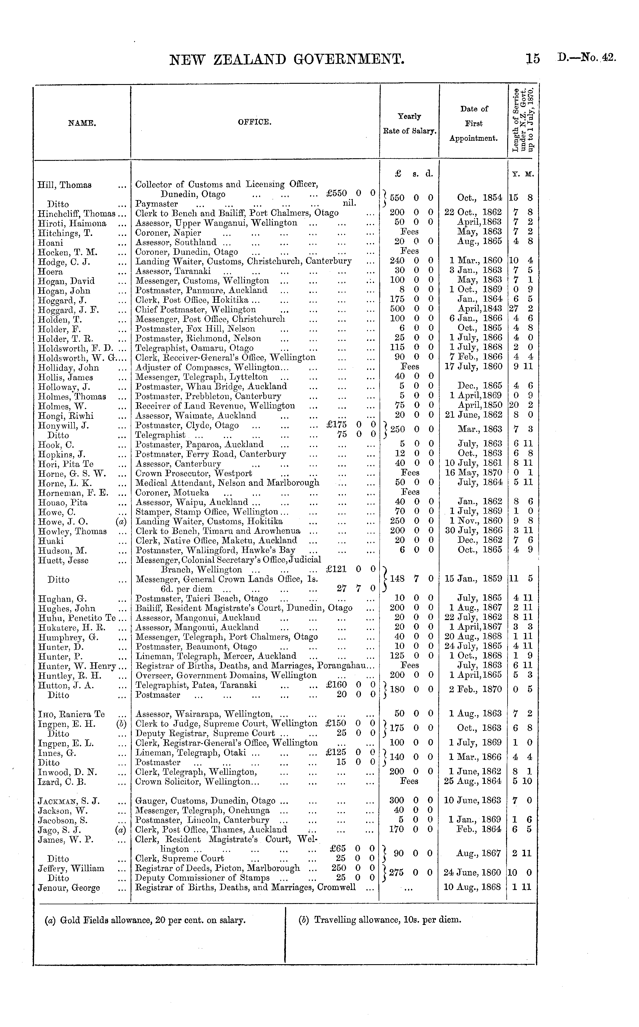 OFFICE. Yearly Date of First Mi S O CO ■"'S 3 tcC 0> 3 o> 3 3. 1-13 3 NAME. Rate of Salary. Appointment. £ s. d. Y. M. Hill/Thomas Ditto Hinchcliff, Thomas ... Hiroti, Haimona Hitchings, T. Hoani Hocken, T. M. Hodge, C. J. Hoera Hogan, David Hogan, John Hoggard, J. Hoggard, J. F. Holdeu, T. Holder, F. Holder, T. R. Holdsworth, F. D. ... Holds-worth, W. G.... Holliday, John Hollis, James Holloway, J. Holmes, Thomas Holmes, W. Hongi, Riwhi Honywill, J. Ditto Hook, C. Hopkins, J. Hori, Pita Te Home, G. S. W. ... Home, L. K. Horneman, F. E. Houao, Pita Howe, C. Howe, J. O. (a) Howley, Thomas Huaki Hudson, M. Huett, Jesse Collector of Customs and Licensing Officer, Dunedin, Otago ... £550 0 0 Paymaster ... ... ... ... ... nil. Clerk to Bench and Bailiff, Port Chalmers, Otago Assessor, Upper Wanganui, Wellington Coroner, Napier Assessor, Southland ... Coroner, Dunedin, Otago Landing Waiter, Customs, Christchurch, Canterbury Assessor, Taranaki Messenger, Customs, Wellington ... ... ... .:. Postmaster, Panmure, Auckland Clerk, Post Office, Hokitika Chief Postmaster, Wellington Messenger, Post Office, Christchurch Postmaster, Fox Hill, Nelson Postmaster, Richmond, Nelson Telegraphist, Oamaru, Otago Clerk, Receiver-General's Office, Wellington Adjuster of Compasses, Wellington... Messenger, Telegraph, Lyttelton Postmaster, Whau Bridge, Auckland Postmaster, Prebbleton, Canterbury Receiver of Land Revenue, Wellington Assessor, Waiinate, Auckland Postmaster, Clyde, Otago ... ... ... £175 0 0 Telegraphist 75 0 0 Postmaster, Paparoa, Auckland Postmaster, Ferry Road, Canterbury Assessor, Canterbury Crown Prosecutor, Westport Medical Attendant, Nelson and Marlborough Coroner, Motueka Assessor, Waipu, Auckland ... Stamper, Stamp Office, Wellington ... Landing Waiter, Customs, Hokitika Clerk to Bench, Timaru and Arowhenua ... Clerk, Native Office, Maketu, Auckland Postmaster, WaUingford, Hawke's Bay Messenger, Colonial Secretary's Office, Judicial Branch, Wellington £121 0 0 Messenger, General Crown Lands Office, Is. 6d. per diem 27 7 0 Postmaster, Taieri Beach, Otago Bailiff, Resident Magistrate's Court, Dunedin, Otago Assessor, Mangonui, Auckland Assessor, Mangonui, Auckland Messenger, Telegraph, Port Chalmers, Otago Postmaster, Beaumont, Otago Lineman, Telegraph, Mercer, Auckland Registrar of Births, Deaths, and Marriages, Porangahau... Overseer, Government Domains, Wellington Telegraphist, Patea, Taranaki £160 0 0 Postmaster 20 0 0 | 550 0 0 200 0 0 50 0 0 Fees 20 0 0 Fees 240 0 0 30 0 0 100 0 0 8 0 0 175 0 0 500 0 0 100 0 0 6 0 0 25 O 0 115 O 0 90 0 0 Fees 40 0 O 5 0 0 5 0 0 75 0 0 20 0 0 ] 250 0 0 5 0 0 12 0 0 40 0 0 Fees 50 0 0 Fees 40 O 0 70 0 0 250 0 0 200 0 0 20 0 0 6 0 0 Oct., 1854 22 Oct., 1862 April, 1863 May, 1863 Aug., 1865 1 Mar., 1860 3 Jan., 1863 May, 1863 1 Oct., 1869 Jan., 1864 April, 1843 6 Jan., 1866 Oct., 1865 1 July, 1866 1 July, 1868 7 Feb., 1866 17 July, 1860 Dec, 1865 1 April, 1869 April, 1850 21 June, 1862 Mar., 1863 July, 1863 Oct., 1863 10 July, 1861 16 May, 1870 July, 1864 15 8 7 8 7 2 7 2 4 8 10 4 7 5 7 1 0 9 6 5 27 2 4 6 4 8 4 0 2 0 4 4 9 11 4 6 0 9 20 2 8 0 7 3 6 11 6 8 8 11 0 1 5 11 Jan., 1862 1 July, 1869 1 Nov., 1860 30 July, 1866 Dec, 1862 Oct., 1865 8 6 1 0 9 8 3 11 7 6 4 9 Ditto 1 148 7 0 15 Jan., 1859 11 5 Hughan, G. Hughes, John Huhu, Penetito Tc ... Hukatere, H. R. Humphrey, G. Hunter, D. Hunter, P. Hunter, W. Henry... Huntley, R. II. Hutton, J. A. Ditto 10 0 0 200 0 0 20 0 0 20 0 0 40 0 0 10 0 0 125 0 0 Fees 200 0 0 July, 1865 1 Aug., 1867 22 July, 1862 1 April, 1867 20 Aug., 1868 24 July, 1865 1 Oct., 1868 July, 1863 1 April, 1865 4 11 2 11 8 11 3 3 1 11 4 11 1 9 6 11 5 3 ]l80 0 0 2 Feb., 1870 0 5 Iho, Raniera Te Ingpen, E. H. (b) Ditto Assessor, Wairarapa, Wellington, ... Clerk to Judge, Supremo Court, Wellington £150 0 0 Deputy Registrar, Supreme Court ... ... 25 0 0 Clerk, Registrar-General's Office, Wellington Lineman, Telegraph, Otaki ... ... ... £125 0 0 Postmaster ... ... ... ... ... 15 0 0 Clerk, Telegraph, Wellington, Crown Solicitor, Wellington... 50 0 0 1 Aug., 1863 7 2 | 175 0 0 Oct., 1863 6 8 Ingpen, E. L. Lines, G. Ditto Inwood, D. N. Izard, OB. 100 0 0 Uuly, 1869 1 0 | 140 0 0 1 Mar., 1866 4 4 200 0 0 Fees 1 June, 1862 25 Aug., 1864 8 1 5 10 Jaokman, S. J. Jackson, W. Jacobson, S. Jago, S. J. (a) James, W. P. Gauger, Customs, Dunedin, Otago ... Messenger, Telegraph, Onehunga Postmaster, Lincoln, Canterbury Clerk, Post Office, Thames, Auckland Clerk, Resident Magistrate's Court, Wellington £65 0 0 Clerk, Supreme Court 25 0 0 Registrar of Deeds, Picton, Marlborough ... 250 0 0 Deputy Commissioner of Stamps ... ... 25 0 0 Registrar of Births, Deaths, and Marriages, Cromwell ... 300 0 0 40 0 0 5 0 0 170 0 0 10 June, 1863 7 0 1 Jan., 1869 Feb., 1864 1 6 6 5 Ditto Jeffery, William Ditto j 90 0 0 ] 275 0 0 Aug., 1867 2 11 24 June, 1860 10 0 Jenour, George 10 Aug., 1868 1 11 (a) Gold Fields alb" rance, 20 per cent, on salary. (6) Travelling alio 'ance, 10s. per diem.