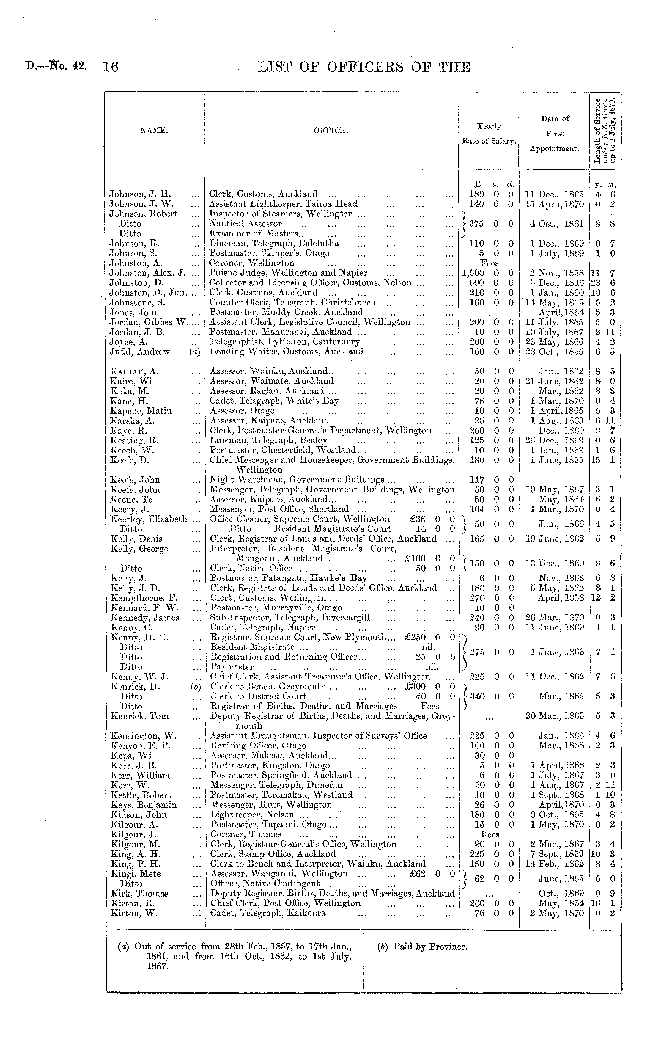 NAME. OFFICE. Yearly Date of First .sis. 8 a 1"!, GO . i^ ■&8o eg fl 3. Rate of Salary. Appointment. Johnson, J. H. Johnson, J. W. Johnson, Eobert Ditto Ditto Johnson, R. Johnson, S. Johnston, A. Johnston, Alex. J. ... Johnston, D. Johnston, D., Jun. ... Johnstone, S. Jones, John Jordan, Gibbes W. ... Jordan, J. B. Joyce, A. Judd, Andrew (a) Clerk, Customs, Auckland ... Assistant Lightkeeper, Tairoa Head Inspector of Steamers, Wellington ... Nautical Assessor Examiner of Masters... Lineman, Telegraph, Balclutha Postmaster, Skipper's, Otago Coroner, Wellington Puisne Judge, Wellington and Napier Collector and Licensing Officer, Customs, Nelson ... Clerk, Customs, Auckland Counter Clerk, Telegraph, Christchurch Postmaster, Muddy Creek, Auckland Assistant Clerk, Legislative Council, Wellington ... Postmaster, Mahurangi, Auckland ... Telegraphist, Lyttelton, Canterbury Landing Waiter, Customs, Auckland £ s. d. 180 0 0 140 0 0 1 375 0 0 110 0 0 5 0 0 Fees 1,500 0 0 500 0 0 210 0 0 160 0 0 11 Dec, 1865 15 April, 1870 4 Oct., 1861 1 Dec, 1869 1 July, 1869 2 Nov., 1858 5 Dec, 1846 1 Jan., I860 14 May, 1865 April, 1S64 11 July, 1865 10 July, 1867 23 May, 1866 22 Oct., 1855 Y. M. 4 6 0 2 8 8 0 7 1 0 11 7 23 6 10 6 5 2 5 3 5 0 2 11 4 2 6 5 200 0 0 10 0 0 200 0 0 160 0 0 Kaiiiatj, A. Kaire, Wi Kaka, M. Kane, H. Kapene, Matiu Karaka, A. Kaye, R. Keating, R. Keech, W. Keefe, D. Assessor, Waiuku, Auckland... Assessor, Waimate, Auckland Assessor, Raglan, Auckland ... Cadet, Telegraph, White's Bay Assessor, Otago Assessor, Kaipara, Auckland Clerk, Postmaster-General's Department, Wellington Lineman, Telegraph, Bealey Postmaster, Chesterfield, Westland... Chief Messenger and Housekeeper, Government Buildings, Wellington Night Watchman, Government Buildings ... Messenger, Telegraph, Government Buildings, Wellington Assessor, Kaipara, Auckland... Messenger, Post Office, Shortland ... Office Cleaner, Supreme Court, Wellington £36 0 0 Ditto Resident Magistrate's Court 14 0 0 Clerk, Registrar of Lands and Deeds' Office, Auckland ... Interpreter, Resident Magistrate's Court, Mongonui, Auckland £100 0 0 Clerk, Native Office 50 0 0 Postmaster, Patangata, Hawke's Bay Clerk, Registrar of Lands and Deeds' Office, Auckland ... Clerk, Customs, Wellington ... Postmaster, Murrayyille, Otago Sub-Inspector, Telegraph, Invercargill Cadet, Telegraph, Napier ... Registrar, Supreme Court, New Plymouth... £250 0 0 Resident Magistrate ... ... ... ... nil. Registration and Returning Officer... ... 25 0 0 Paymaster ... ... ... ... ... nil. Chief Clerk, Assistant Treasurer's Office, Wellington Clerk to Bench, Greymouth £300 0 0 Clerk to District Court 40 0 0 Registrar of Births, Deaths, and Marriages Fees Deputy Registrar of Births, Deaths, and Marriages, Greymouth Assistant Draughtsman, Inspector of Surveys' Office Revising Officer, Otago Assessor, Maketu, Auckland... Postmaster, Kingston, Otago Postmaster, Springfield, Auckland ... Messenger, Telegraph, Dunedin Postmaster, Teremakau, Westland ... Messenger, Hutt, Wellington Lightkeeper, Nelson ... ...' Postmaster, Tapanui, Otago... Coroner, Thames Clerk, Registrar-General's Office, Wellington Clerk, Stamp Office, Auckland Clerk to Bench and Interpreter, Waiuku, Auckland Assessor, Wanganui, Wellington ... ... £62 0 0 Officer, Native Contingent ... Deputy Registrar, Births, Deaths, and Marriages, Auckland Chief Clerk, Post Office, Wellington Cadet, Telegraph, Kaikoura 50 0 0 20 0 0 20 0 0 70 0 0 10 0 0 25 0 0 250 0 0 125 0 0 10 0 0 180 0 0 Jan., 1802 21 June, 1862 Mar., 1862 1 Mar., 1870 1 April, 1865 1 Aug., 1863 Dec, 1860 20 Dec, 1869 1 Jan., 1869 1 June, 1855 8 5 8 0 8 3 0 4 5 3 6 11 9 7 0 6 1 6 15 1 Keofe, John Keefe, John Keene, Te Keery, J. Keetley, Elizabeth ... Ditto Kelly, Denis Kelly, George 117 o o 50 0 0 50 0 0 104 0 0 10 May, 1867 May, 1864 1 Mar., 1870 3 1 6 2 0 4 | 50 0 0 Jan., 1866 4 5 165 0 0 19 June, 1862 5 9 Ditto Kelly, J. Kelly, J. D. Kempthorne, F. Kennard, F. W. ... Kennedy, James Kenny, C. Kenny, H. E. Ditto Ditto Ditto Kenny, W. J. Kcnrick, H. (b) Ditto Ditto Kenrick, Tom | 150 0 0 13 Dec, 1860 9 0 6 0 0 180 0 0 270 0 0 10 0 0 240 0 0 90 0 0 Nov., 1863 5 May, 1862 April, 1858 6 8 8 1 12 2 26 Mar., 1870 11 June, 1869 0 3 1 1 ) V 275 0 0 1 June, 1863 7 1 225 0 0 11 Dec, 1862 7 0 [ 340 0 0 Mar., 1865 5 3 30 Mar., 1865 5 3 Kensington, W. Kenyon, E. P. Kepa, Wi Kerr, J. B. Kerr, William Kerr, W. Kettle, Robert Keys, Benjamin Kidson, John Kilgour, A. Kilgour, J. Kilgour, M. King, A. H. King, P. H. Kingi, Mete Ditto Kirk, Thomas Kirton, R. Kirton, W. 225 0 0 100 0 0 30 0 0 5 0 0 6 0 0 50 0 0 10 0 0 26 0 0 180 0 0 15 0 0 Fees 90 0 0 225 0 0 150 0 0 Jan., 1866 Mar., 1868 4 6 2 3 1 April, 1868 1 July, 1867 1 Aug., 1867 1 Sept., 1868 April, 1870 9 Oct., 1865 1 May, 1870 2 3 3 0 2 11 1 10 0 3 4 8 0 2 2 Mar., 1867 7 Sept., 1859 14 Feb., 1S62 3 4 10 3 8 4 | 62 0 0 June, 1865 5 0 260 0 0 76 0 0 Oct., 1869 May, 1854 2 May, 1870 0 9 16 1 0 2 (a) Out of service i 1861, and fri 1867. rom 28th Feb., 1857, to 17th Jan., an 16th Oct., 1862, to 1st July, (S) Paid by Provim te.